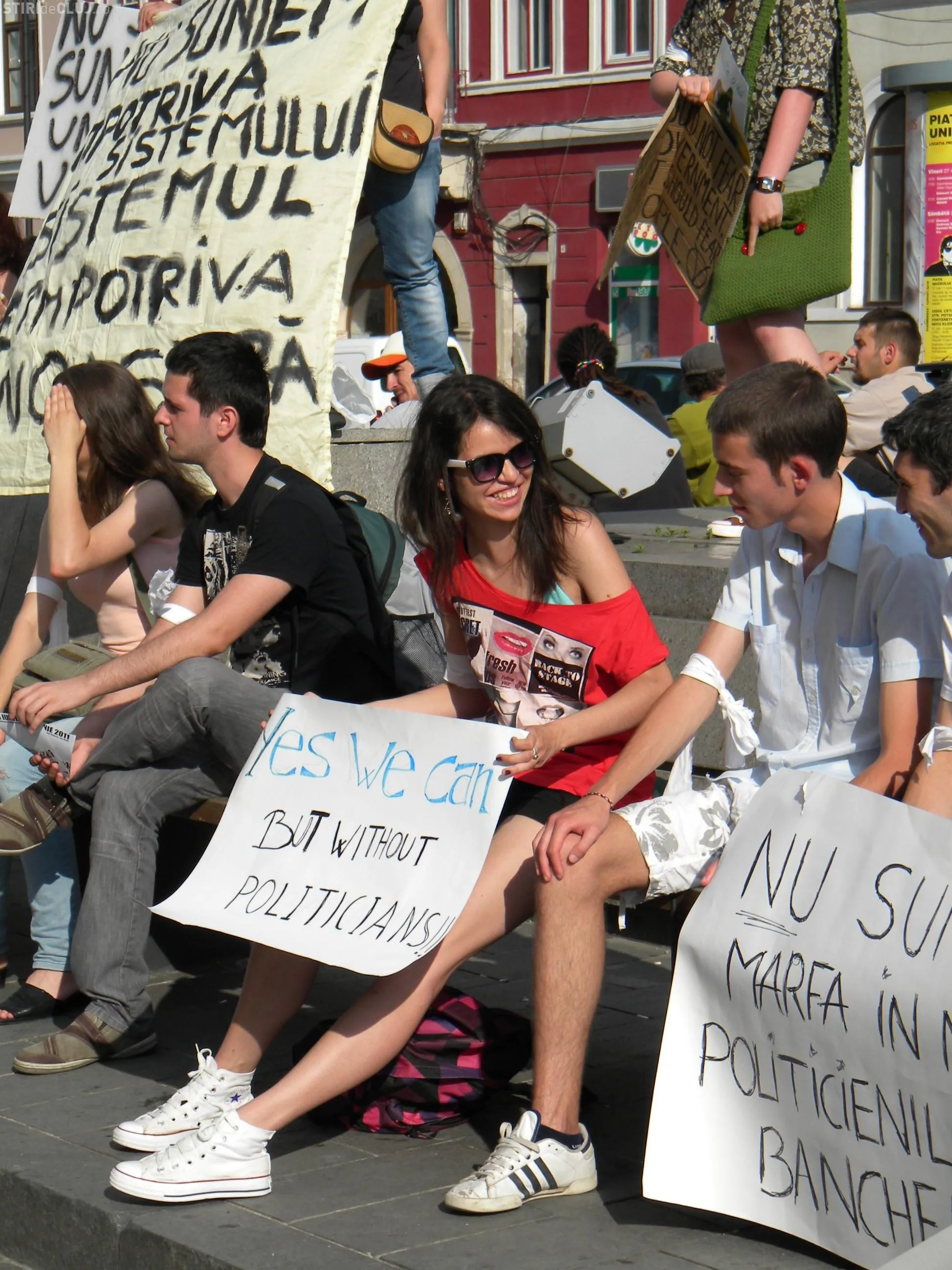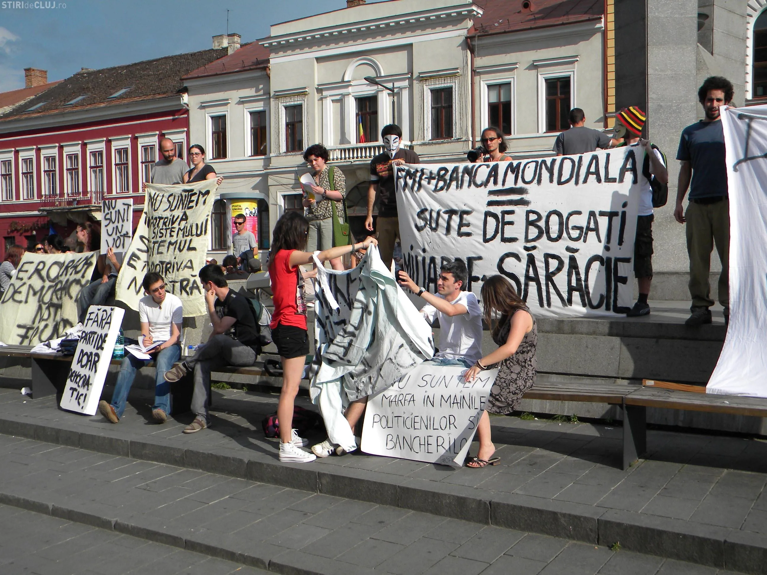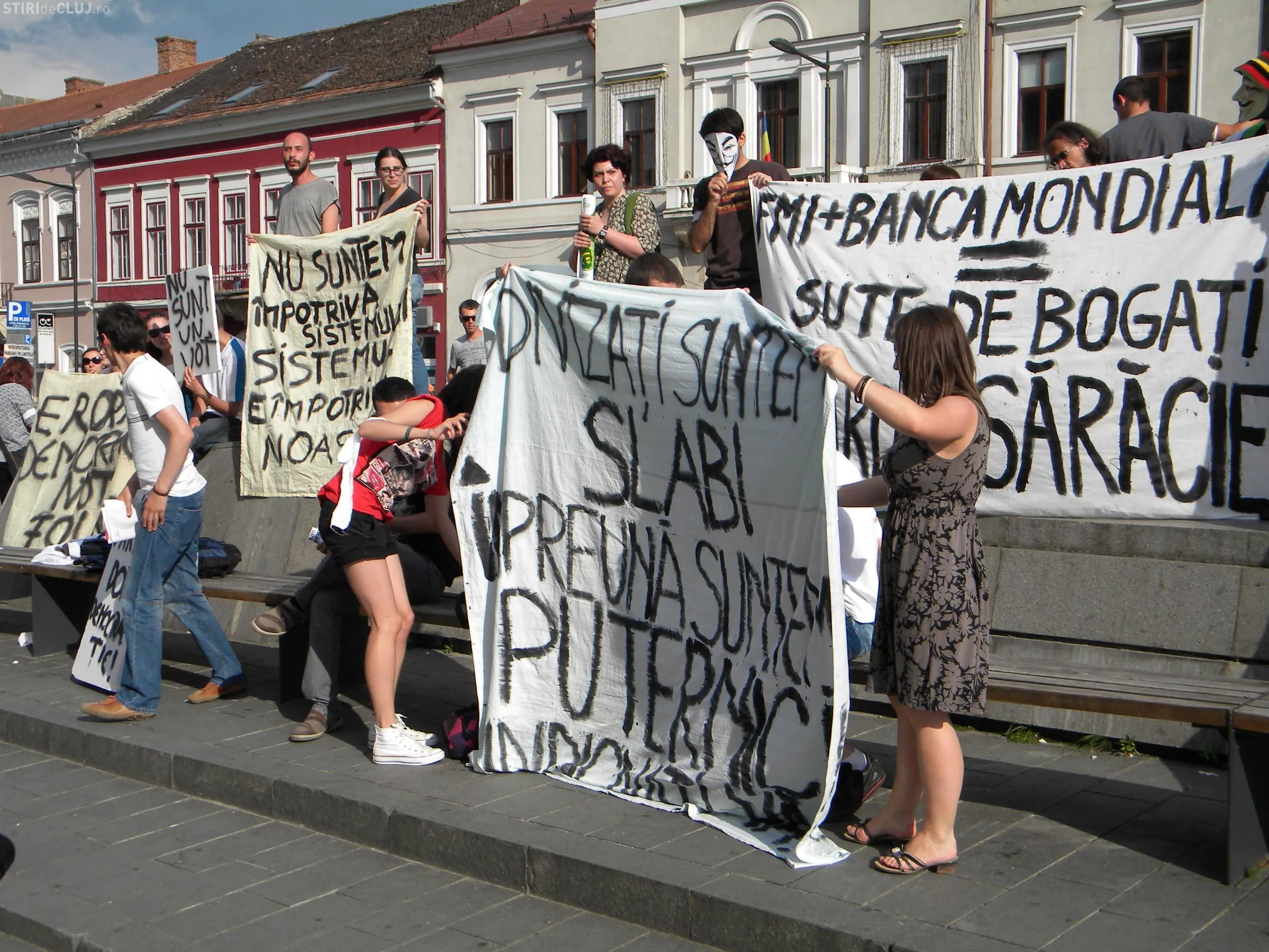 Protestul a fost organizat la statuia Memorandistilor, pe Bulevardul Eroilor. Tinerii au adus cu ei pancarte pe care au scris: "FMI+Banca Mondiala= Sute de bogati, milioane de saraci", "Divizati suntem slabi, impreuna suntem puternici", "Nu suntem impotriva sistemului, sistemul e impotriva noastra", "Nu sunt un vot", "Un vot la 4 ani, iluzia democratiei", "Nu suntem marfa in mainile politicienilor si bancherilor".