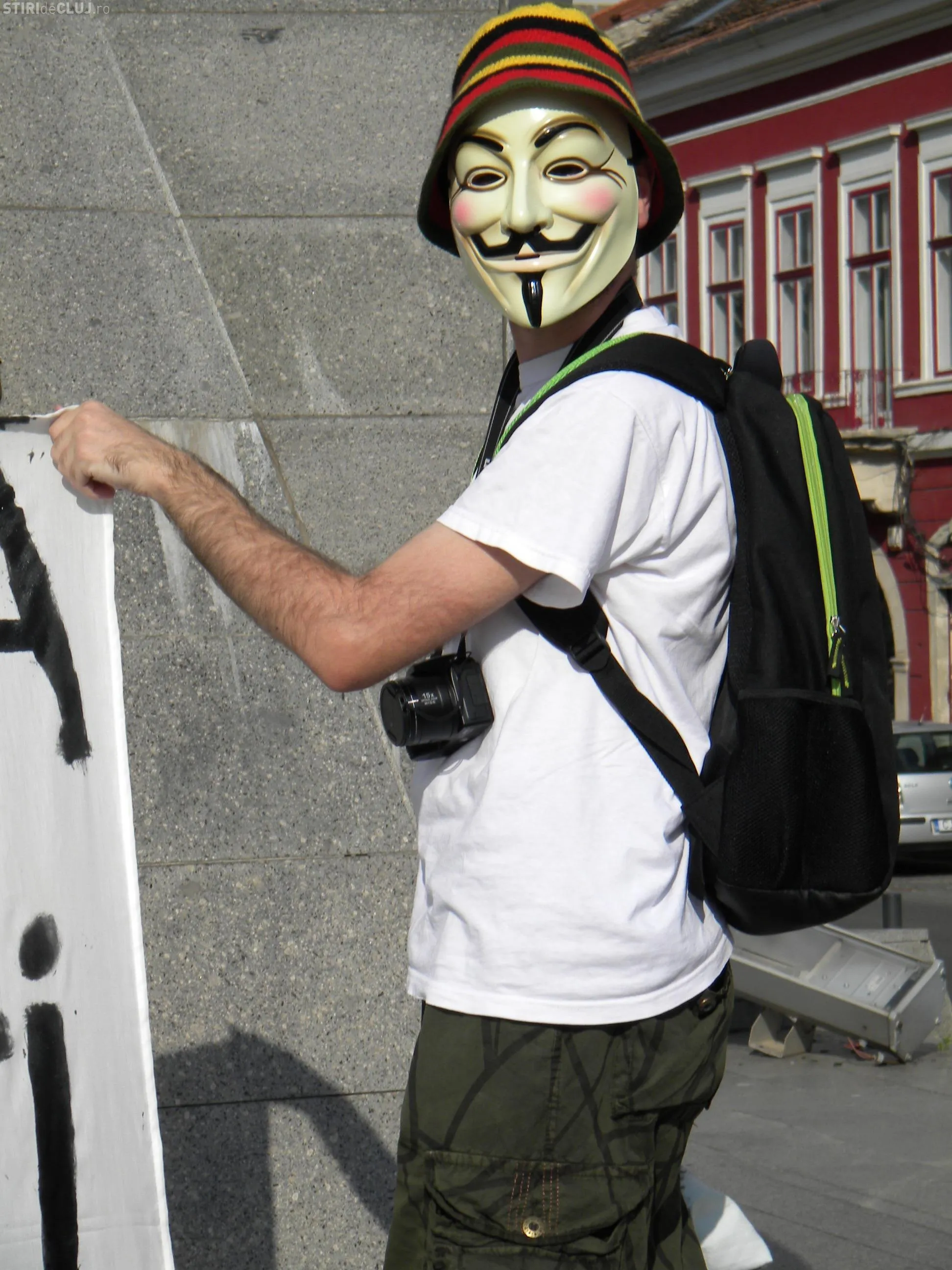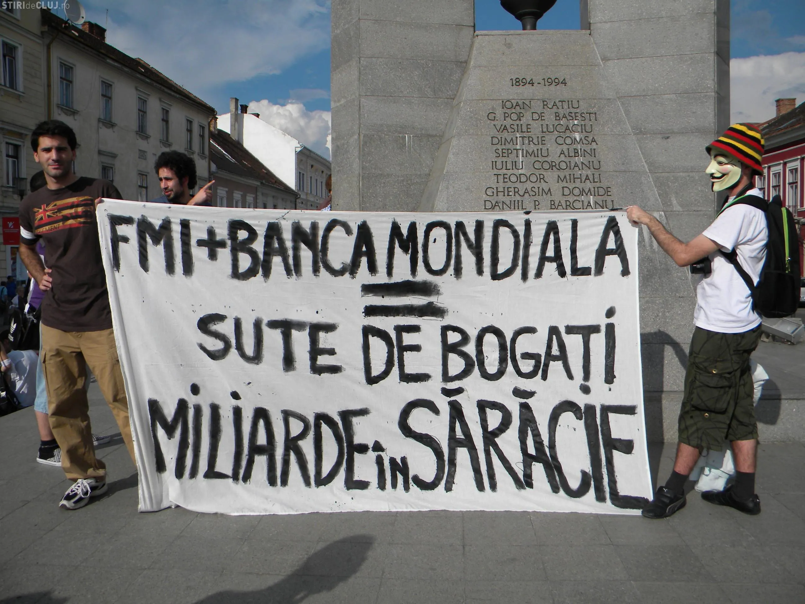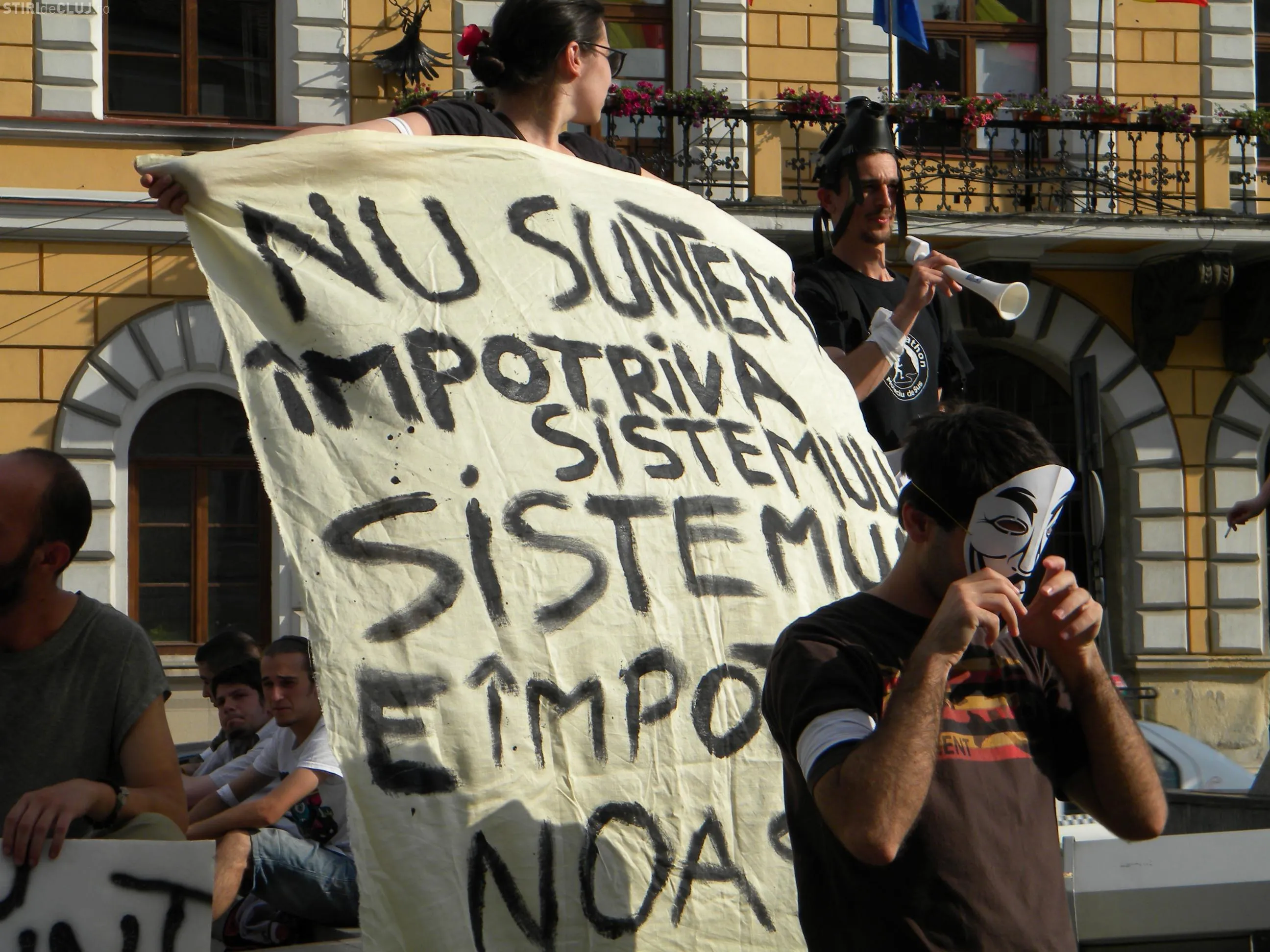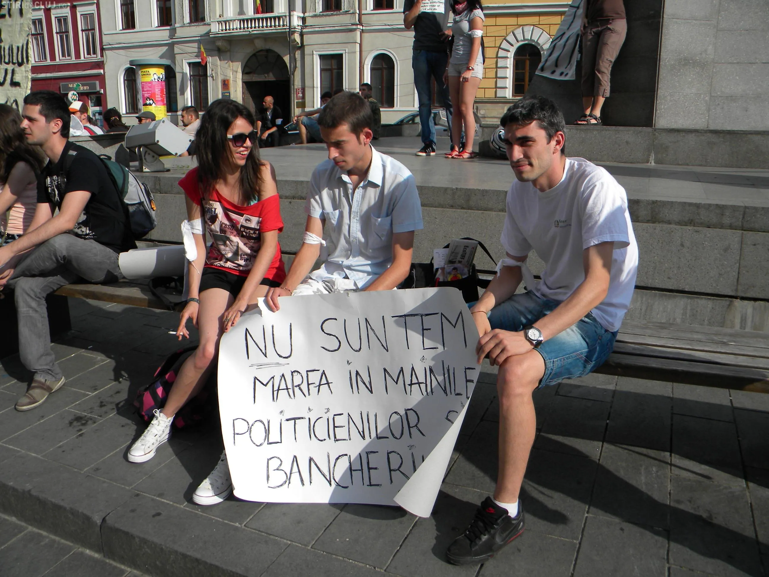 Protestul a fost organizat la statuia Memorandistilor, pe Bulevardul Eroilor. Tinerii au adus cu ei pancarte pe care au scris: "FMI+Banca Mondiala= Sute de bogati, milioane de saraci", "Divizati suntem slabi, impreuna suntem puternici", "Nu suntem impotriva sistemului, sistemul e impotriva noastra", "Nu sunt un vot", "Un vot la 4 ani, iluzia democratiei", "Nu suntem marfa in mainile politicienilor si bancherilor".