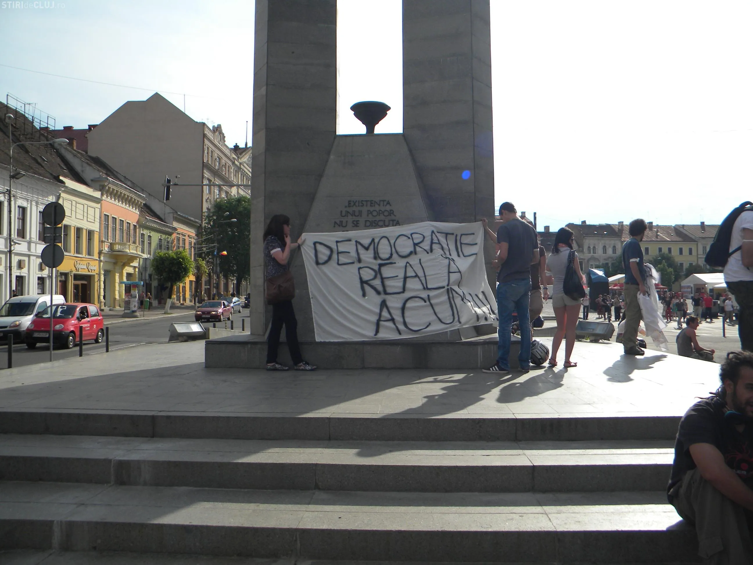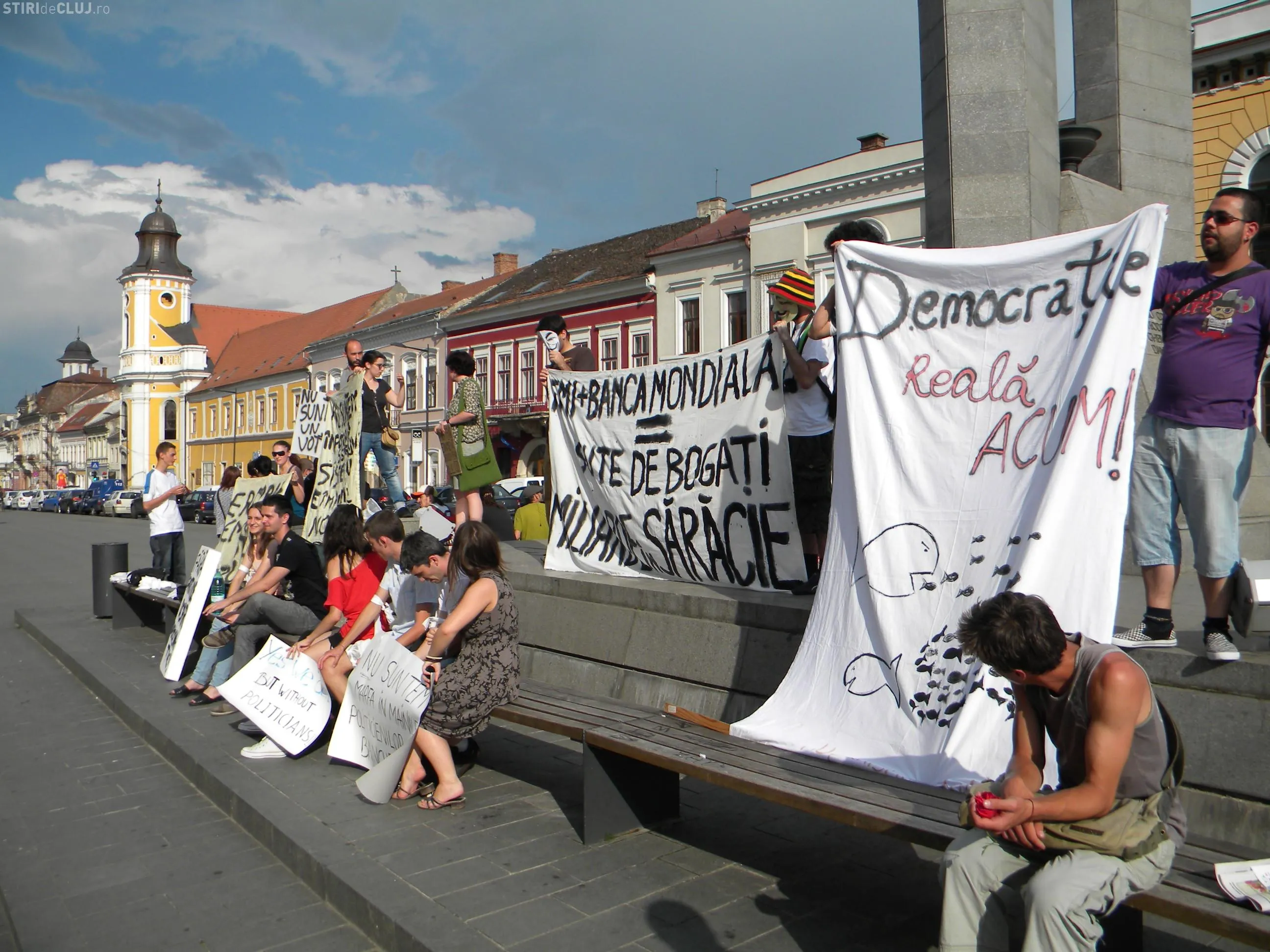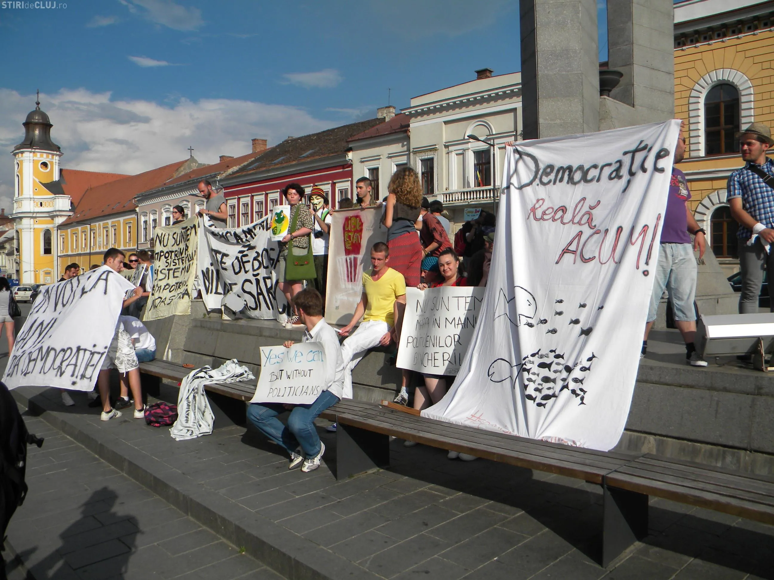 Peste 100 de tineri au participat de la ora 18.00 la miscarea "Democratia Reala Acum", un protest care vizeaza modul in care inteleg politicienii sa aplice democratie. Tinerii au adus cu ei pancarte pe care au scris mesaje de protest.