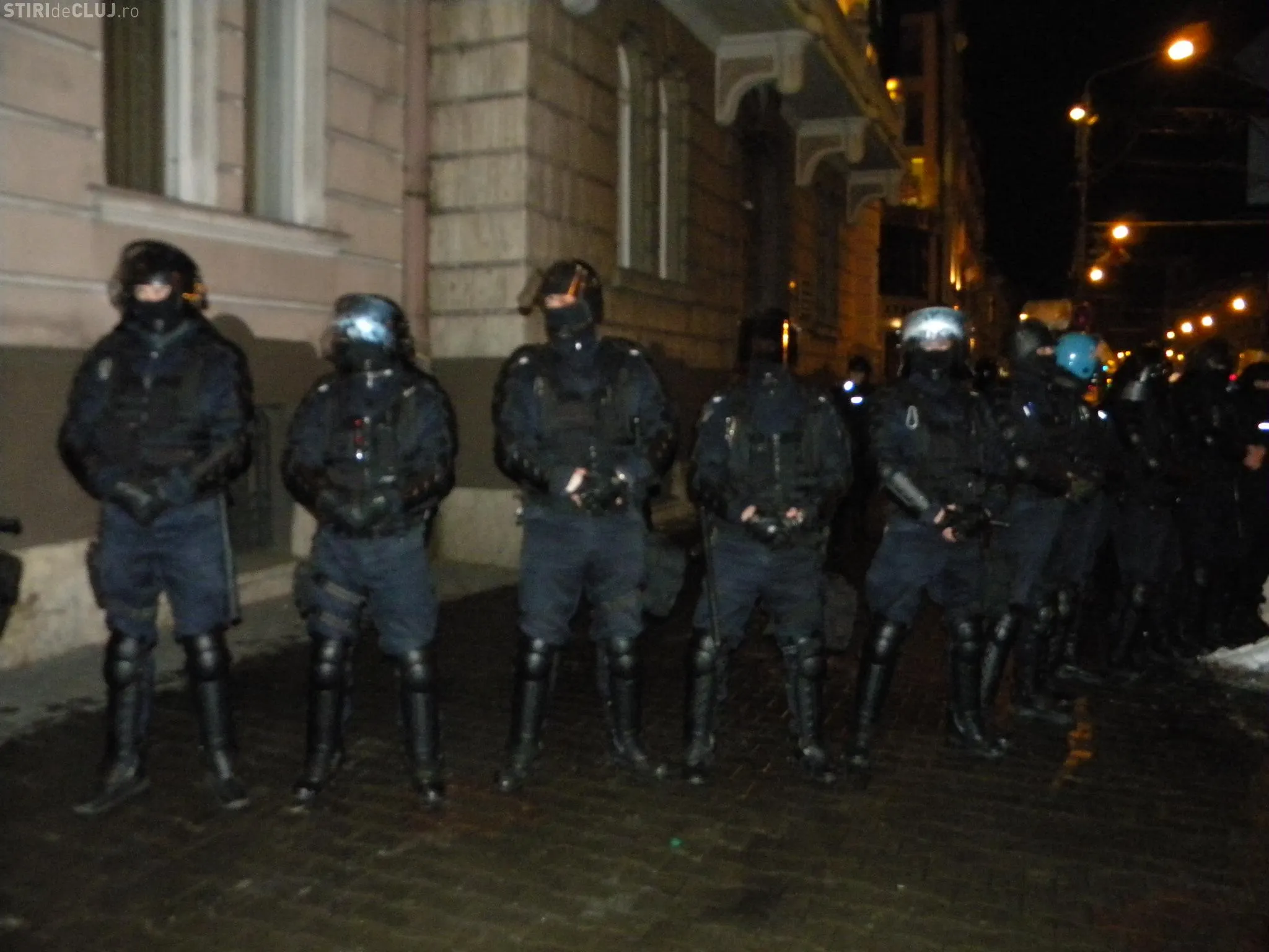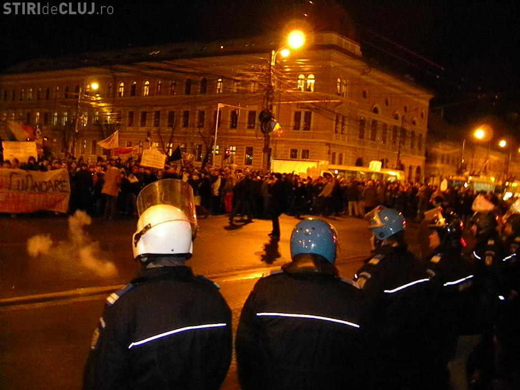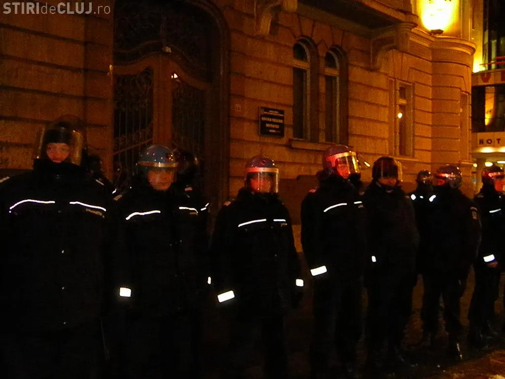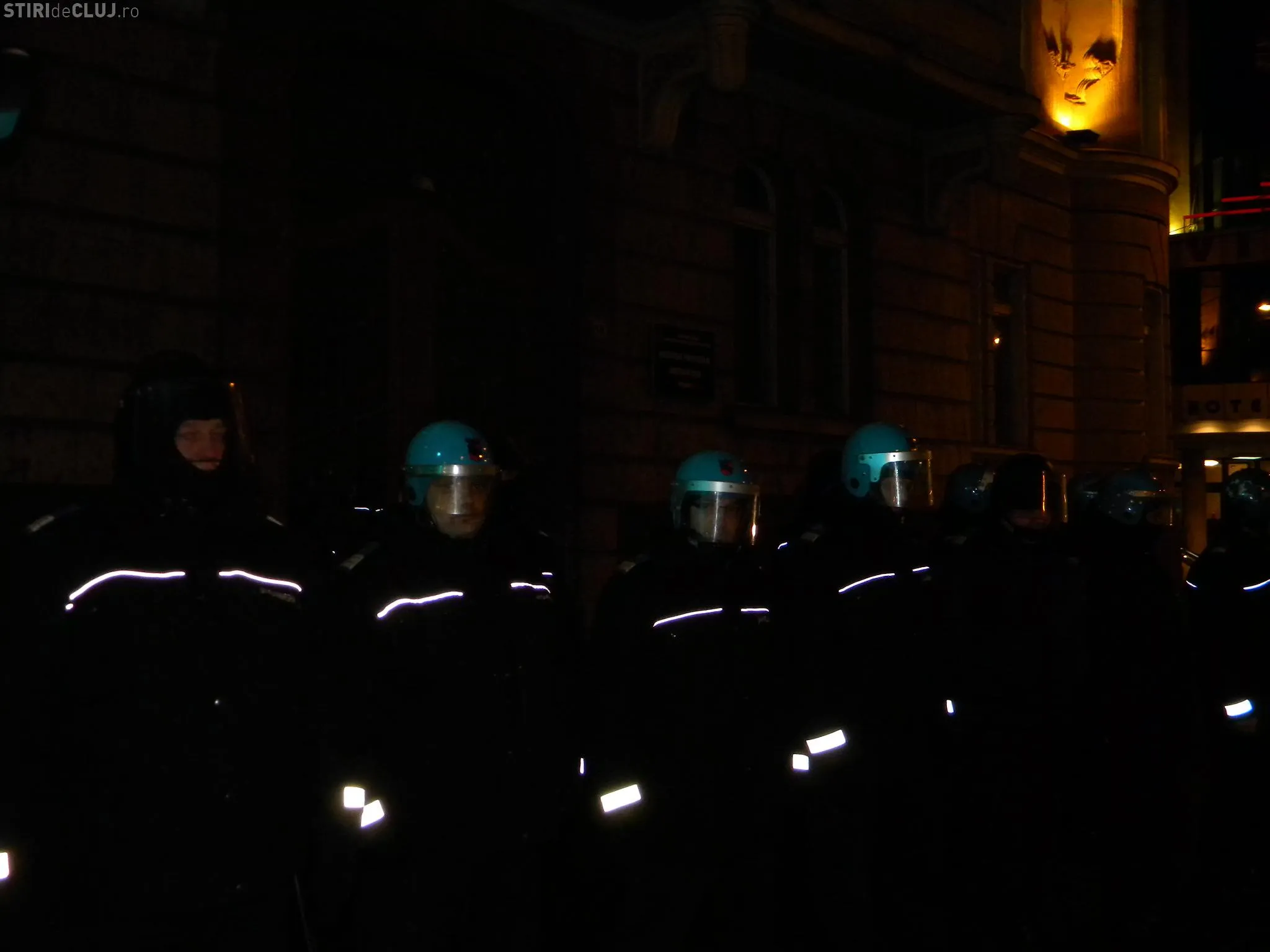 Cateva petarde au fost aruncate din randul manifestantilor spre jandarmii postati in fata Prefecturii Cluj. Autoritatile sustin ca i-au "filat" pe autori si ca acestia provin din randul suporterilor U Cluj.