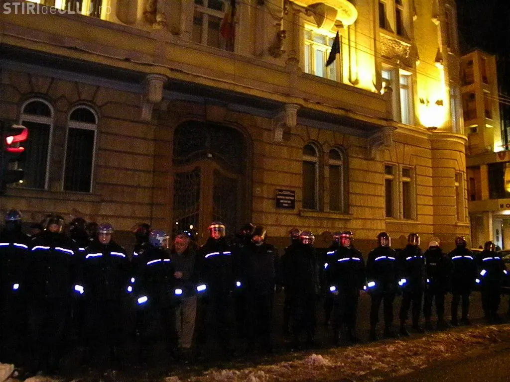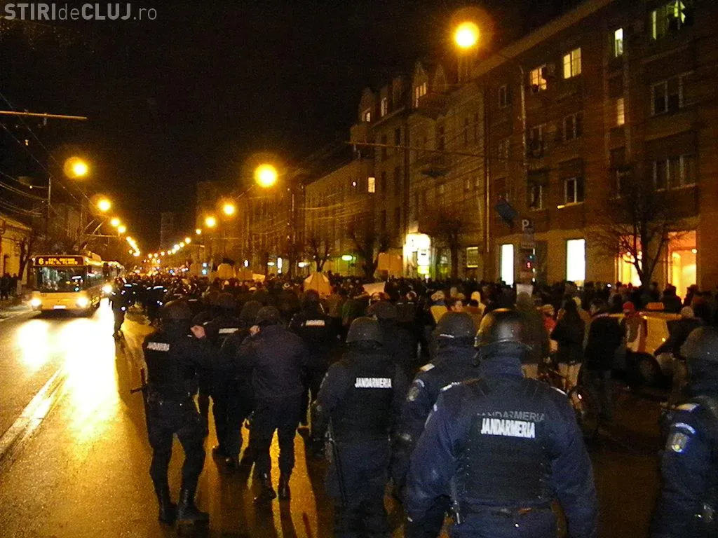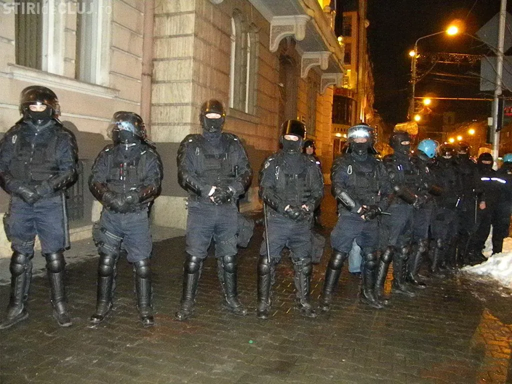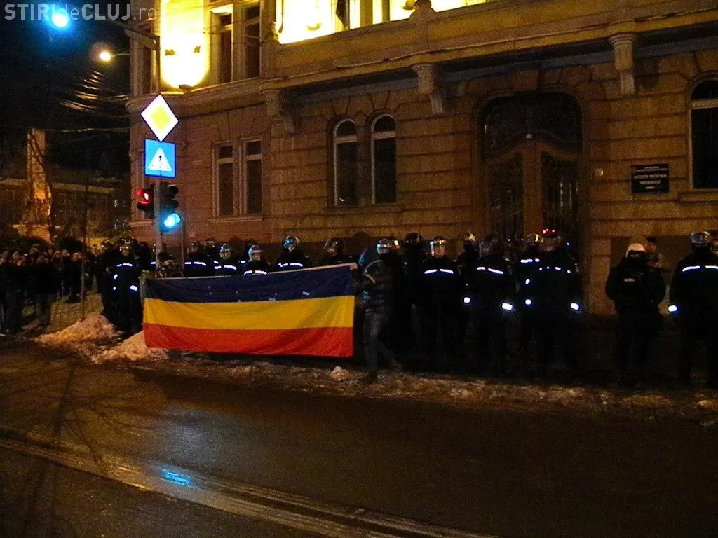 Cateva petarde au fost aruncate din randul manifestantilor spre jandarmii postati in fata Prefecturii Cluj. Autoritatile sustin ca i-au "filat" pe autori si ca acestia provin din randul suporterilor U Cluj.