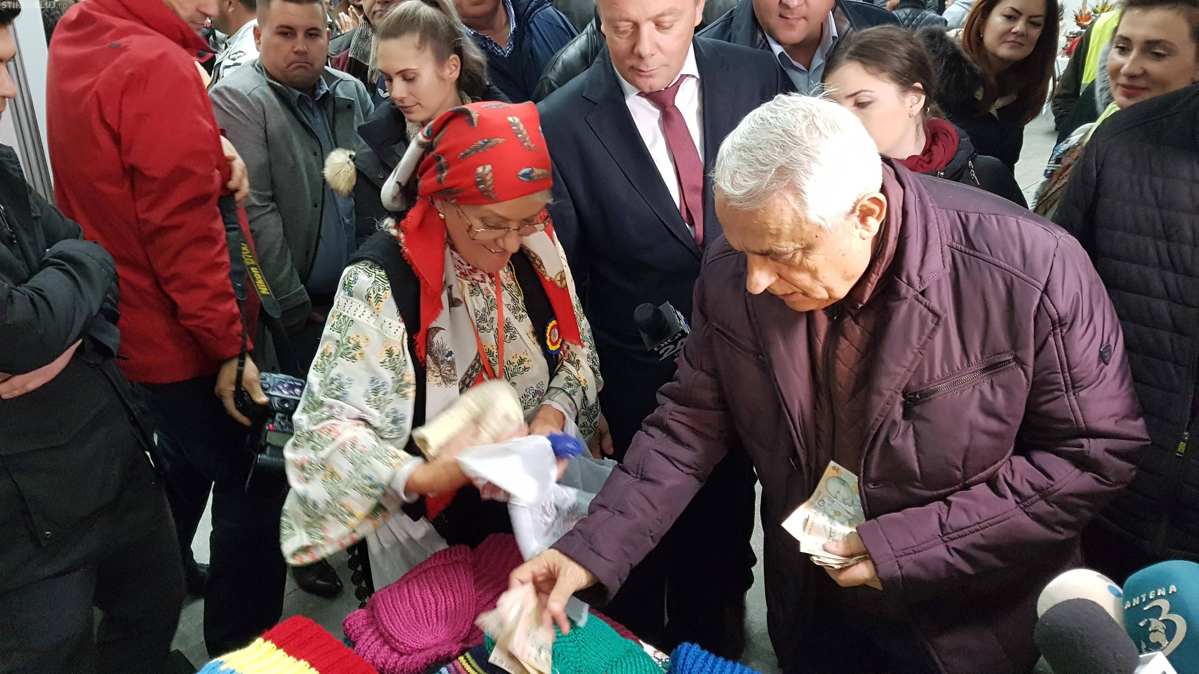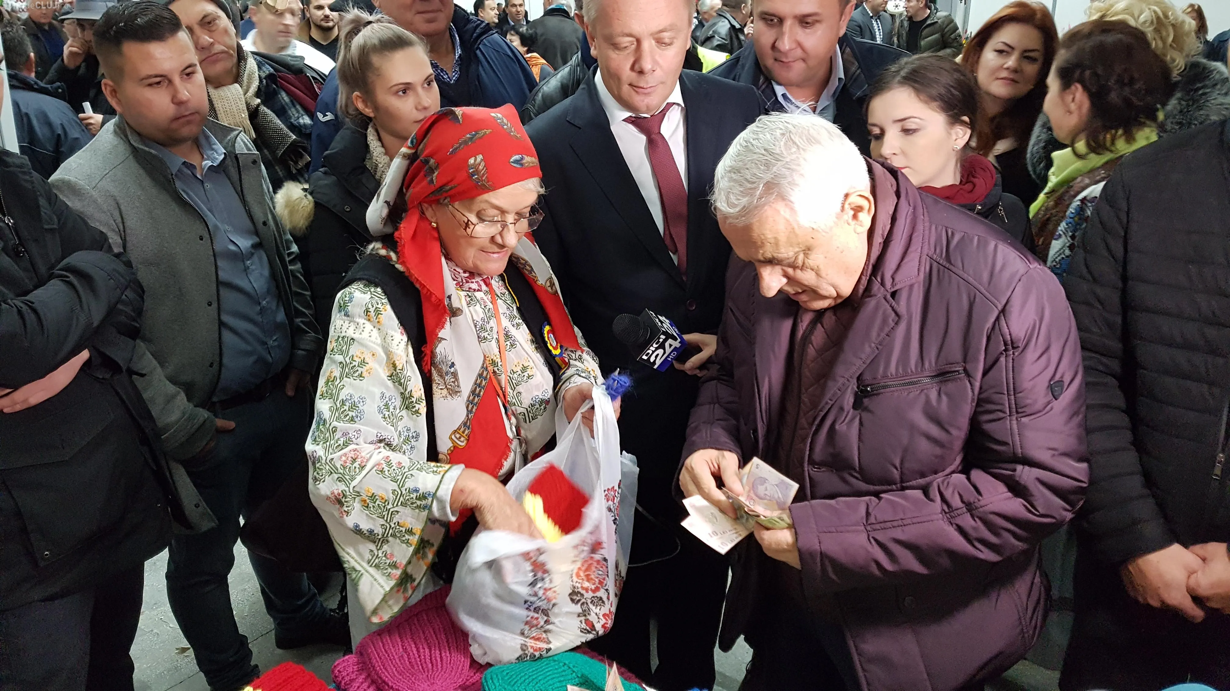 Ministrul s-a plimbat de la o tarabă la alta și și-a cumpărat o blană de oaie, papuci de casă din piele de miel, şosete şi o căciulă tricoloră din lână, plătind peste 400 de lei.