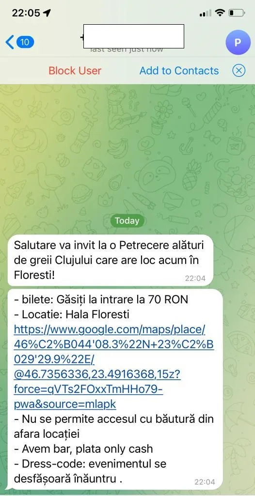 Un mesaj trimis pe Telegram anunță că petrecerea are loc în interior, taxa de acces este 70 de lei.