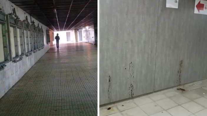 Pe lângă miros, spațiul este semnificativ murdar, iar gresia este acoperită de pete și resturi menajere, inclusiv frunze uscate.