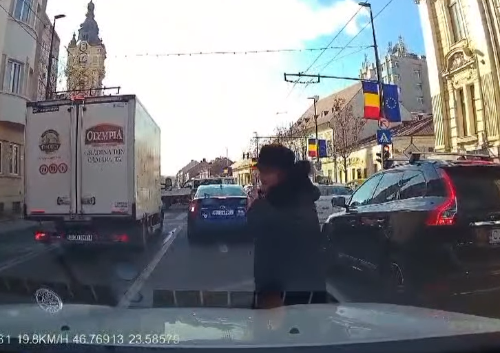 Un șofer a fost la un pas să lovească o bătrână care i-a ieșit în cale, în timp ce circula pe strada Memorandumului din Cluj-Napoca.