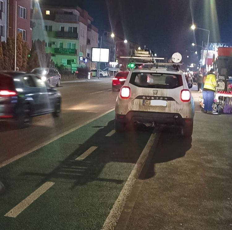 „De fiecare dată când am trecut cu bicicleta pe strada Oțetului, lângă Platinia, pista de biciclete a fost ocupată de mașini parcate și taximetriști. Ieri a fost un șir din 5-6 mașini care blocau pista în totalitate, în condițiile în care parcarea subterană e la 10 m distanță”, a scris un clujean.