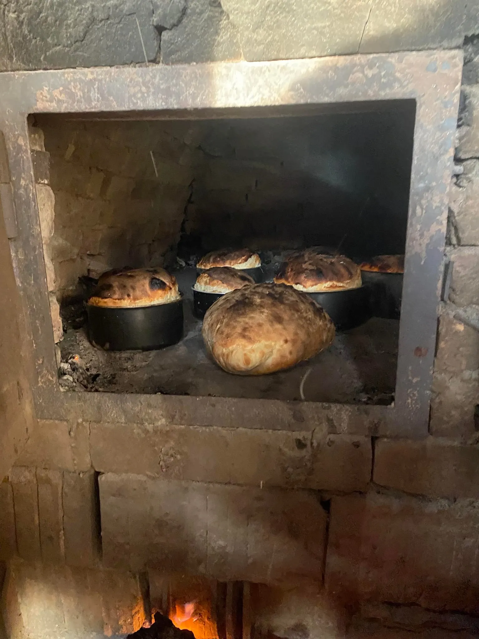 ”Pita” tradițională este absolut specială și delicioasă. Făina este din grâul adunat vara trecută și păstrată în depozitul familiei. Totul se face cu mult suflet pentru că este vorba de un volum mare de muncă. Aluatul este pregătit de dimineața și lăsat să dospească într-un lighean, iar apoi i se dă formă și se bagă în cuptorul încălzit din timp.