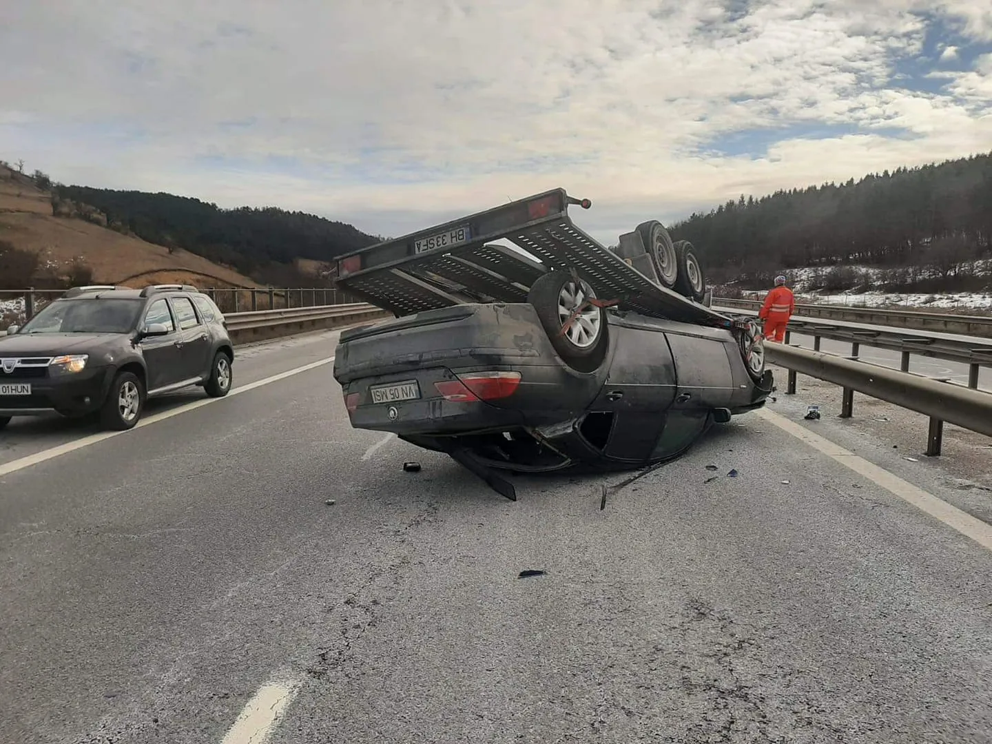 O platformă cu mașină pe ea s-au răsturnat pe Autostrada Transilvania, pe sensul spre Cluj, la km 43.