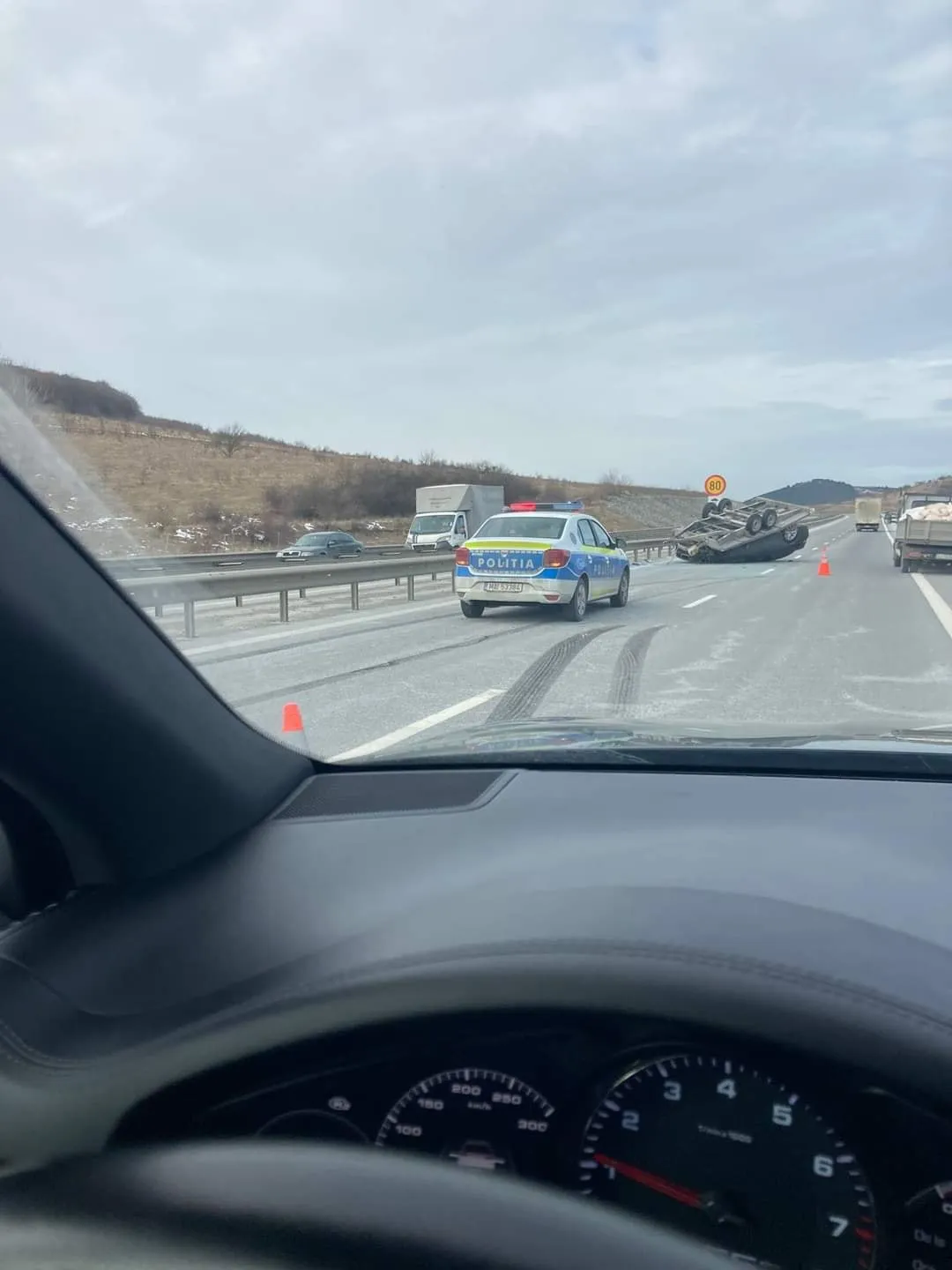 ”Poliția a marcat corespunzător zona. Din ce am văzut erau o masina mica și o dubă oprite pe banda de urgență și un polițist discuta cu persoanele din acele vehicule. Nu știu dacă e vorba de accident intre cele doua autovehicule sau s-a desprins platforma”, a precizat un martor pe grupul Info Trafic jud. Cluj.