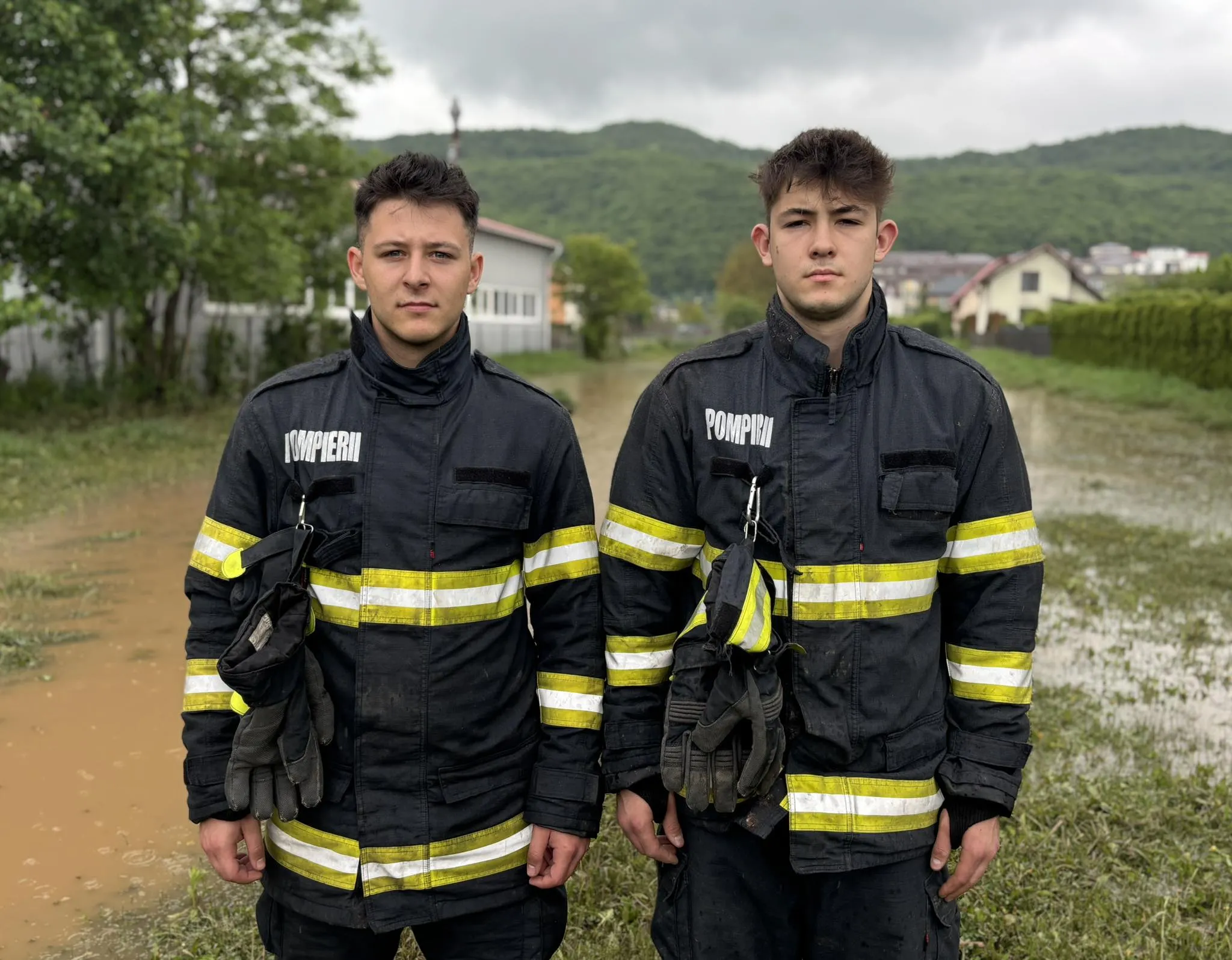 Plini de noroi, uzi, dar cu zâmbetul pe buze! Doi elevi pompieri, în linia întâi la inundațiile din Florești: „Își urmează visul”