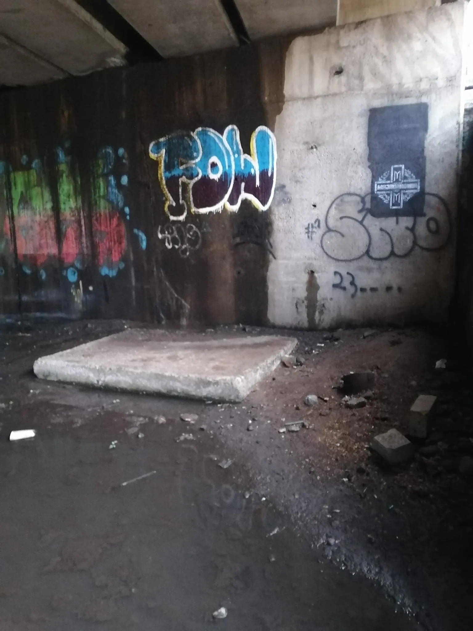 Pe zidurile și stâlpii de susținere, graffiti-urile sunt peste tot, unele reprezentând simple desene juvenile, altele fiind mesaje vulgare sau obscene. Această artă urbană, cândva considerată o formă de exprimare creativă, a devenit aici un simbol al dezordinii și vandalismului.