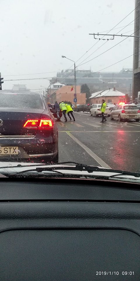 Poliția împinge o mașină defectă în dreptul Bisericii Sf. Petru - FOTO ZILEI