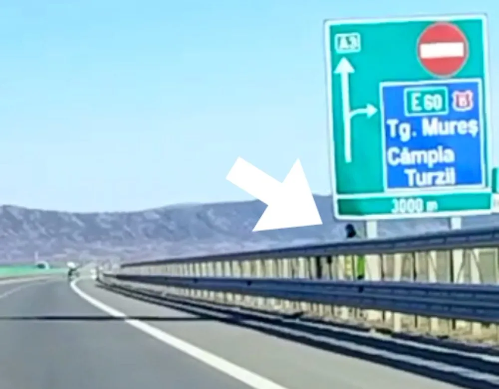 Polițistul stă ascuns după parapet și lângă stâlpul unui indicator, unde este greu de văzut. Probabil că astfel reușește să prindă în flagrant cât mai mulți șoferi care apasă prea mult pedala de accelerație.
