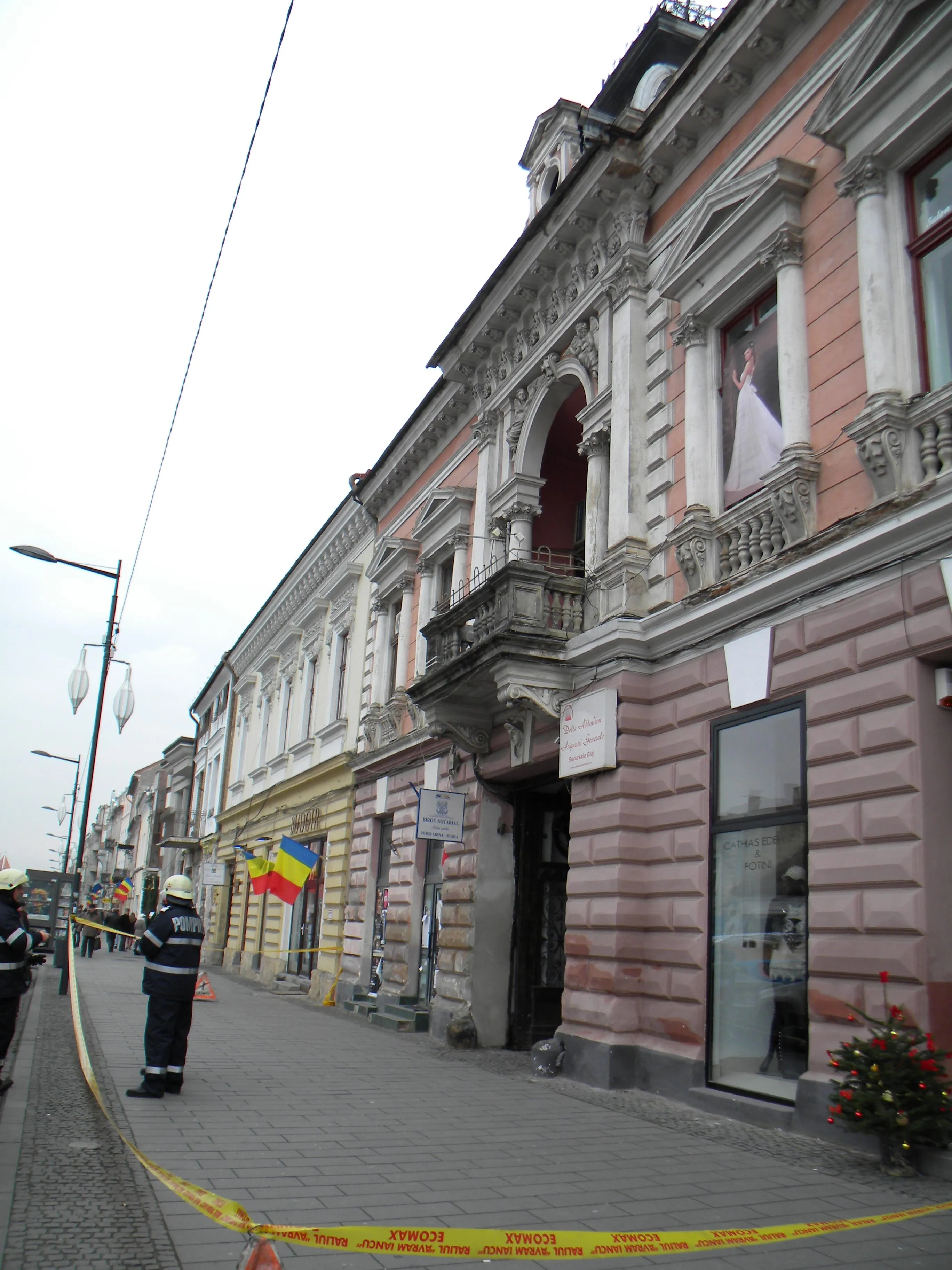 ”S-a deplasat la fața locului poliția locală. Direcția de Protecție a Monumentelor nu a fost de acord cu demolarea bucății de ornament care s-a desprins. Astfel că s-a dispus securizarea cu chingi a bucății de ornament, iar zona a fost semnalizată. De asemenea, urmează să fie contactat un expert care să ofere o soluție. Primăria Cluj-Napoca deține un apartament în acel imobil și are obligația, în cotă parte, să contribuie la lucrările de refațadizare a imobilului”, a declarat Oana Buzatu, purtătorul de cuvânt al Primăriei Cluj-Napoca.