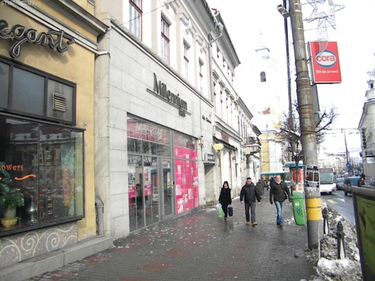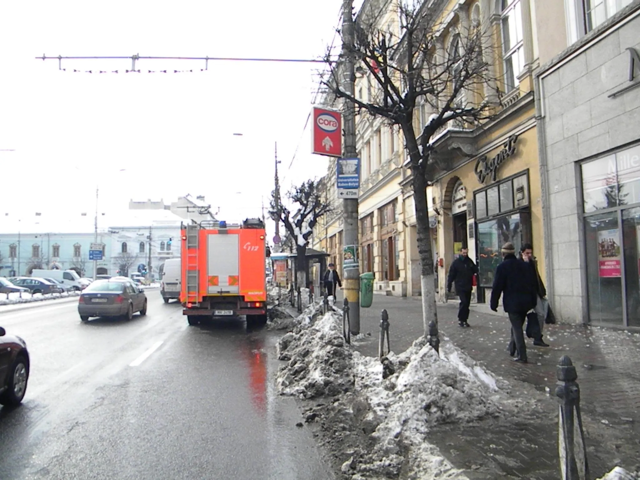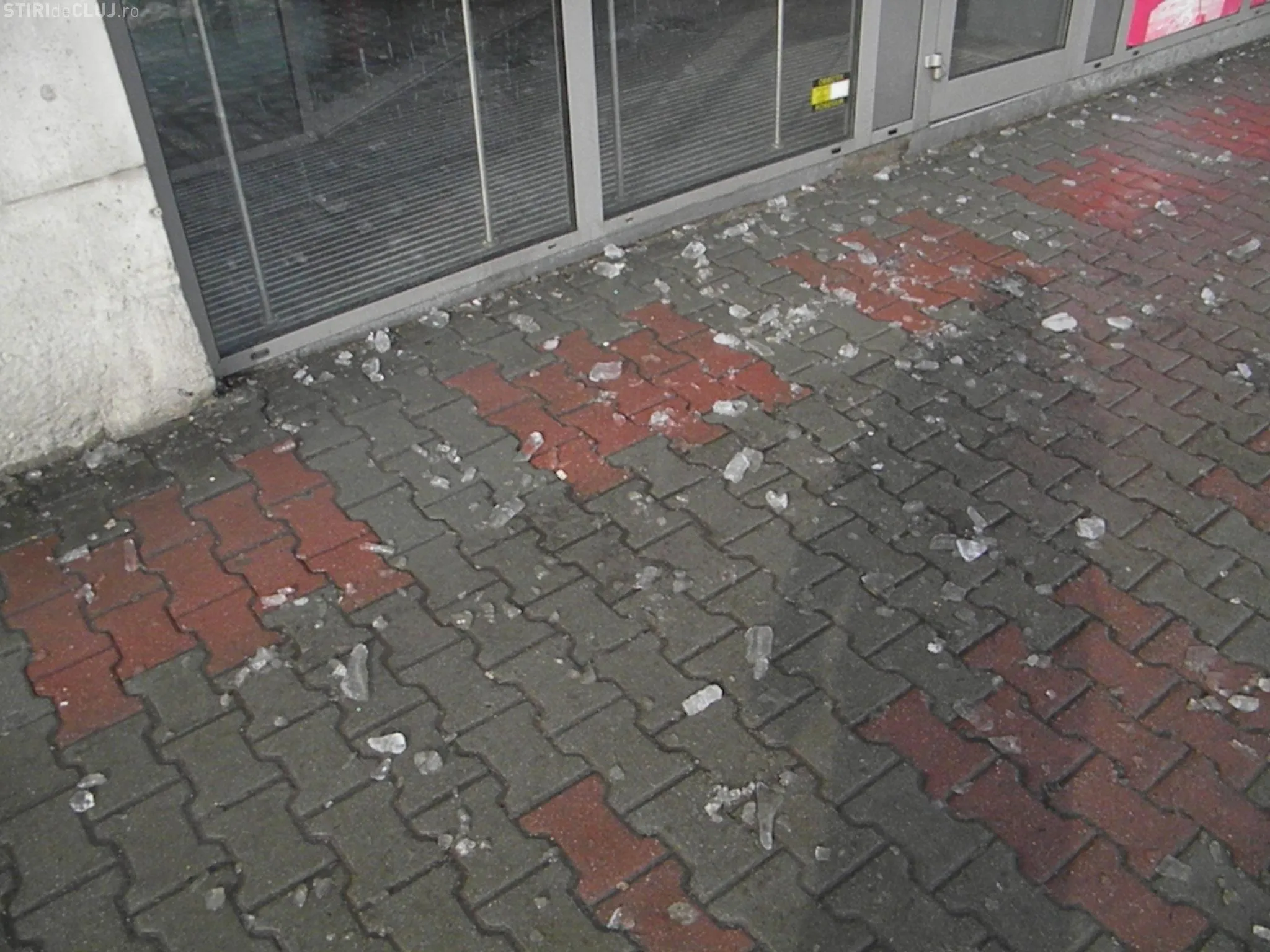 Reprezentantii Inspectoratului pentru Situatii de Urgenta (ISU) Cluj au utilizat scara de pe autospeciala de interventie pentru a indeparta sloiurile de gheata de pe cladirea din Piata Unirii.