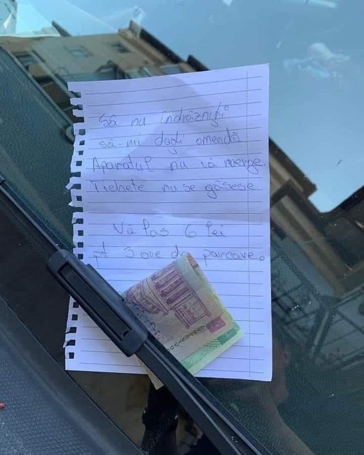 ”Să nu îndrăzniți să-mi dați amendă. Aparatul nu vă merge. Tichetele nu se găsesc. Vă las 6 lei pentru 3 ore de parcare”, a scris în 2019 o tânără din Baia Mare. Cei șase lei au stat acolo 2 ore și nimeni nu s-a atins de ei.