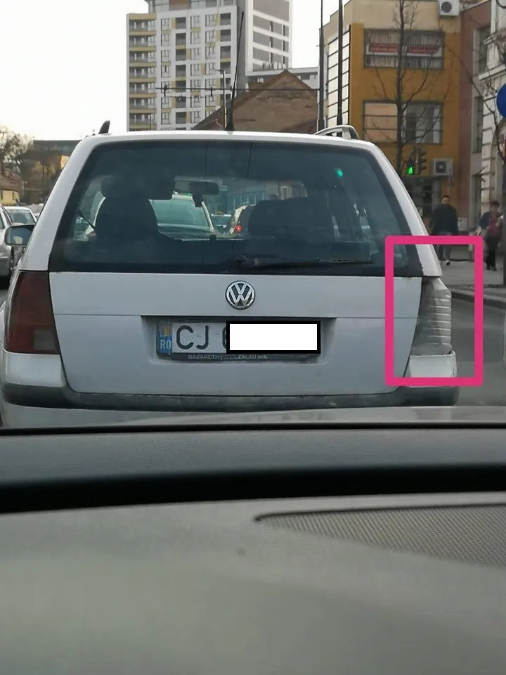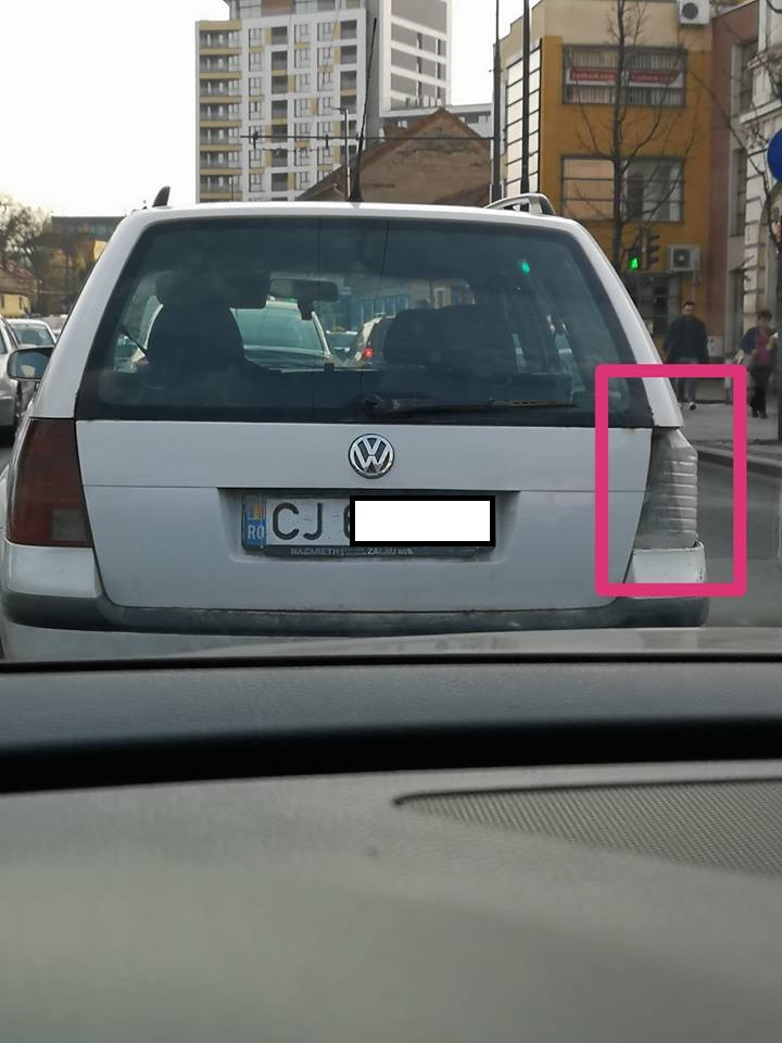 Șoferul, un clujean get-beget, a rămas fără stop în urma unui incident oarecare, dar nu s-a dus până la dezmembrări pentru a înlocui stopul, preferând să folosească un pet.