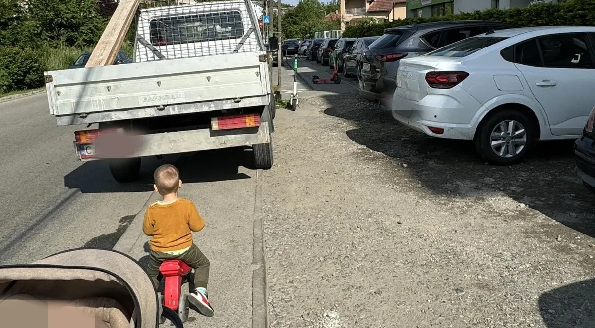 O autoutilitară bloca întreg trotuarul iar femeia avea două opțiuni, să o ia pe drum alături de cei mici sau să ocolească prin parcare, pe unde trebuia să facă oricum slalom printre trotinetele lăsate la întâmplare acolo.