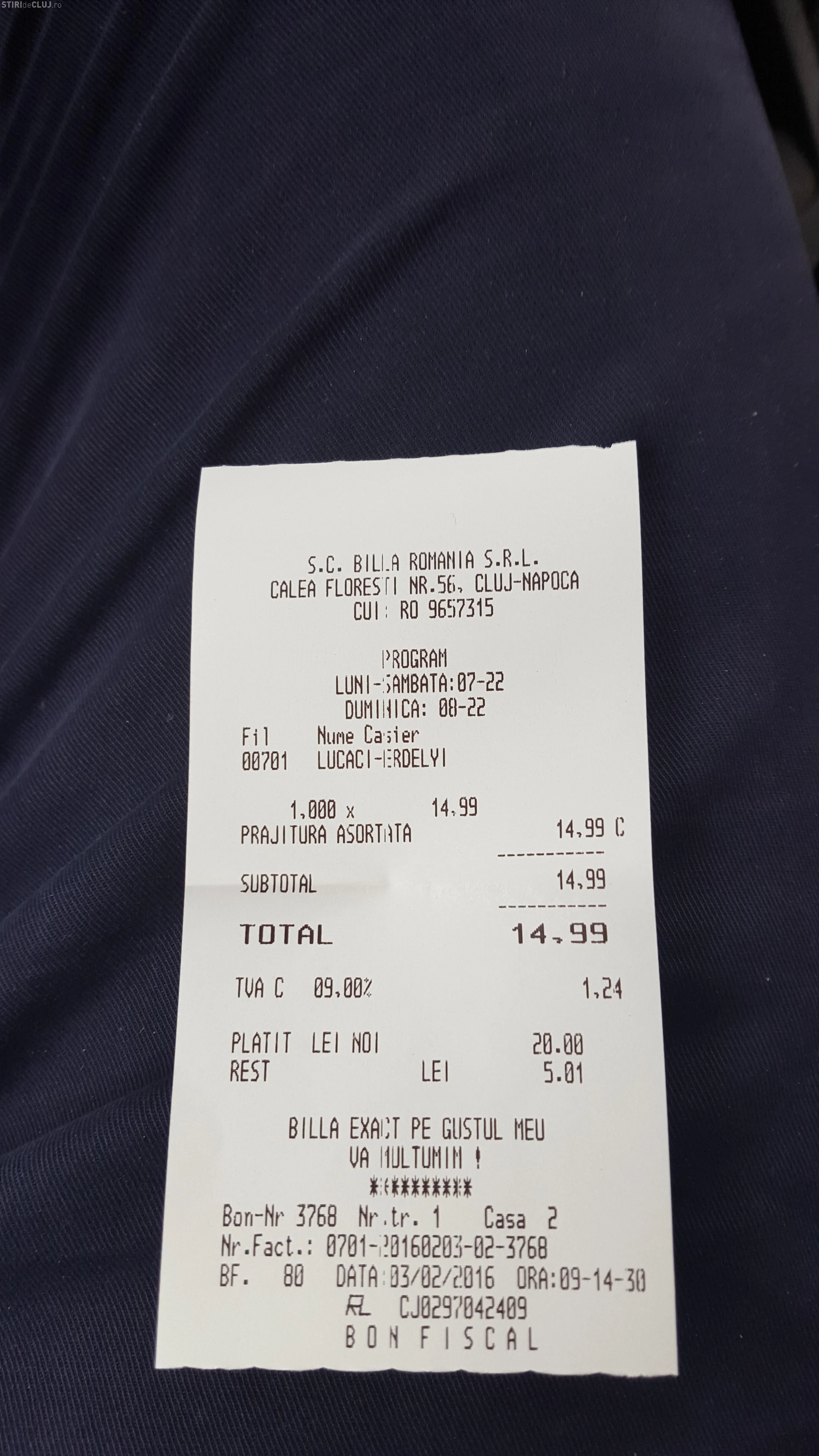 ”Vă contactăm în legătură cu articolul publicat ieri, 3 februarie 2016, cu titlul: “Prăjitură expirată la Billa. OPC Cluj mai există?” care relatează că un clujean a cumpărat cutii cu prăjituri de la Billa de pe Calea Florești nr. 56 care au expirat pe 31 ianuarie. Dorim să subliniem faptul că informațiile nu sunt adevărate și că magazinul nostru nu a avut acest lot cu data de 31.01.2016, conform Avizelor de intrare marfă. În plus, în poza din articol apare un bon Billa pe care este înscrisă o singură cutie de prăjituri, iar în articol se amintește de cumpărarea “a câtorva cutii”.