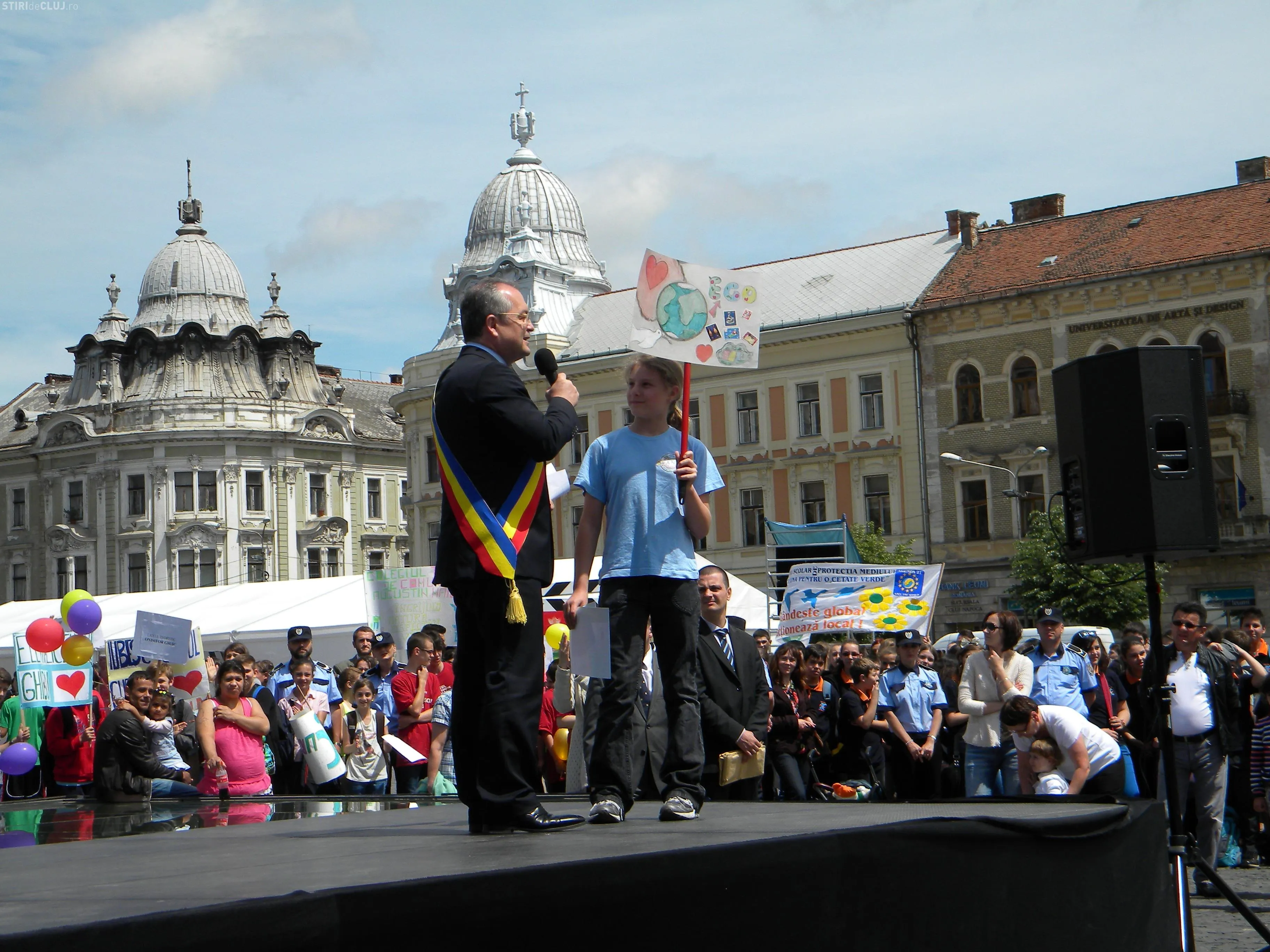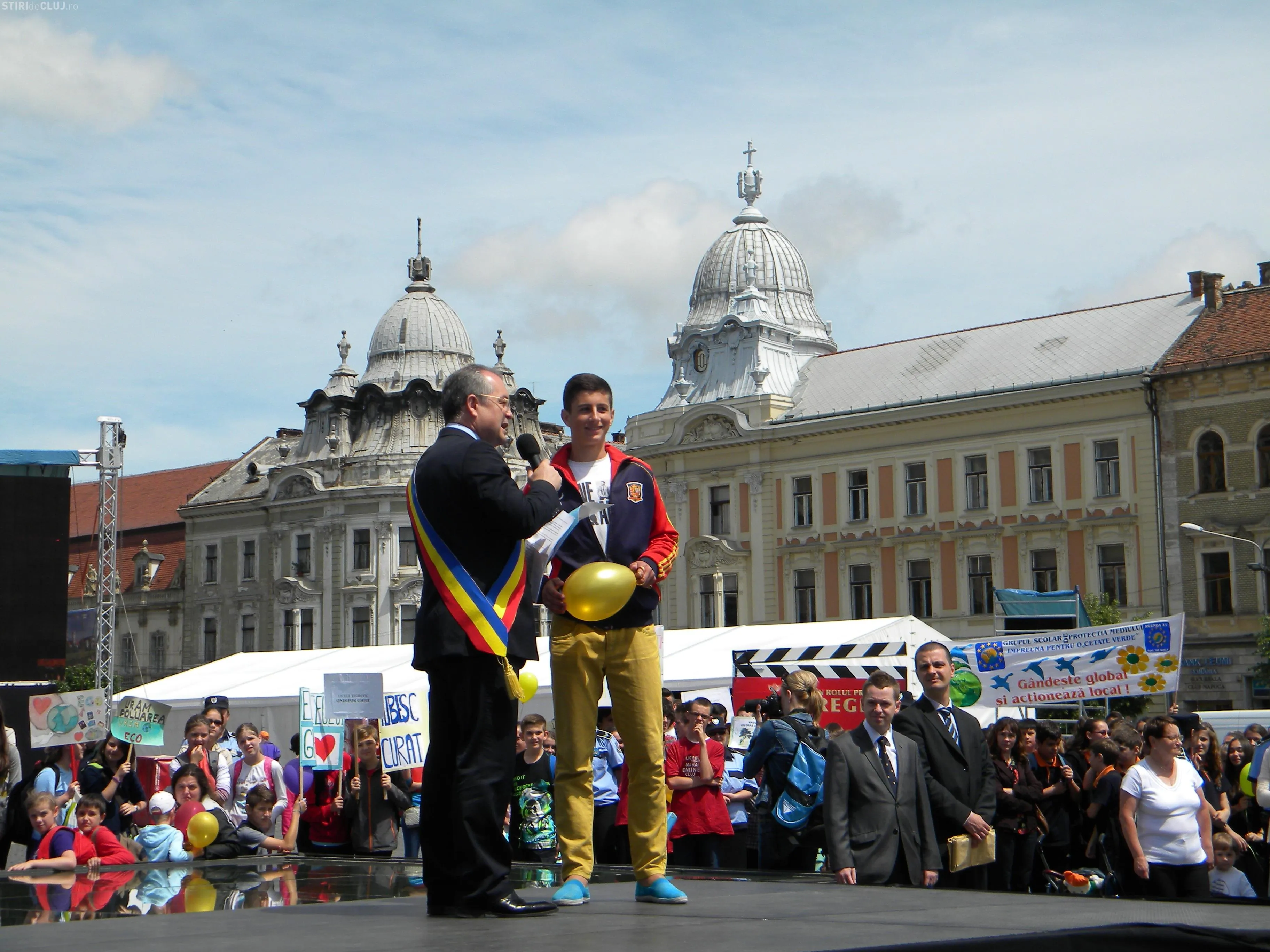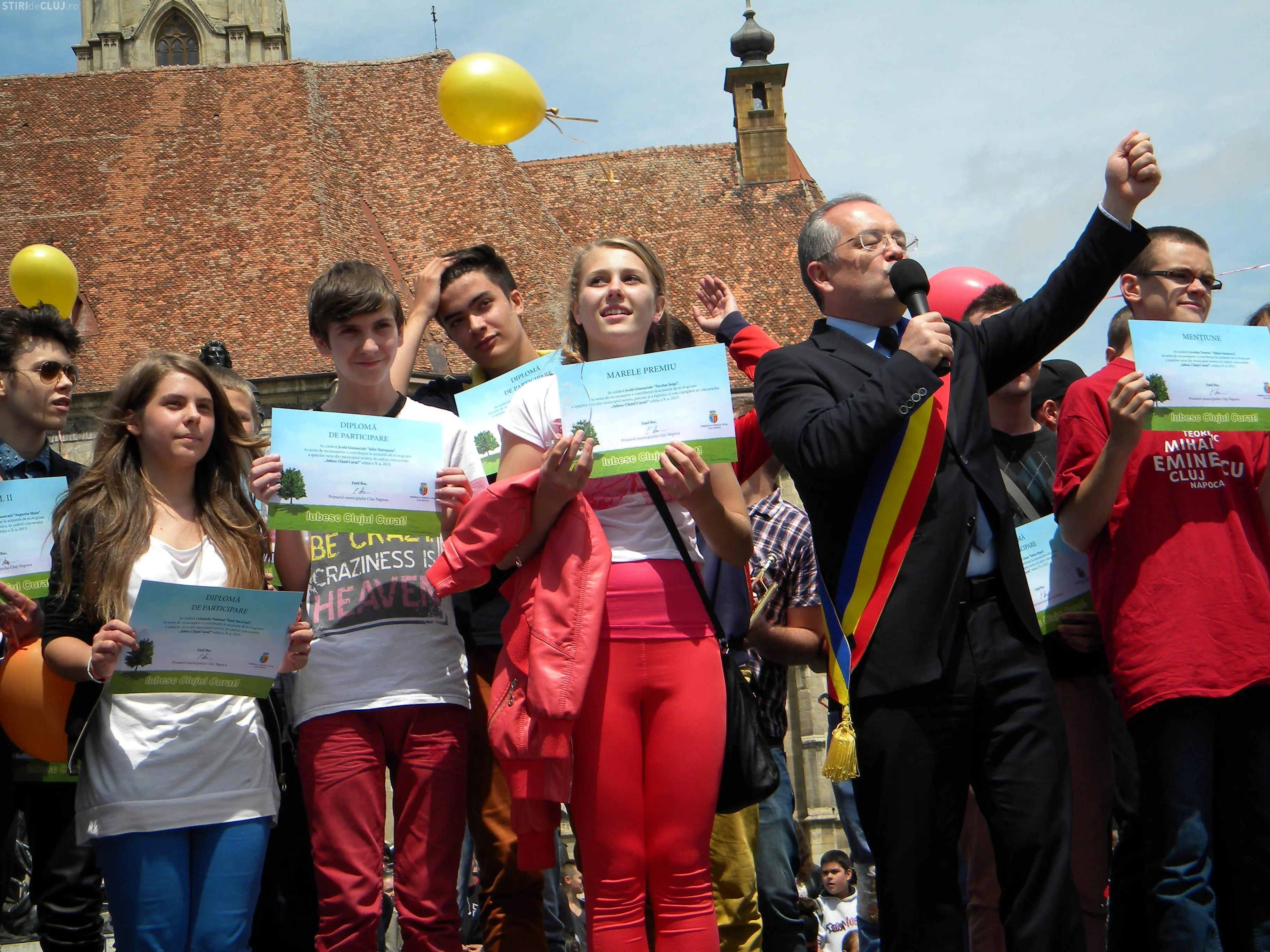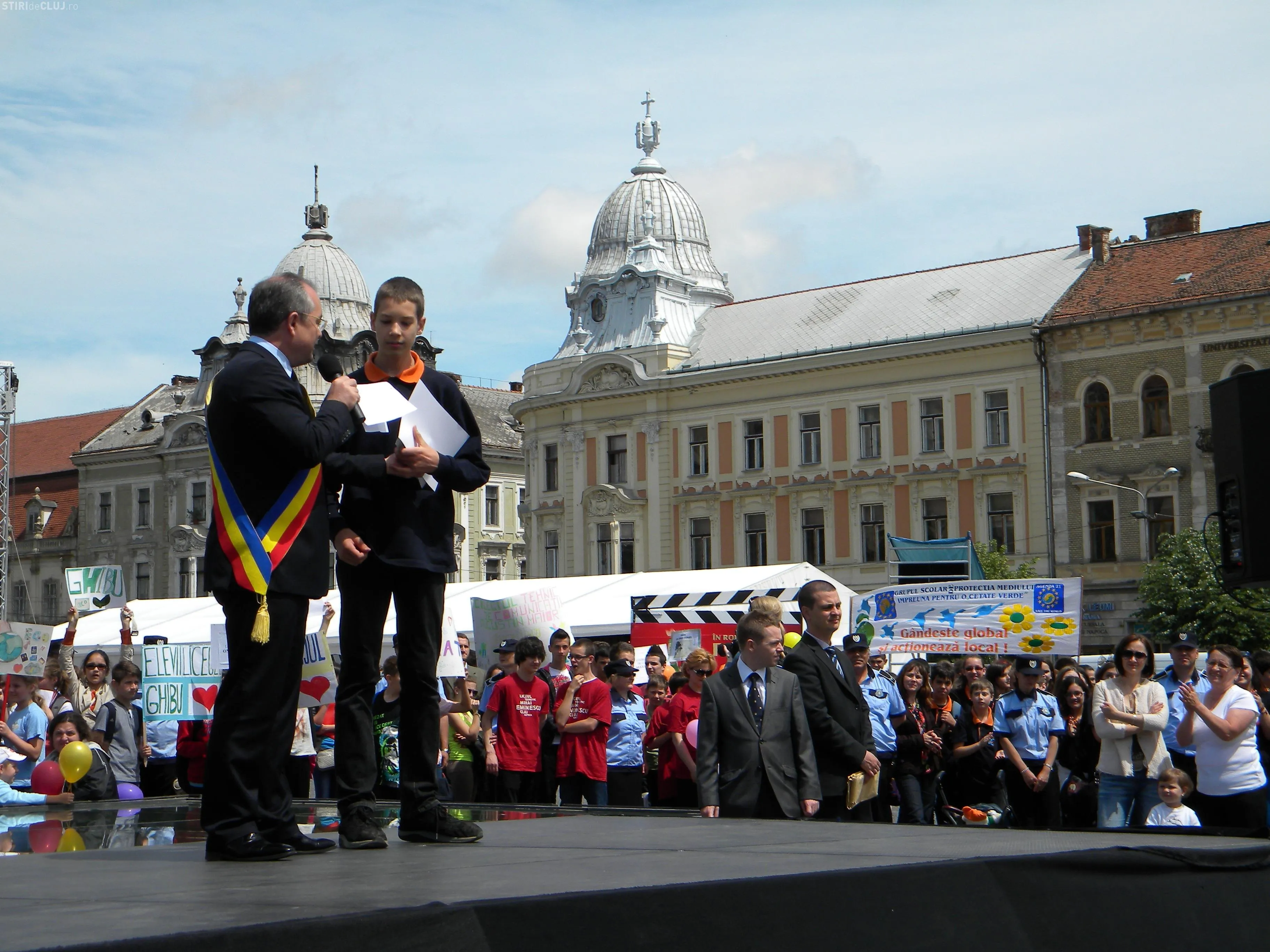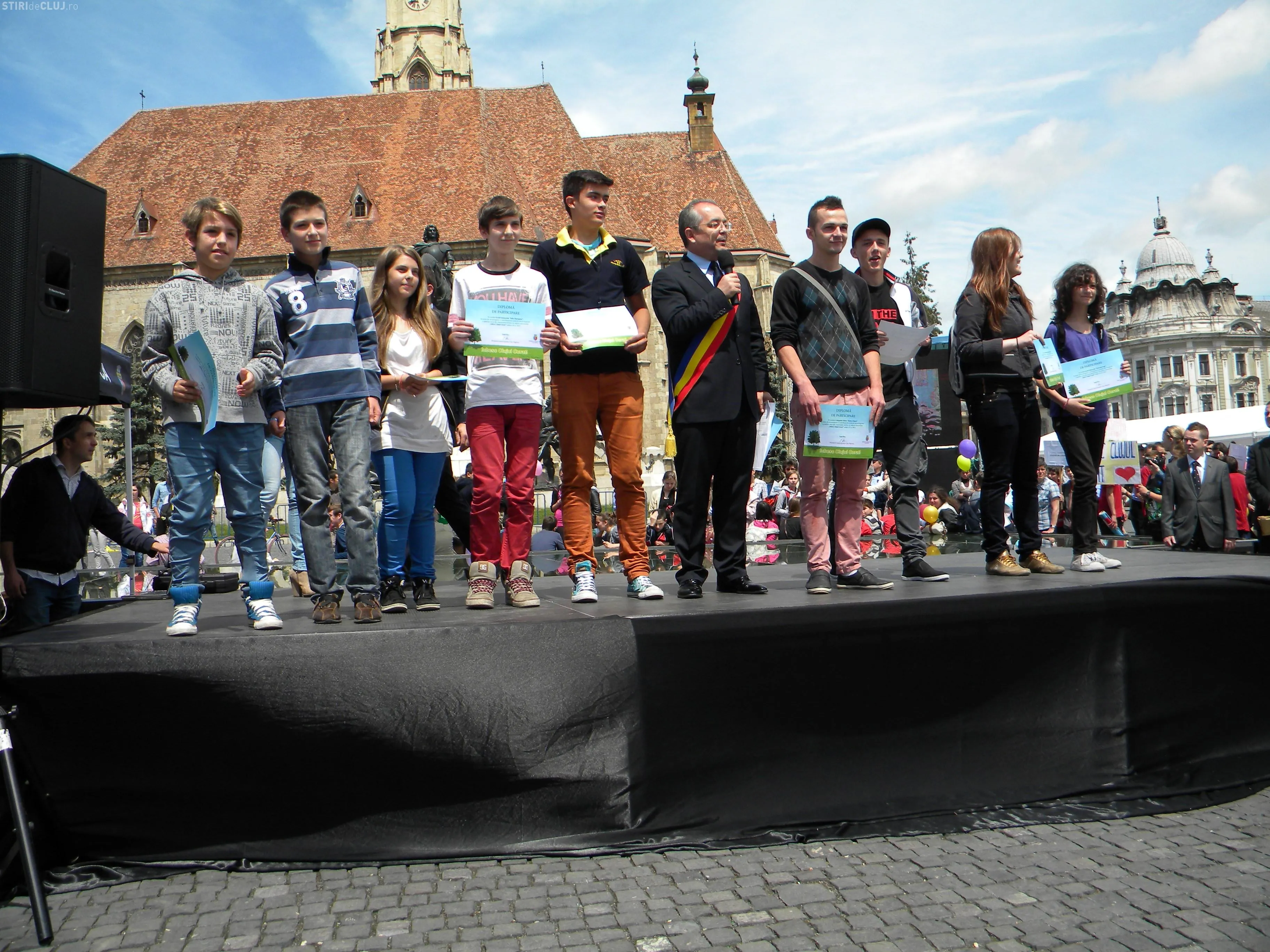 Elevii care s-au înscris în concursul ecologic Iubesc Clujul Curat 2013 au fost premiați de Emil Boc, vineri, 31 mai, în Piața Unirii.