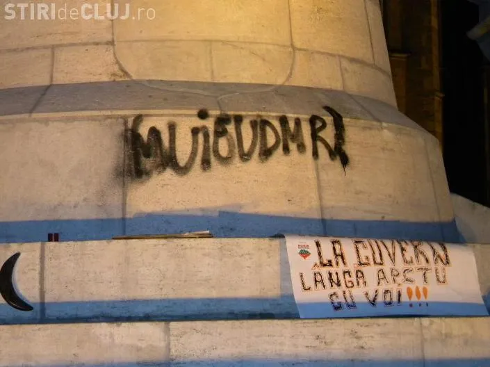 Suporterii U Cluj au scris "M..e UDMR" pe statuia lui Matei Corvin EXCLUSIV