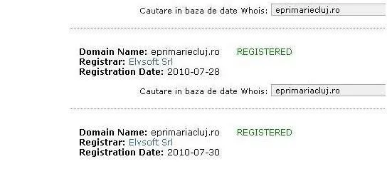 Cert este ca aceeasi firma, cel care a cumparat prin Elvsoft s-a miscat repede si in 30 iulie au cumparat si domeniul eprimariacluj.ro, fara ca cineva de la administratia locala sa si miscat vreun deget in cele 24 de ore pe care le-au avut la dispozitie pentru a cumpara numele.