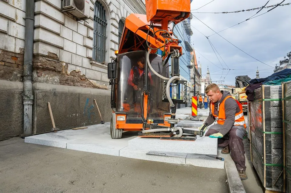 De asemenea, a început montarea dalelor de piatră naturală (granit) pe trotuarul vestic.