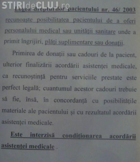 "Primirea de donatii sau cadouri de la pacient, ulterior finalizarii acordarii asistentei medicale, ca recunostinta pentru serviciile prestate este perfect legala, cuantumul acestor cadouri trebuie sa fie insa in concordanta cu posibilitatile materiale ale pacientului si cu rezultatul acordarii asistentei medicale. Este interzisa conditionarea acordarii asistentei medicale", scrie pe afisul plasat in sectia ORL a spitalului clujean.