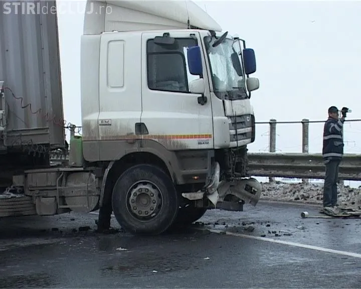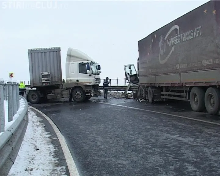 Iesirea de pe autostrada Transilvania a fost blocata timp de 3 ore din cauza unui accident de circulatie. Un TIR a derapat pe carosabilul umed si a intrat frontal intr-un alt autotren.
