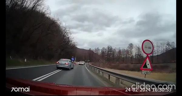 ”Priviți doi retardati, CJ .. WWW si B ... CFB, cum erau sa moara pe E60 Oradea - Cluj, la O ZI DUPĂ montarea parapetilor. Cel din urma, dacă nu franam de urgență, fie intra în mine fie zbura în parapet. Nu-i nimic, filmarea ajunge la poliție.