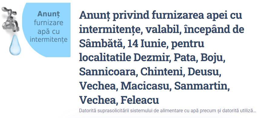 De parcă nu era destul de neplăcut, astăzi, Compania de Apă Someș a dat un comunicat în care anunță probleme cu apa pe o perioadă neprecizată, „începând de sâmbătă, 14 iunie, pentru Dezmir, Pata, Boju, Sânnicoara, Chinteni, Deusu, Vechea, Măcicașu, Sânmărtin și Feleacu.”.