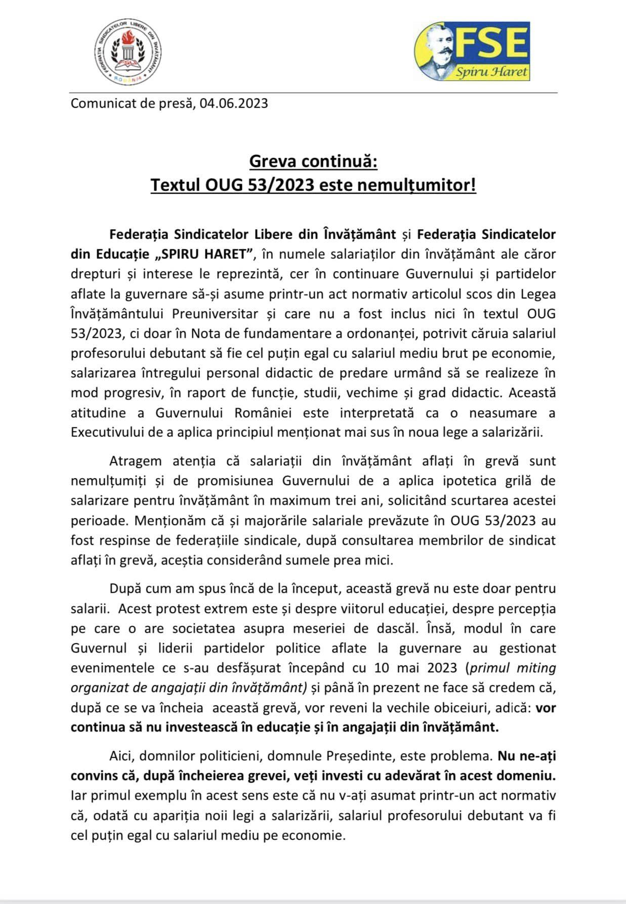 „GREVA CONTINUĂ! Textul OUG 53/2023 este nemulțumitor!”, a transmis duminică Sindicatul Liber al Învățământului Preuniversitar Clujean.