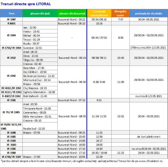 Potrivit programului CFR de Paște, vor fi garnituri suplimentare din București Nord, Iași / Suceava, Timișoara Nord, Arad, Craiova, Baia Mare, Cluj Napoca, Brașov spre Constanța și stațiunile de pe litoral, inclusiv. Totodată, CFR călători va suplimenta trenurile înspre cele mai solicitate destinații cu vagoane de dormit și tip cușetă. De asemenea, trenul de Iași/Suceava care merge la Mangalia și retur va avea vagoane cușetă.