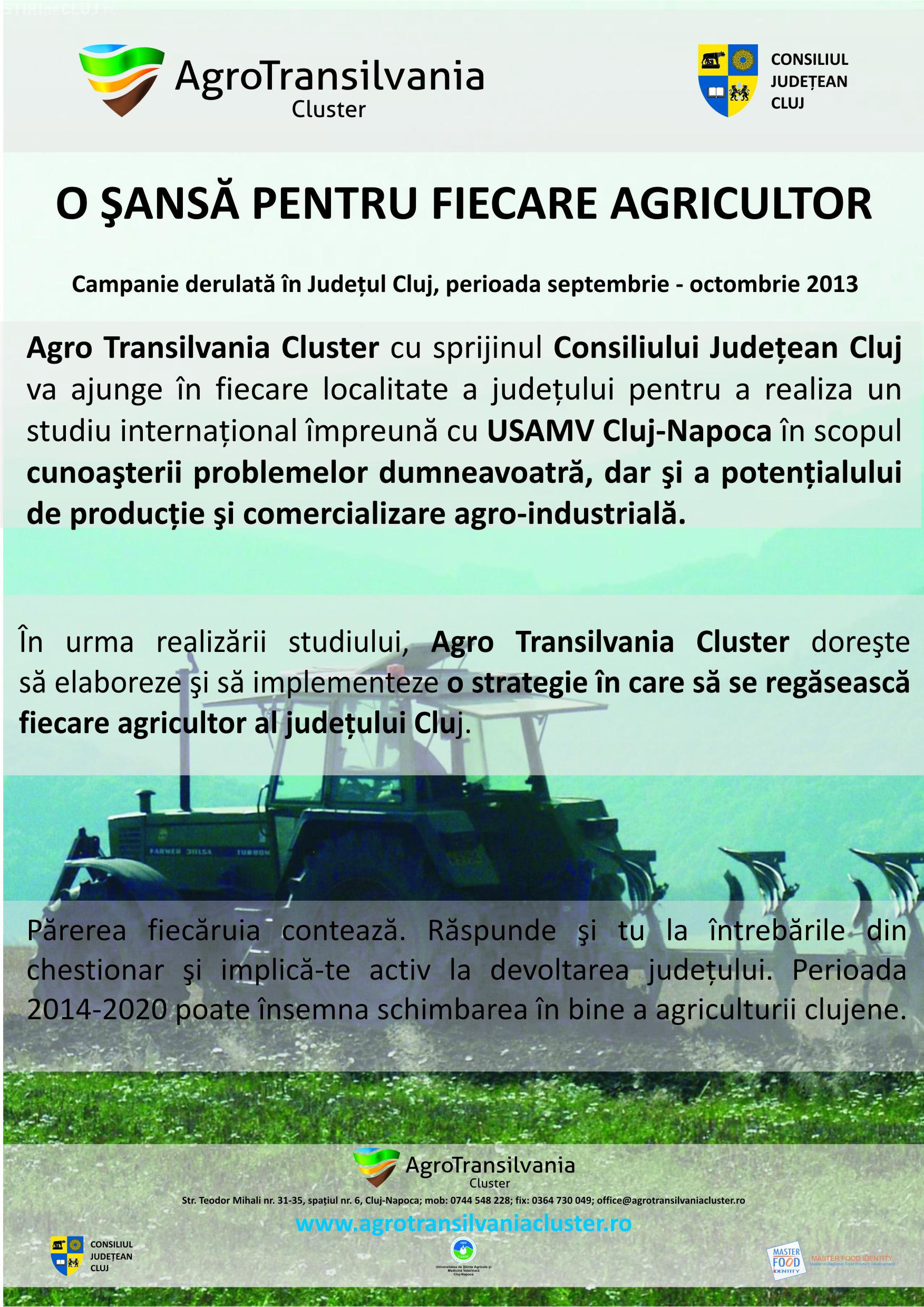 Un nou priecte pentru integrarea comunităților locale clujene în strategia regională agricolă pentru perioada 2014-2020 va fi derulat în luna septembrie de către AgroTransilvania Cluster, cu sprijinul Consiliului Judeţean Cluj şi al Universităţii de Ştiinţe Agricole şi Medicină Veterinară Cluj-Napoca.