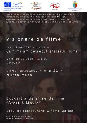 In cadrul acestui proiect, Primaria Cluj-Napoca si cinematograful Marasti va invita la proiectia gratuita de filme "Start A Movie". Filmele pot fi vizionate le cinematograful Marasti dupa urmatorul program :