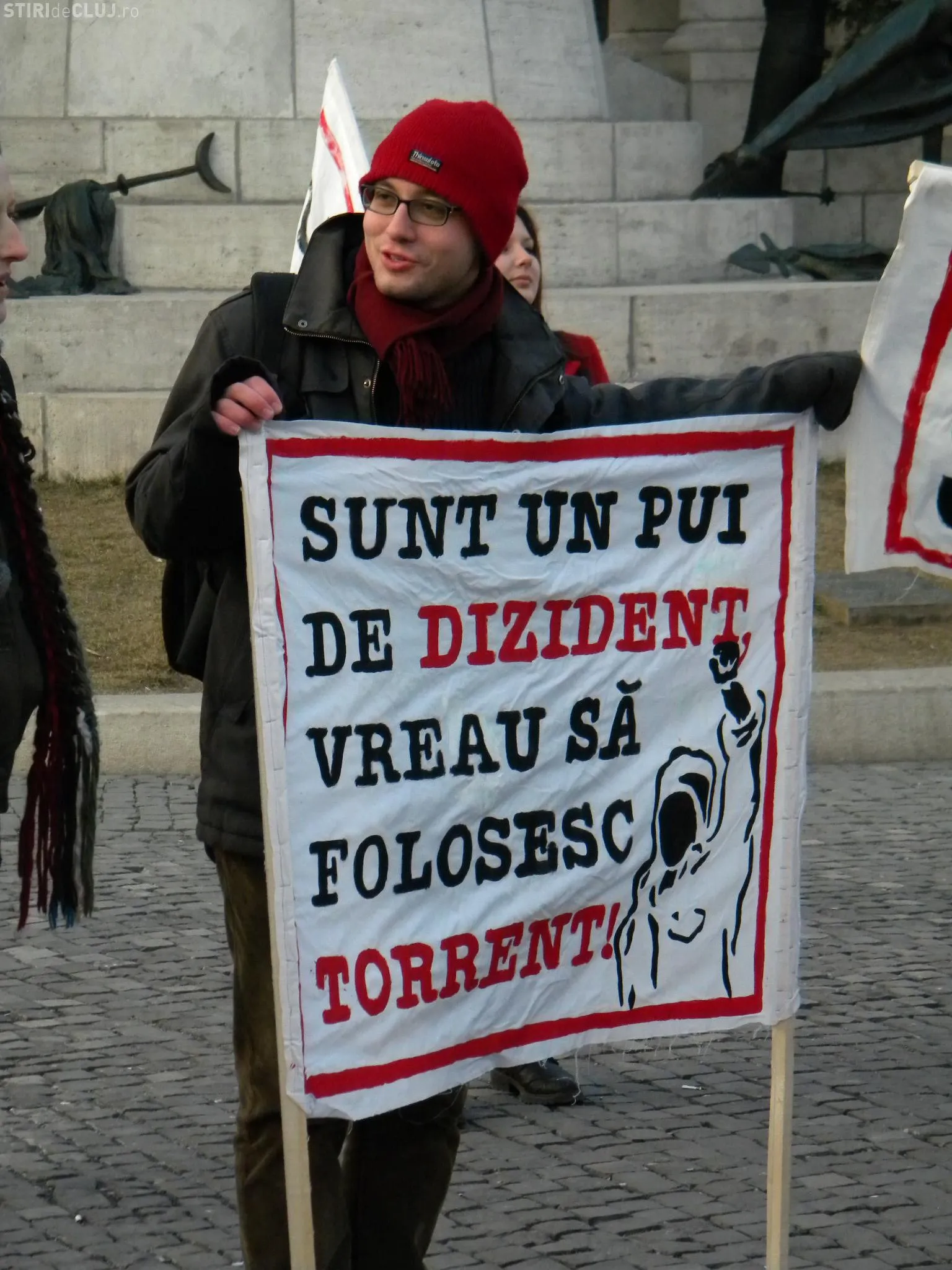 "Am adunat fiecare cate o carte sau cate un CD si le-am adus aici. Vrem sa simulam un site de sharing si sa aratam ca prin internet se face si schimb de informatie. S-a inchis un astfel de site folosit de studenti, foarte util, prin care erau schimbate carti si cursuri", a spus unul dintre protestatari.