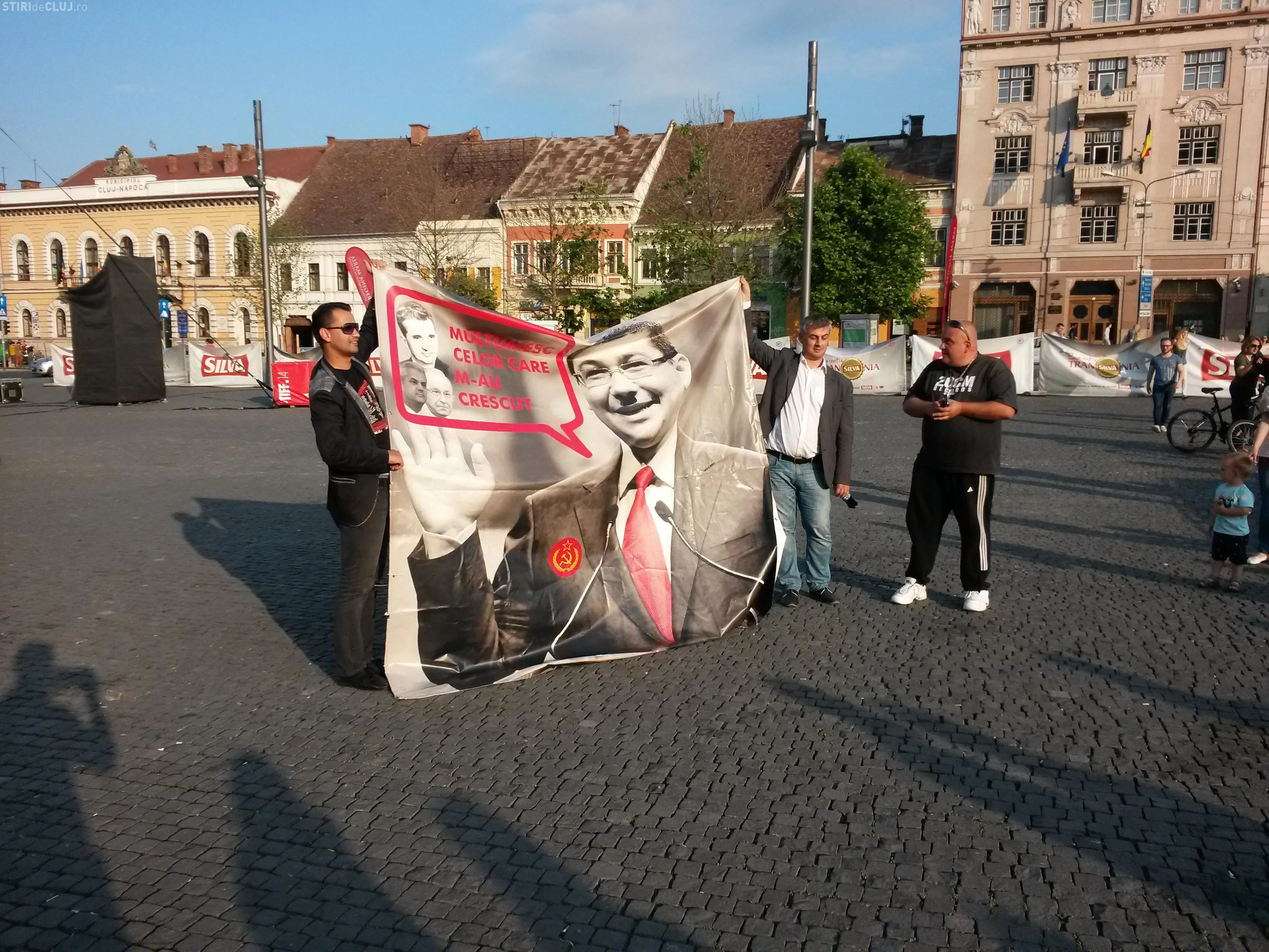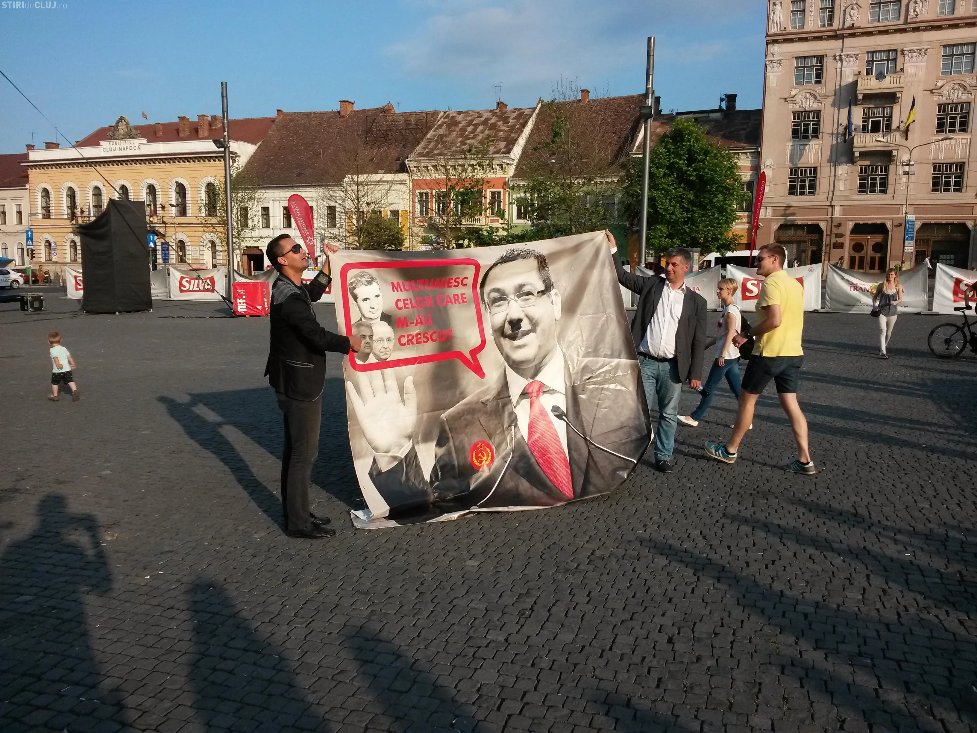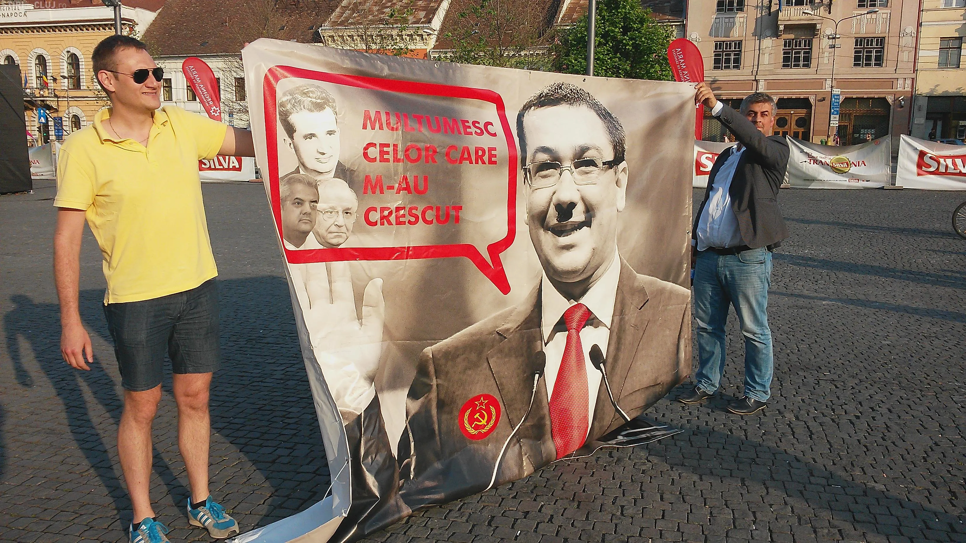 Pe banner erau și pozele lui Nicolae Ceaușescu, Ion Iliescu și Adrian Năstase, cu mesajul ”Mulțumesc celor care m-au crescut!”, atribuit lui Victor Ponta. Pe fotografie mai apărea și ”Secera și ciocanu”, însemnele fostului Partid Comunist Român.