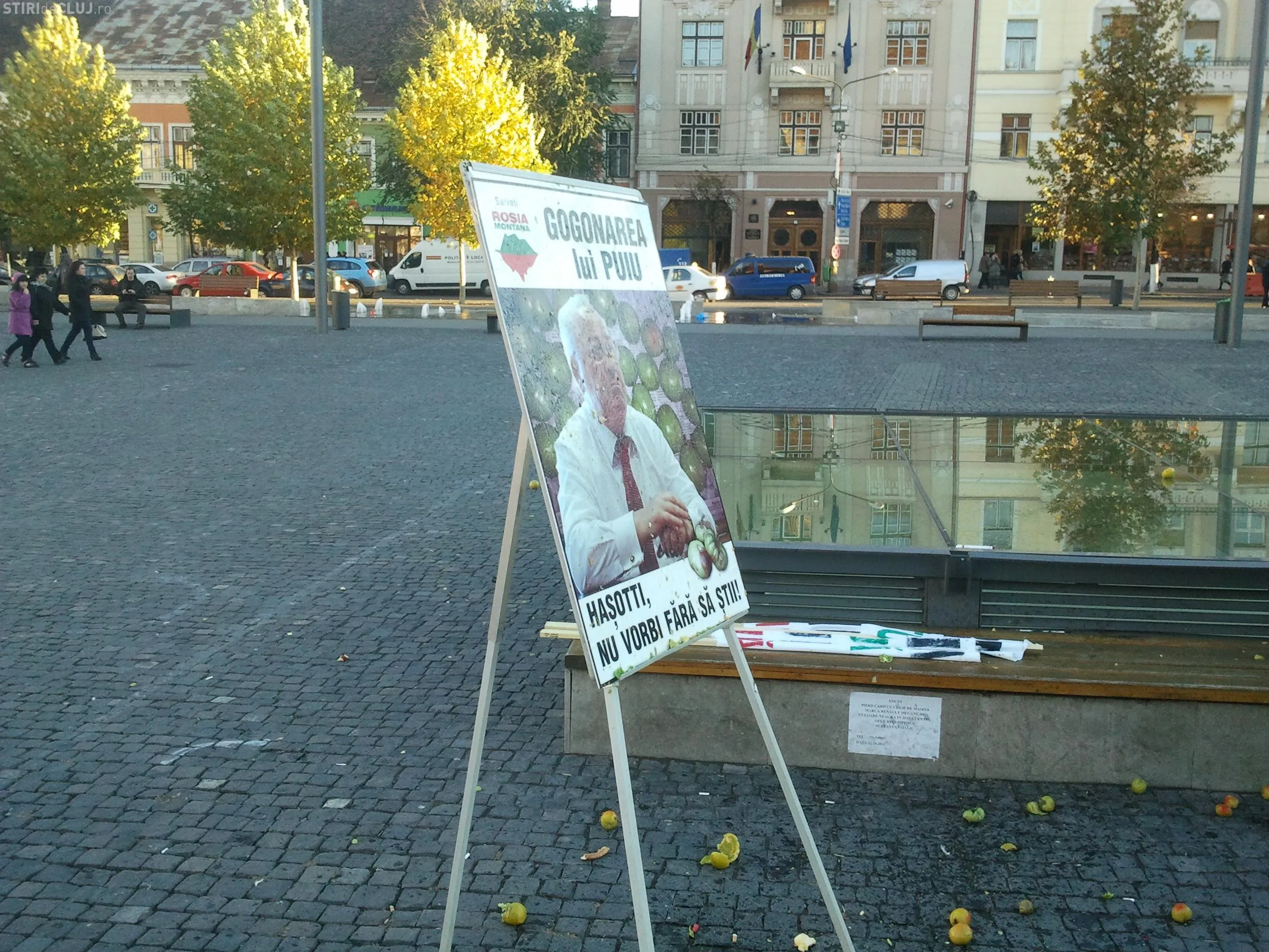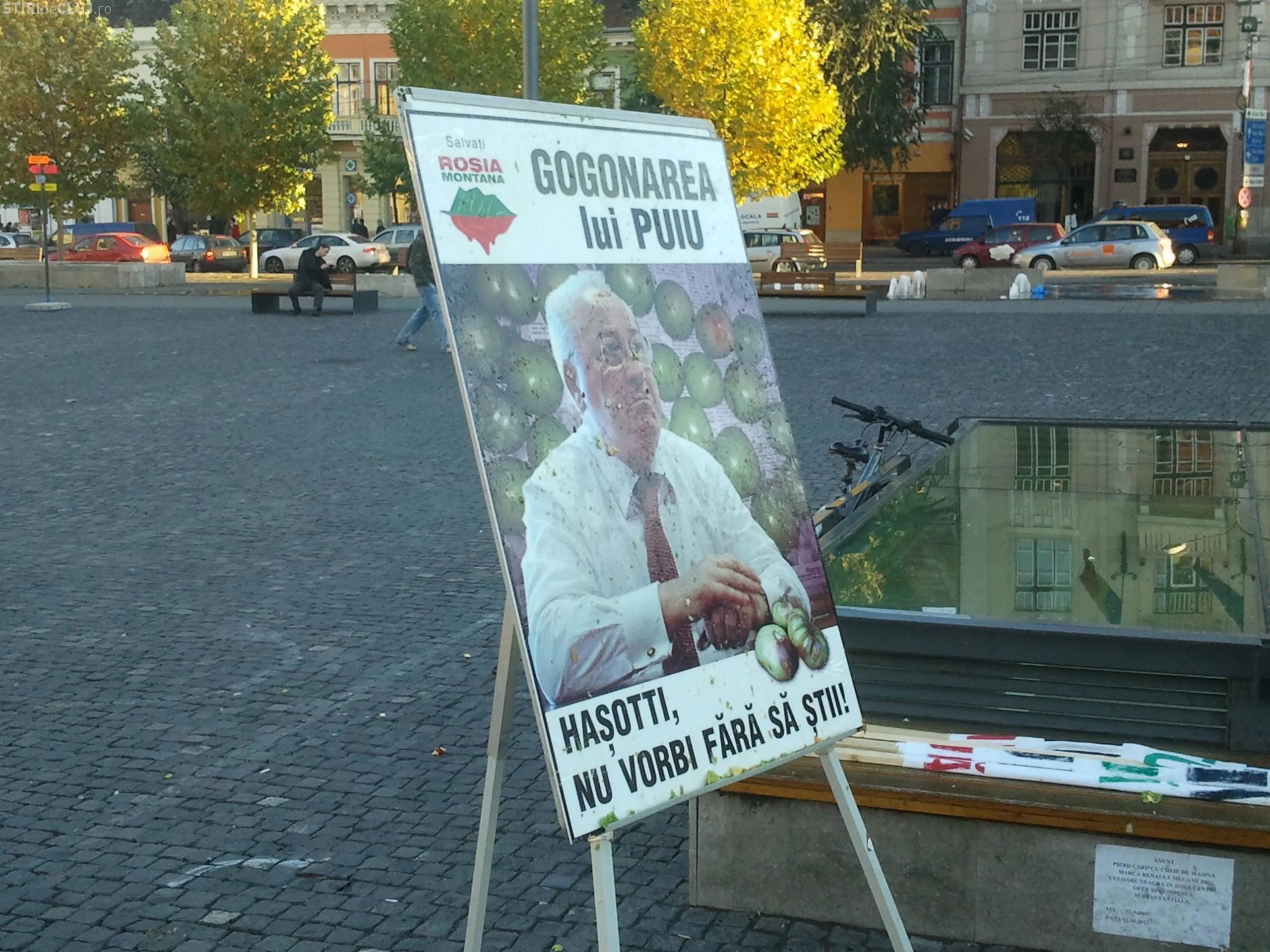 Protest anti Roșia Montană la Cluj! Suporterii Galatasaray au aruncat și ei cu gogonele în afișul cu ministrul Culturii - VIDEO și FOTO