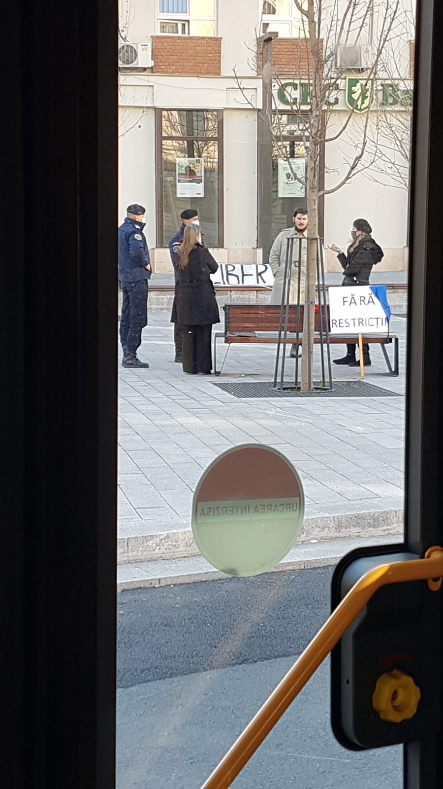 În jurul orei 18.30, trei oameni erau în piațeta din fata Prefecturii Cluj, la taclale cu doi jandarmi. Unul dintre protestatari nu purta mască, fiind împotriva ”botnițelor”. Acesta a refuzat că poarte și într-un autobuz, fiind apostrofat de clujeni.