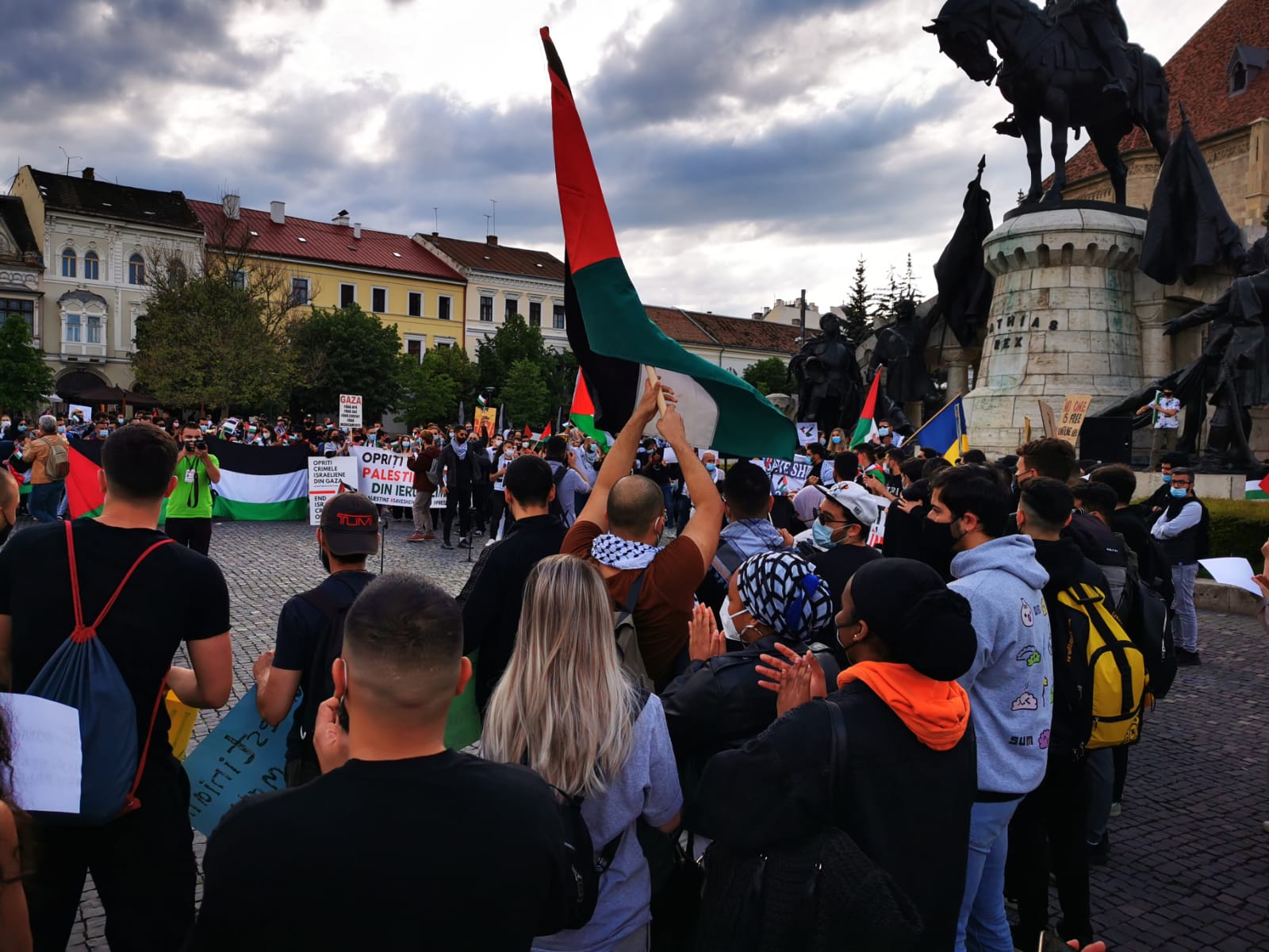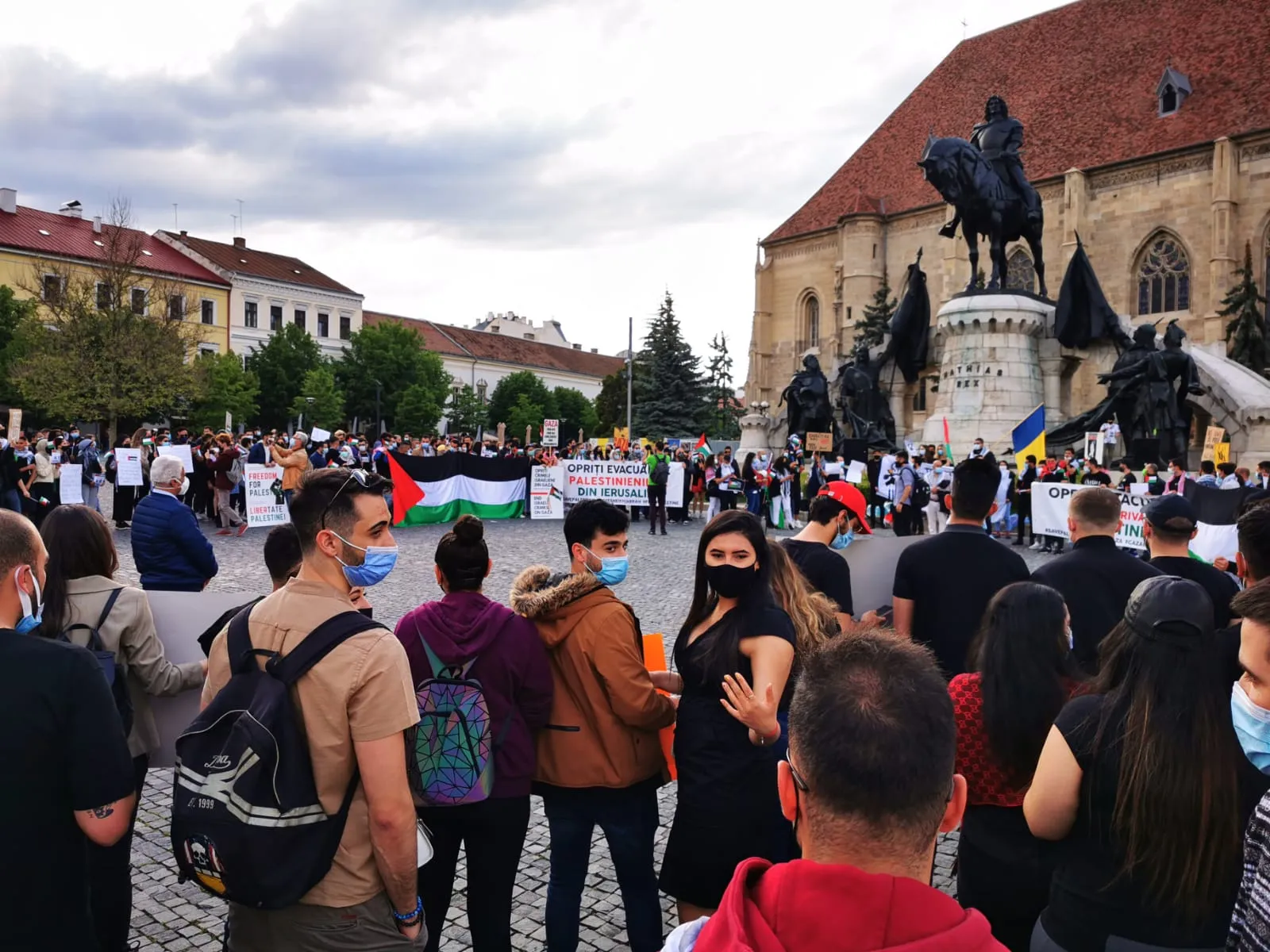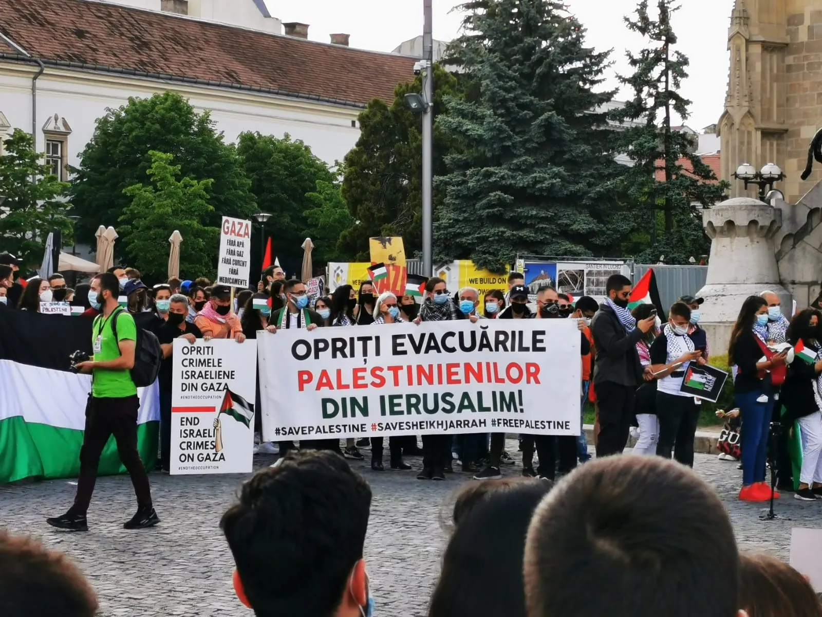 Protestatarii sunt studenți străini de la Cluj, dar nu numai. ”Opriți evacuările palestinienilor din Ierusalim”, ”Opriți crimele israeliene din Gaza”, ”Libertate Palestinei”, sunt câteva dintre sloganurile afișate pe bannere.