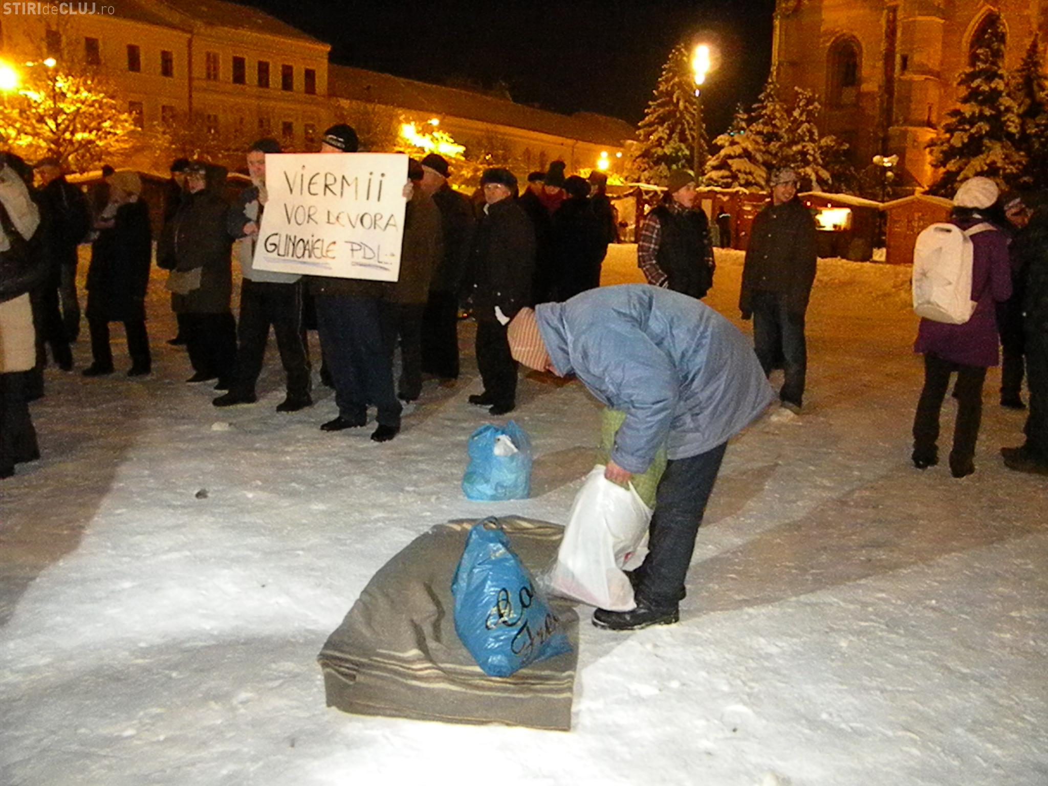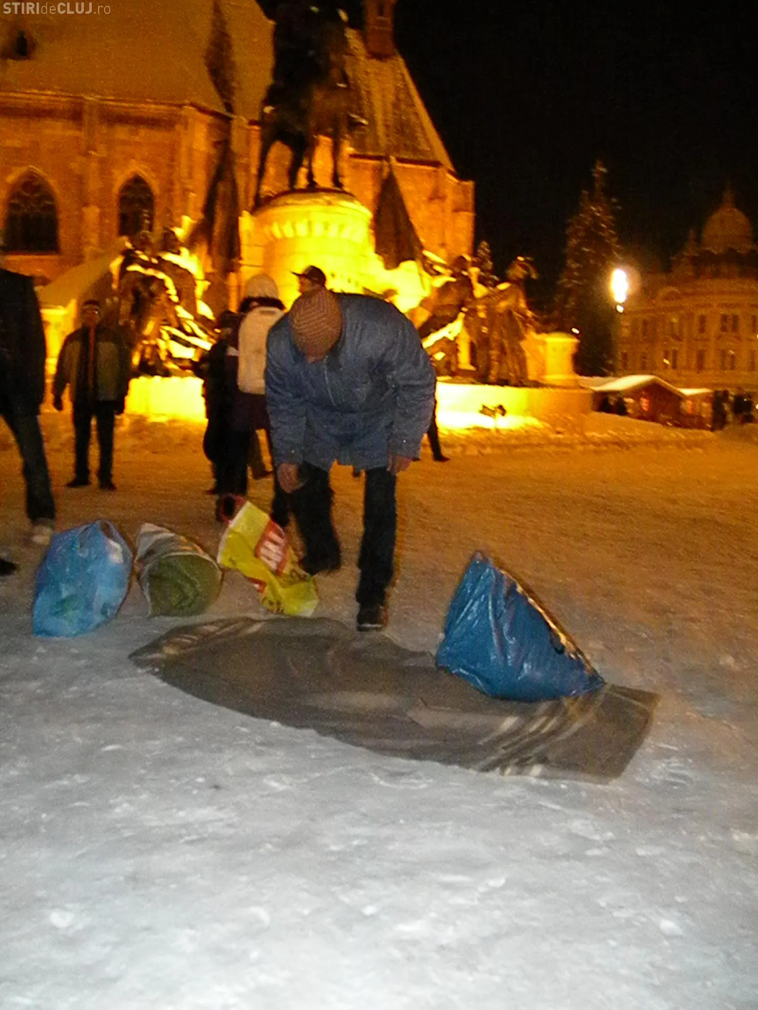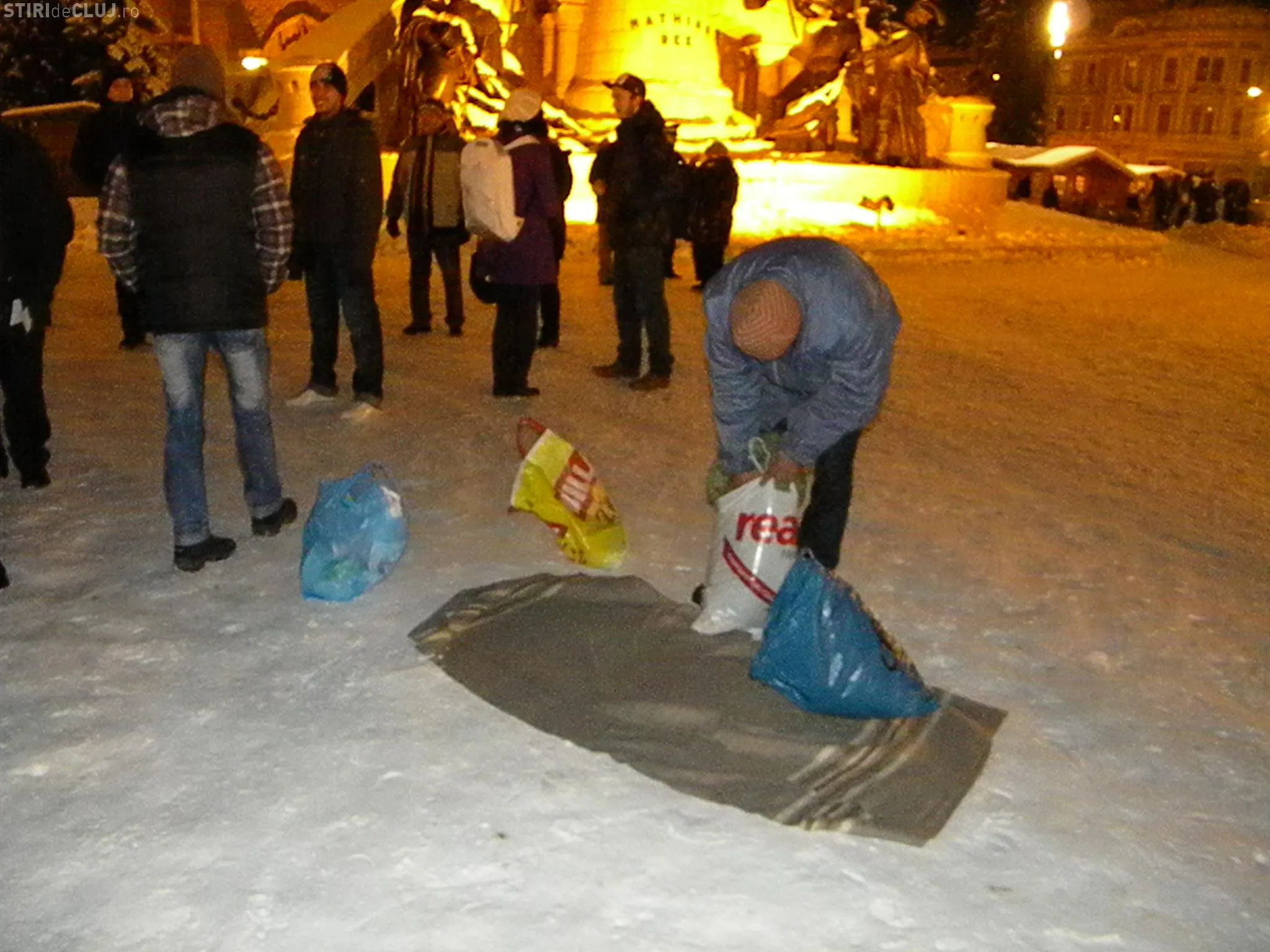 Protest excentric in Piata Unirii impotriva lui Traian Basescu! Un tanar si-a intins patura pe zapada si a vrut sa se culce FOTO
