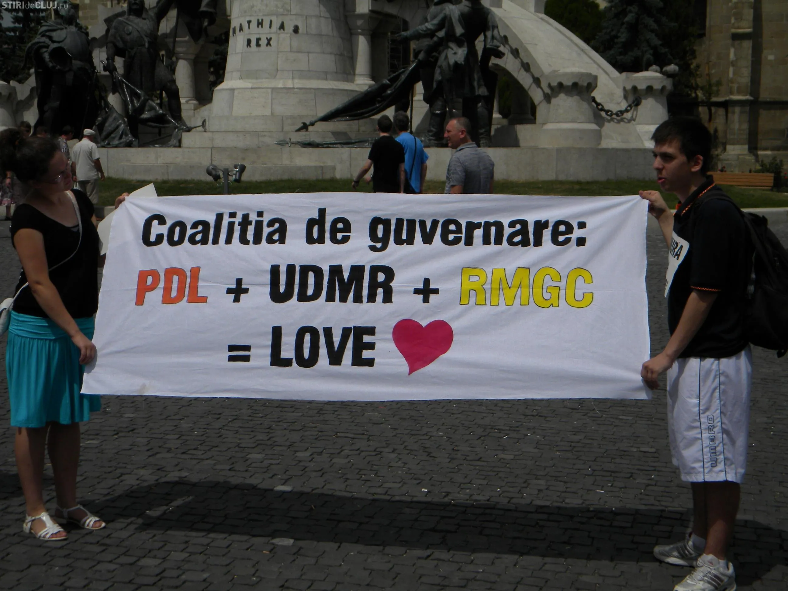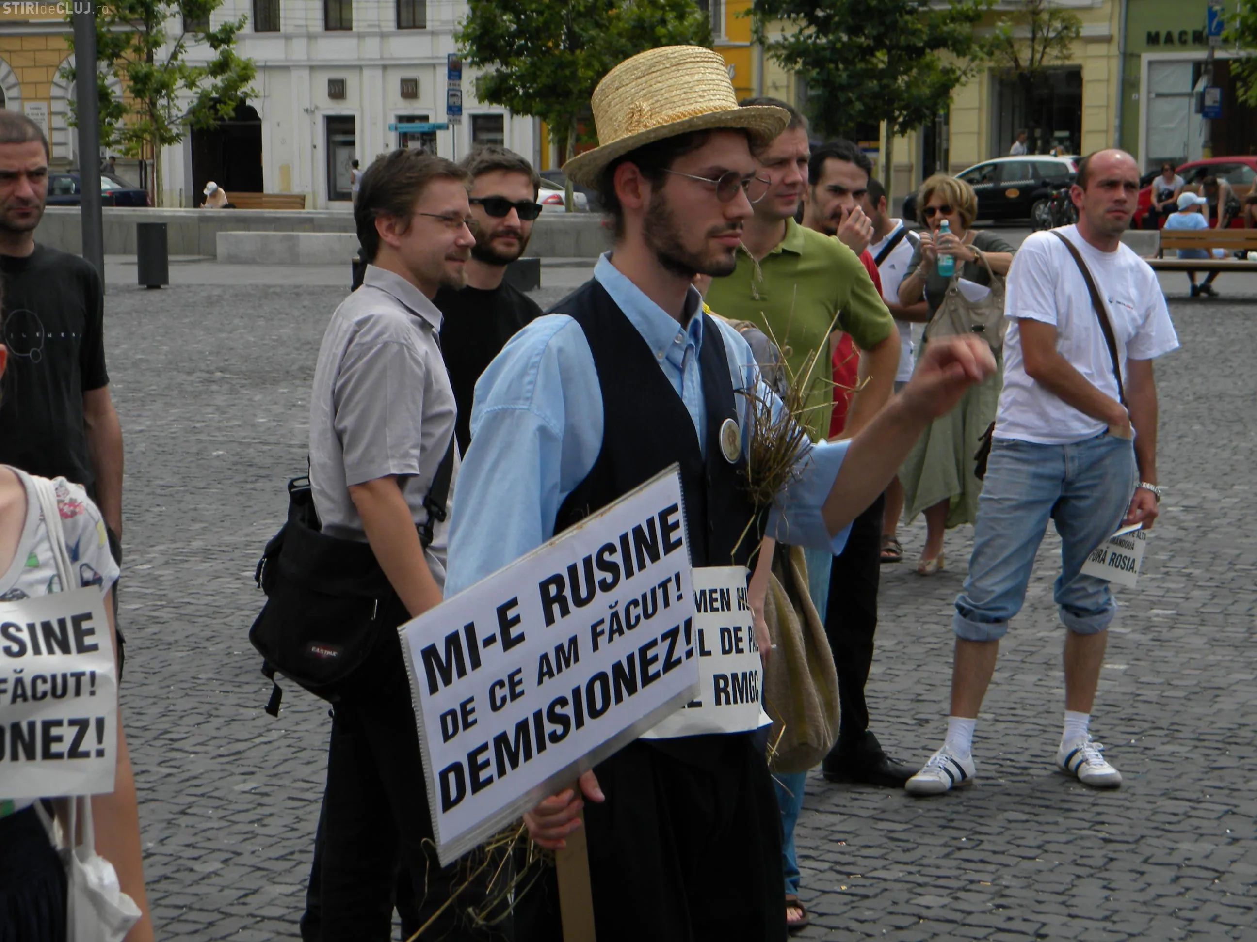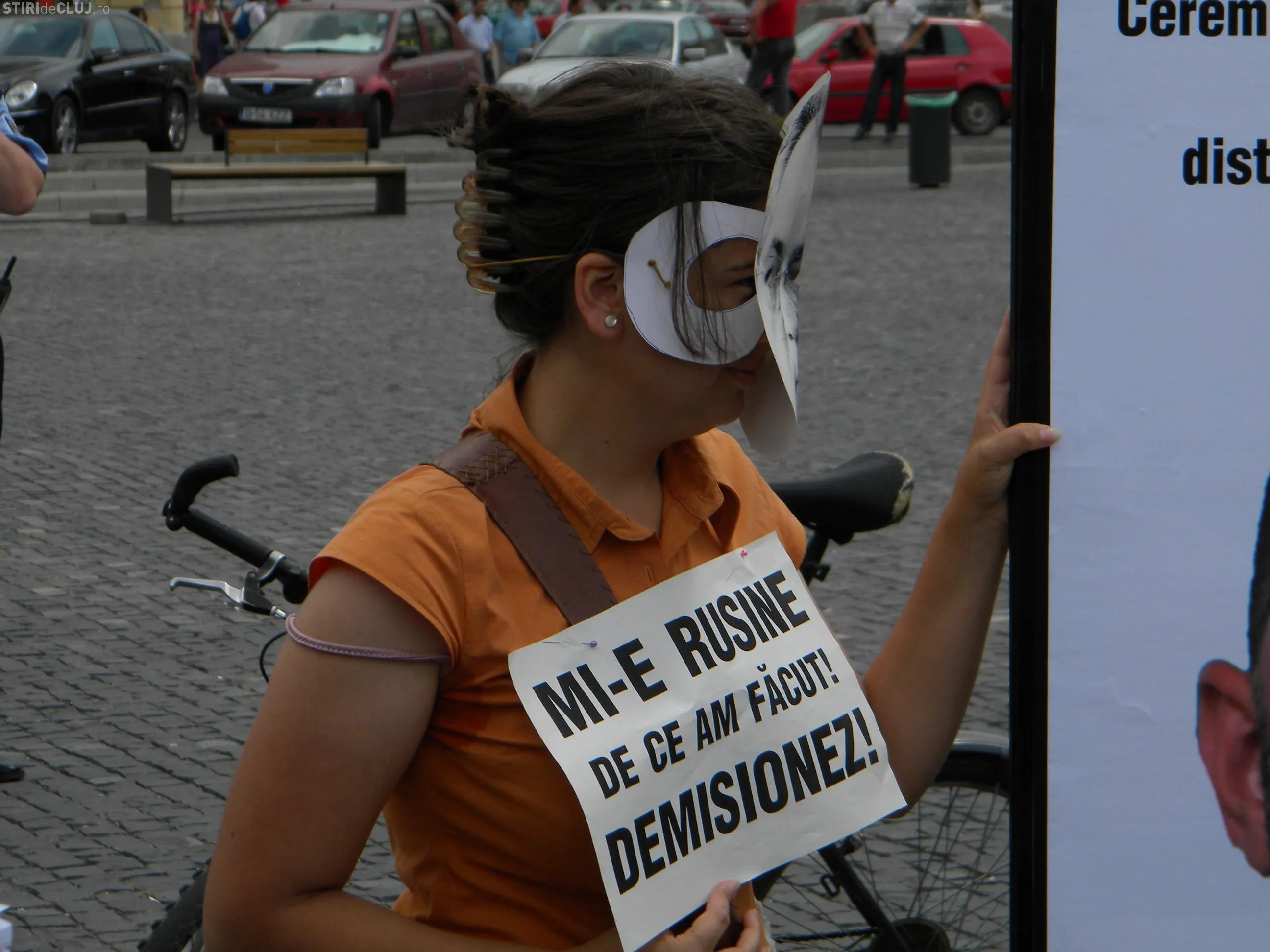 Protestatarii au purtat masti si au jucat o sceneta in care au interpretat rolul personajelor politice la care le cer demisia: Kelemen Hunor, Emil Boc, Traian Basescu, Elena Basescu si Laszlo Borbely.