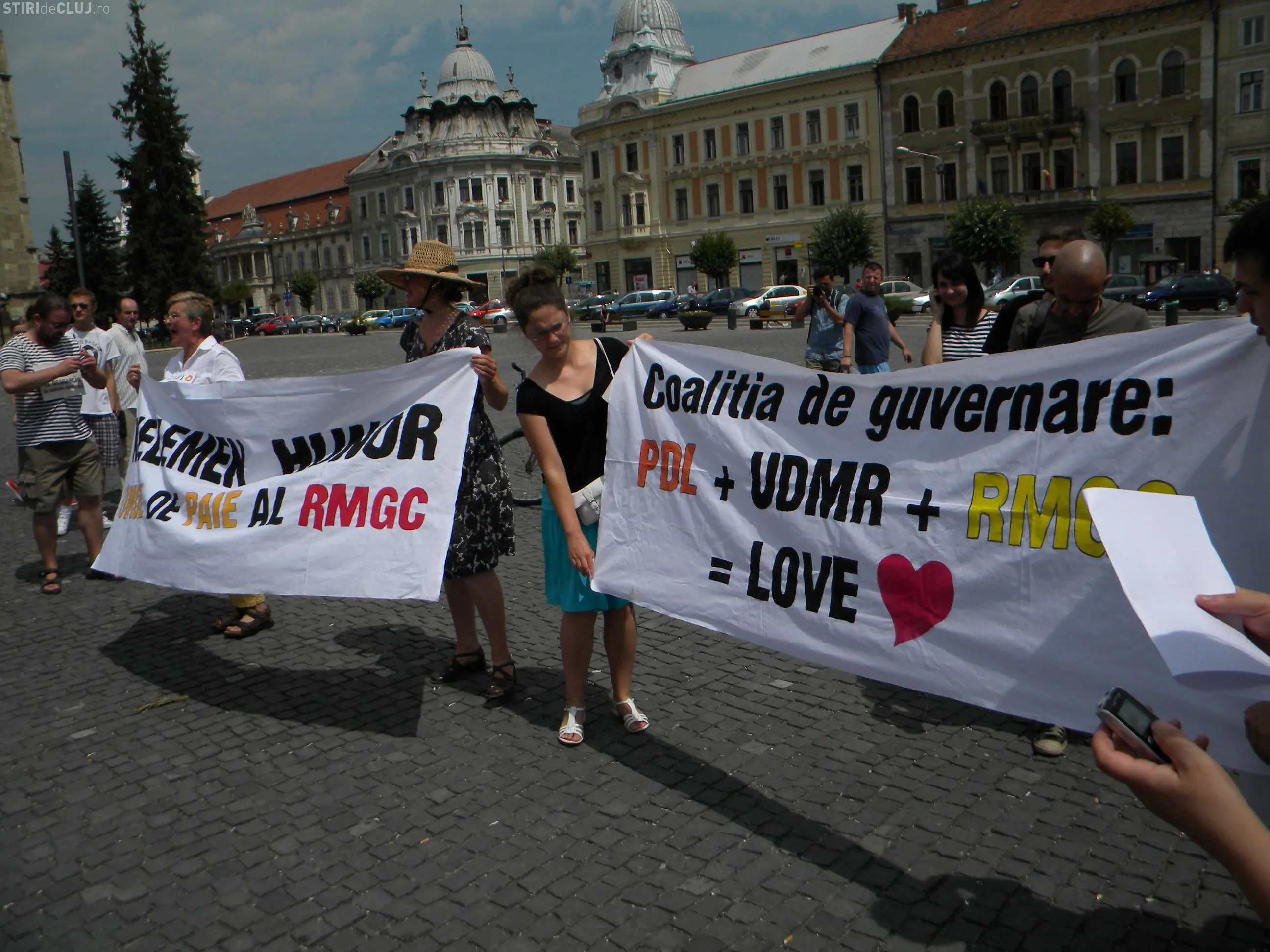 Circa 50 de militanti impotriva proiectului de la Rosia Montana au protestat, astazi, in Piata Unirii, cerand demisiile lui Kelemen Hunor, ministrul Culturii, a premierului Emil Boc si a presedintelui Traian Basescu.