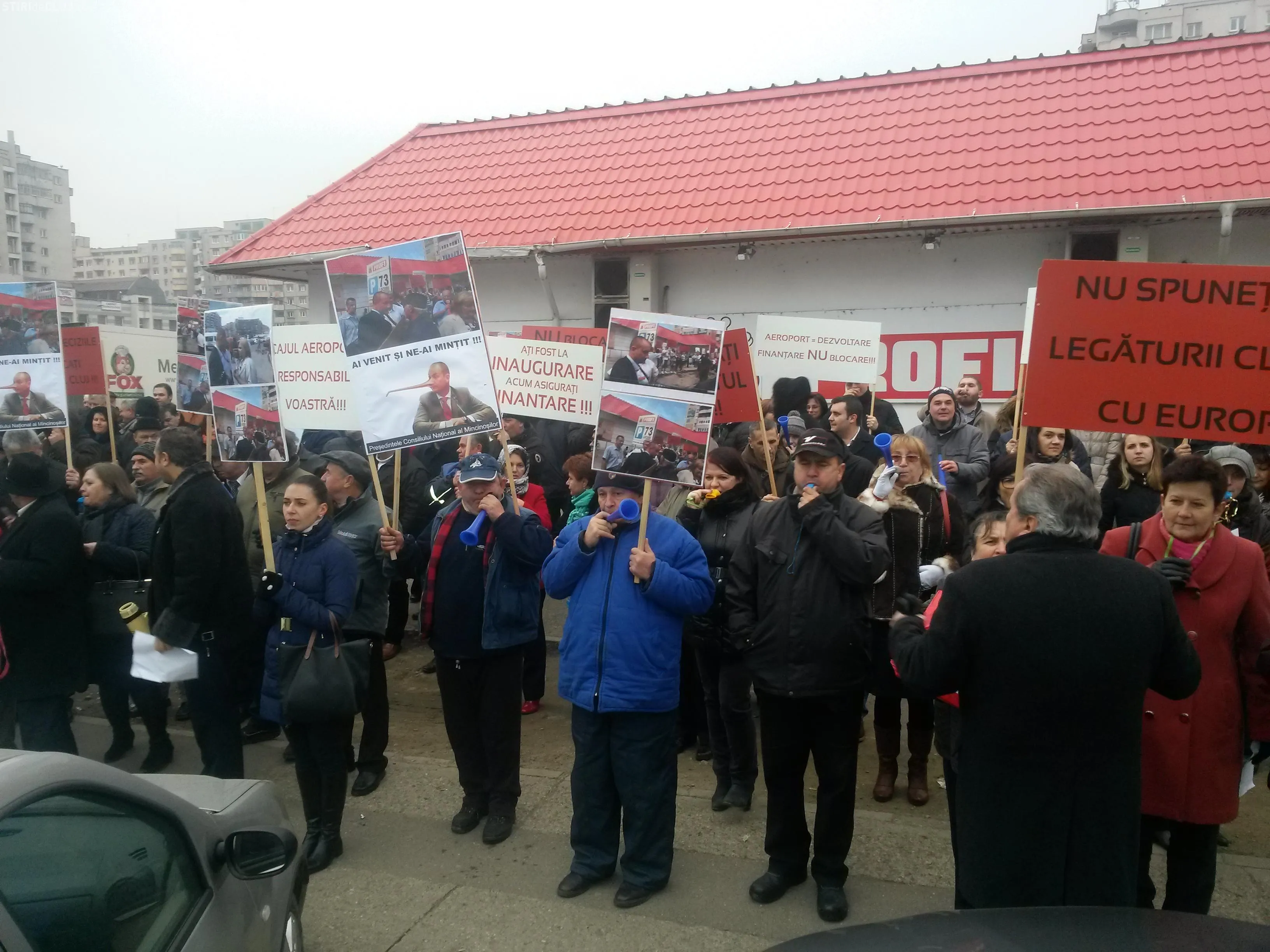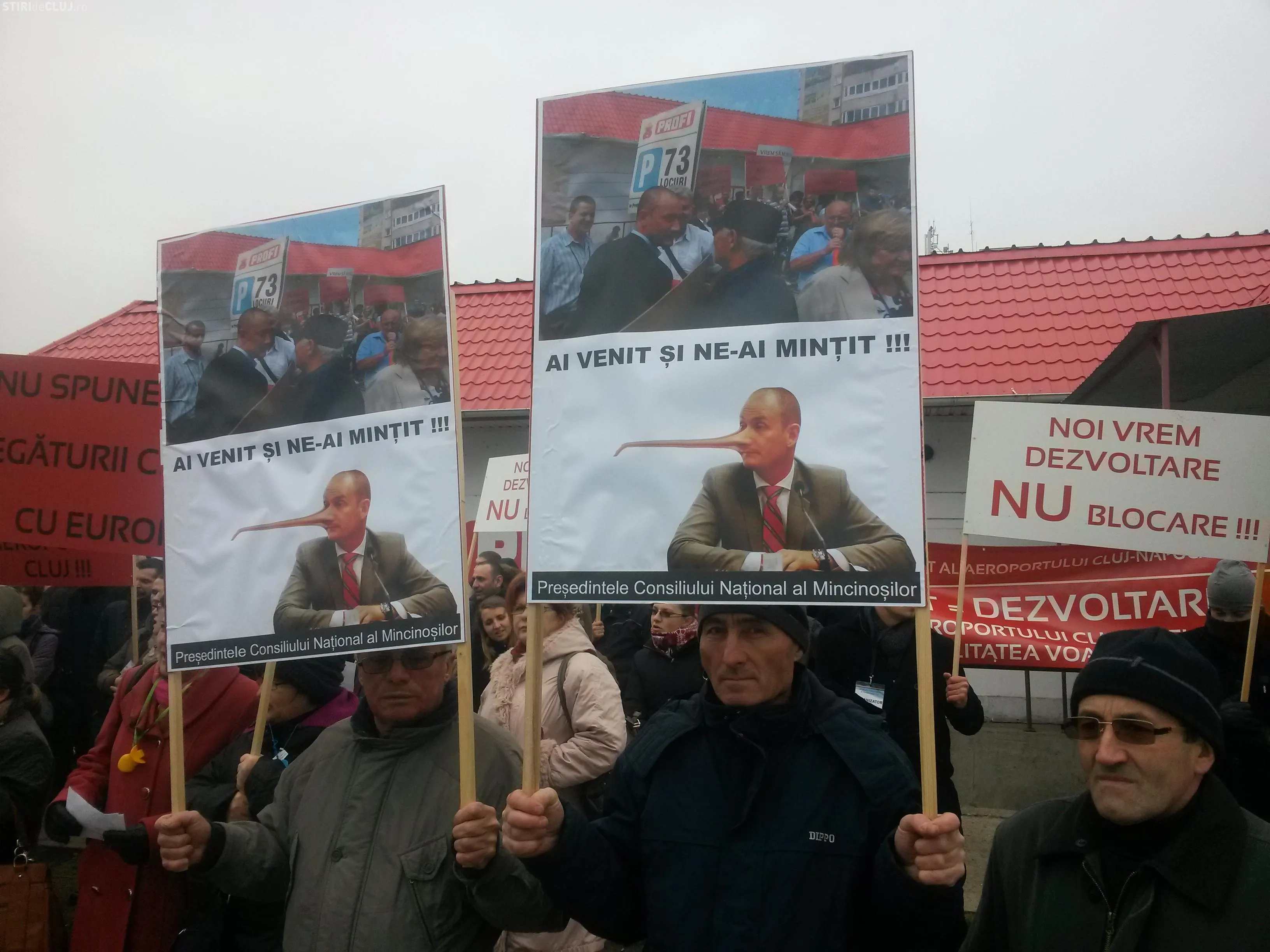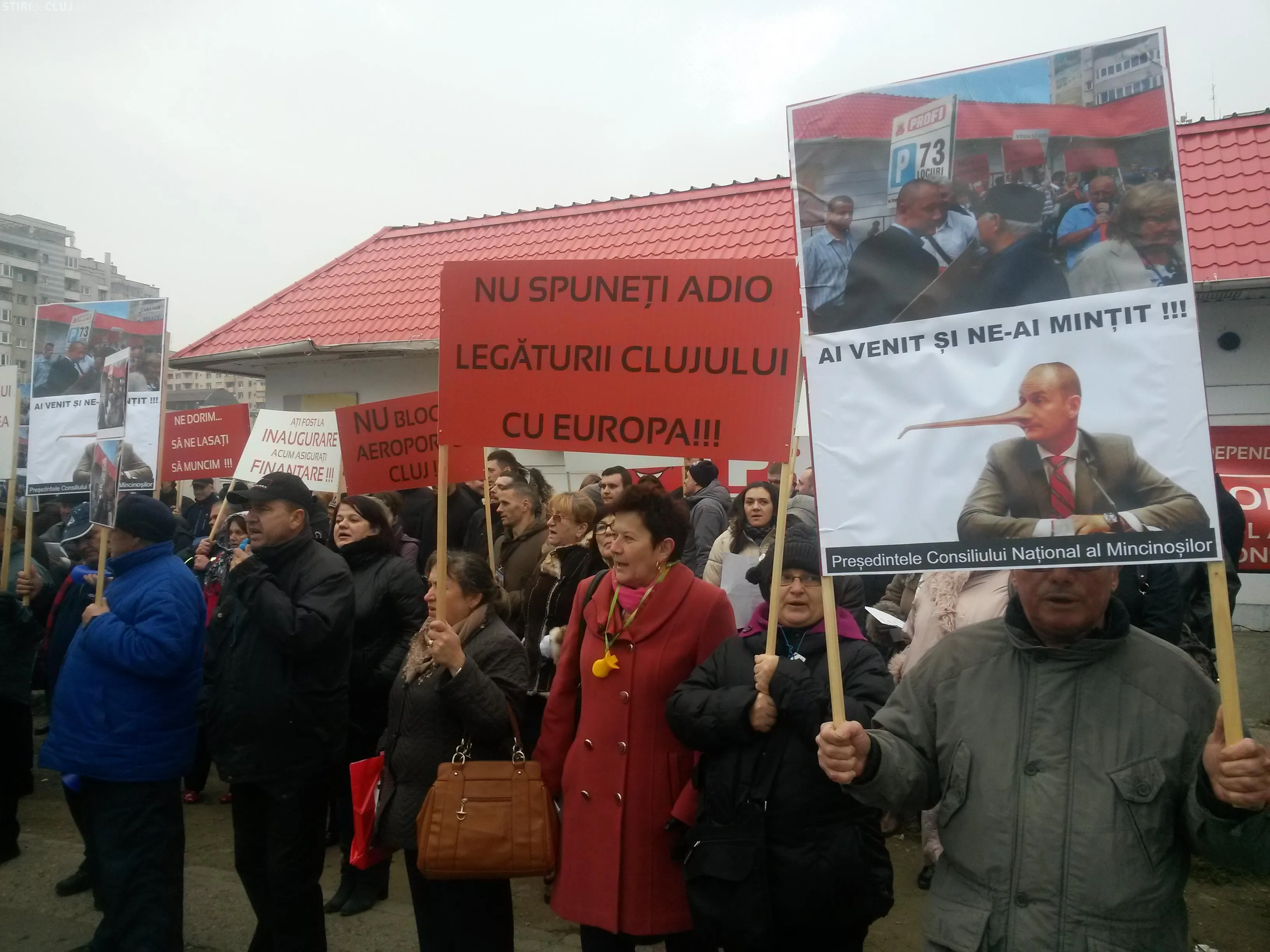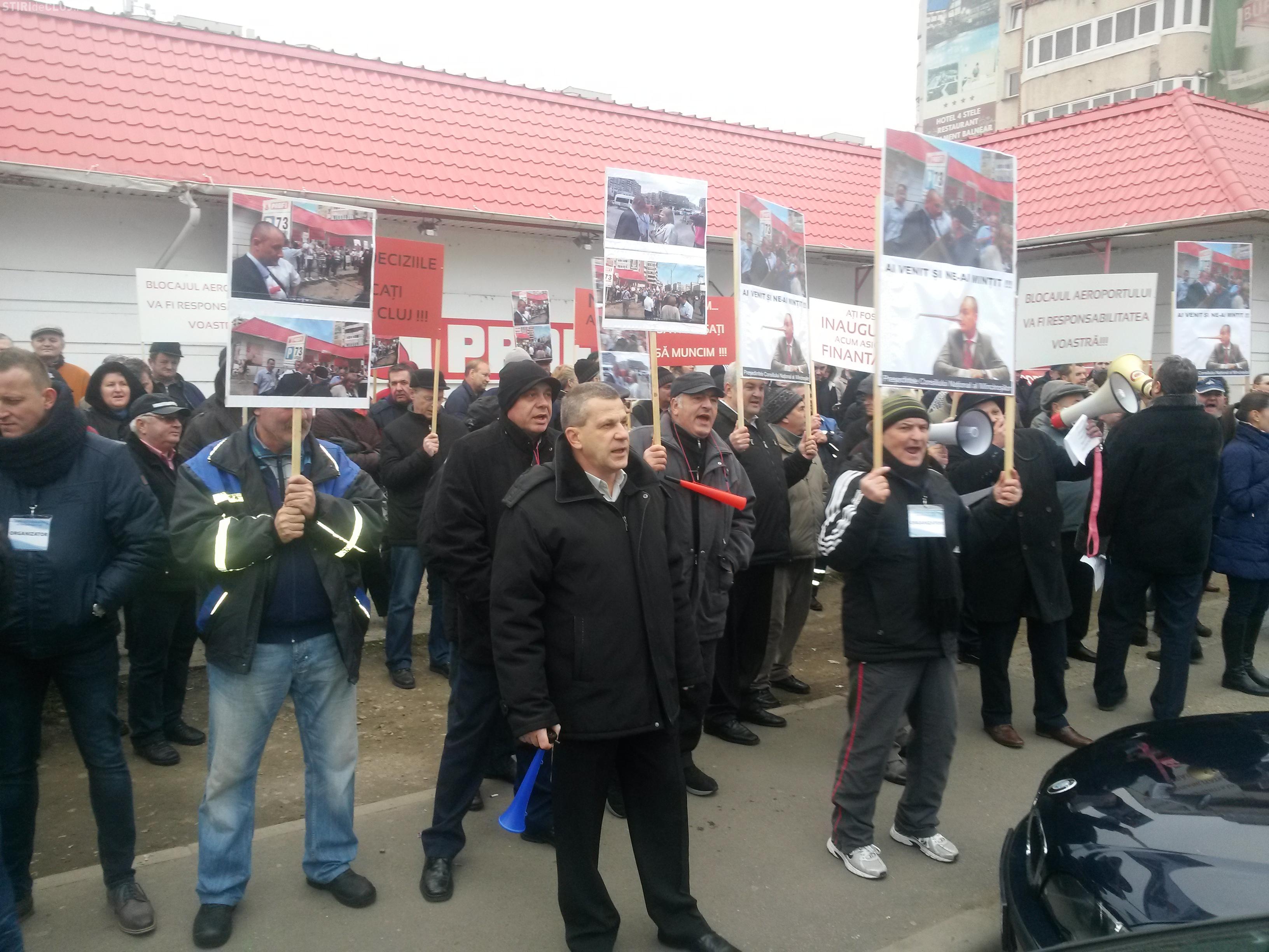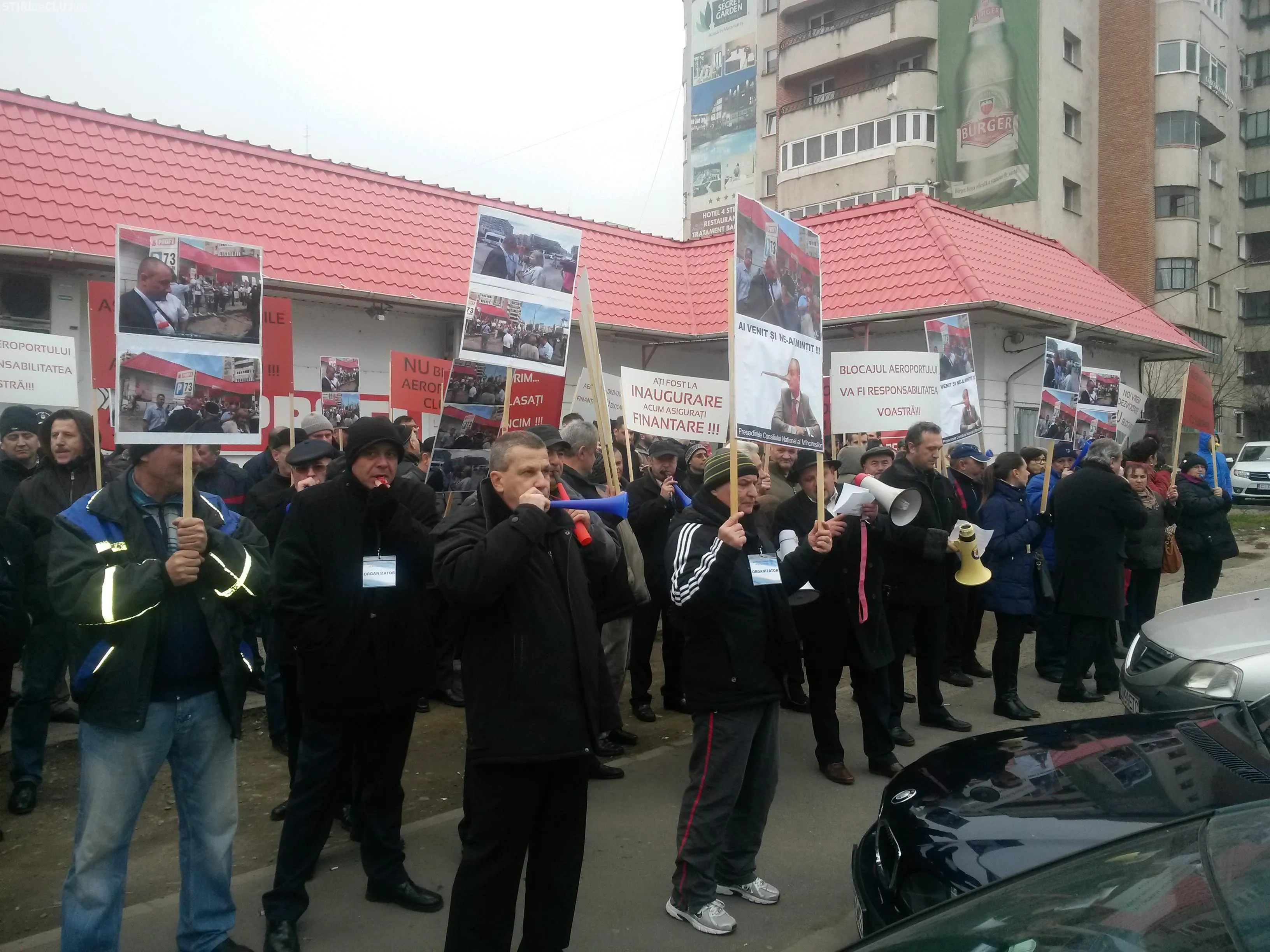 Protestatarii sunt sindicaliști de la Consiliul Județean Cluj, dar și oameni obișnuiți. Aceștia i-au reproșat lui Mihai Seplecan că i-a mințit că va sprijini Aeroportul.
