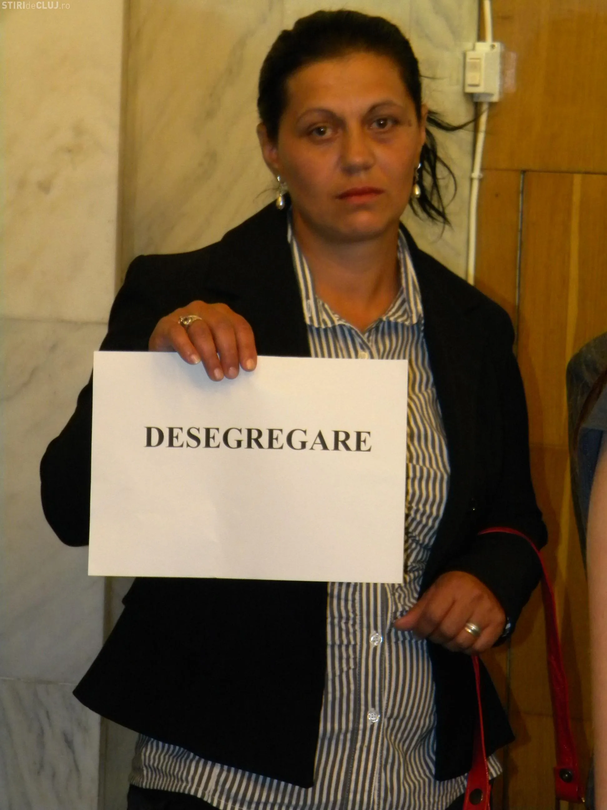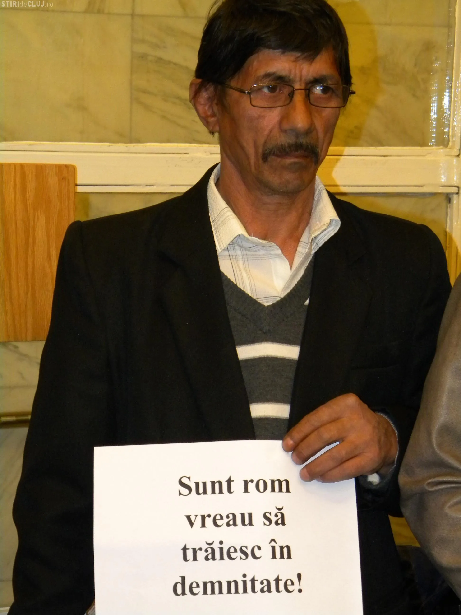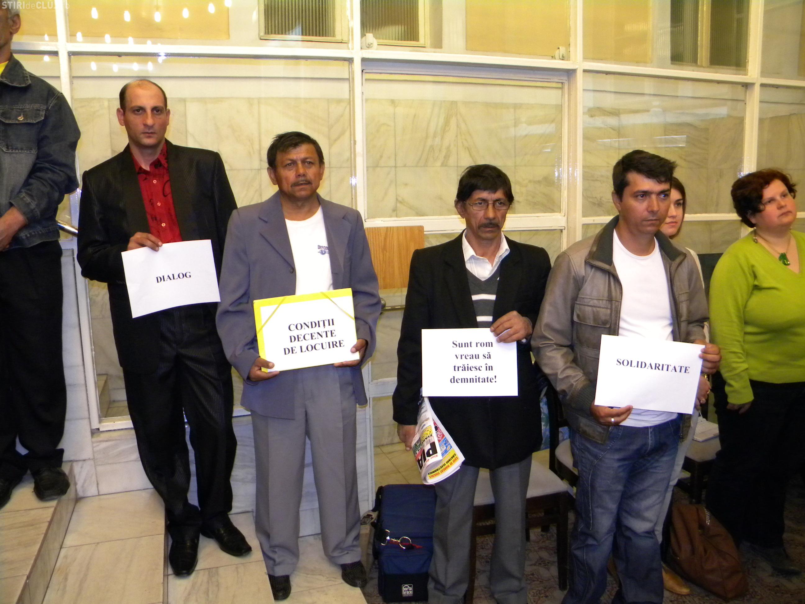 Circa 15 tigani au aparut in fata consilierilor locali cu afise pe care era scris: "Sunt rom si vreau sa traiesc in demnitate", "Solidaritate", "Conditii decente de locuire" si "Desegragare".