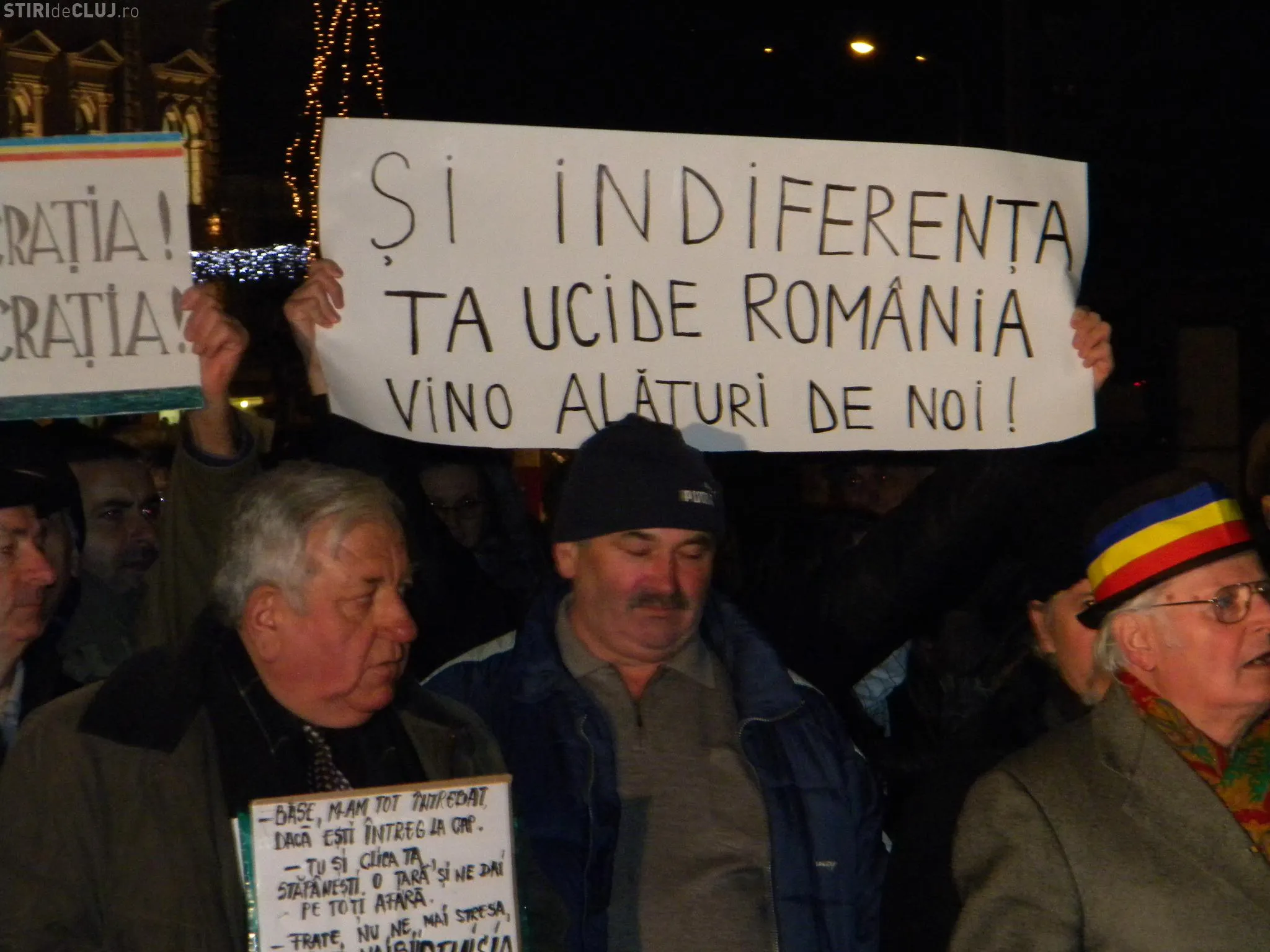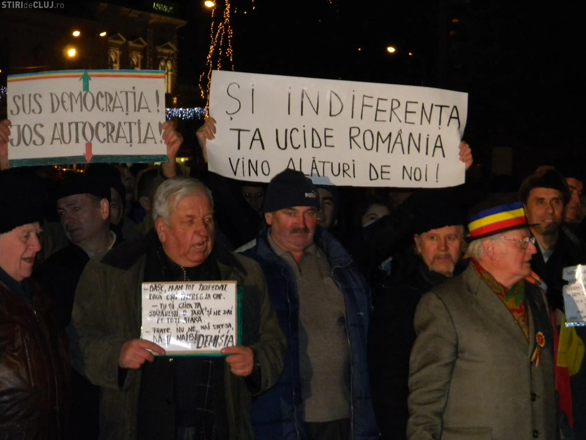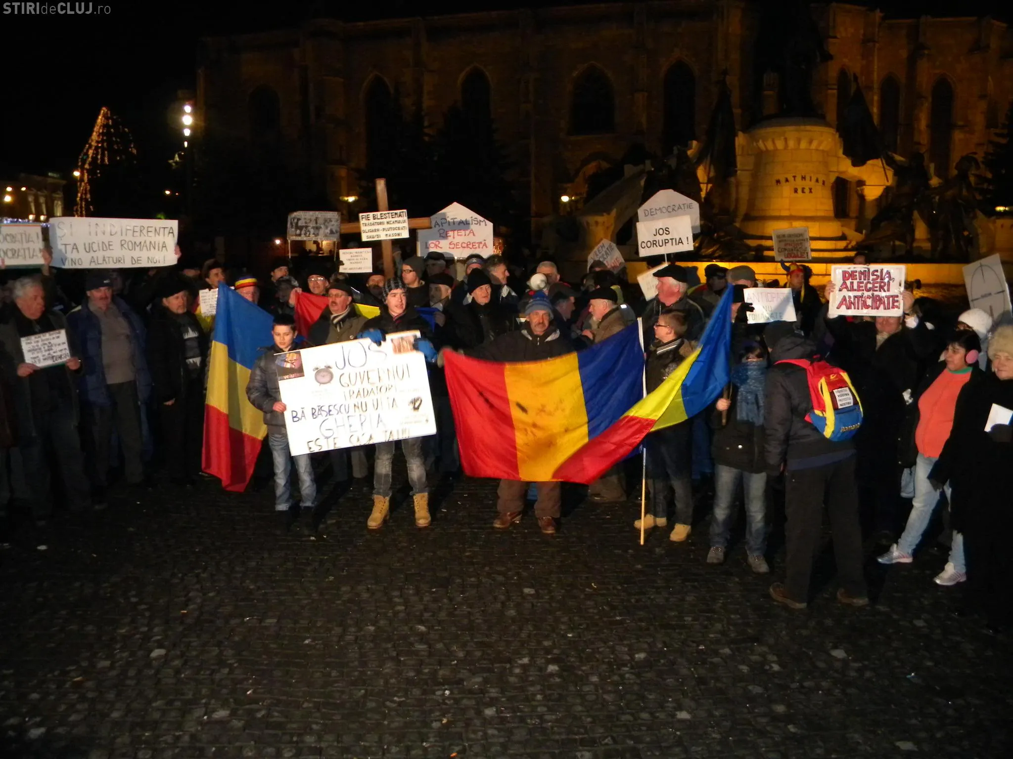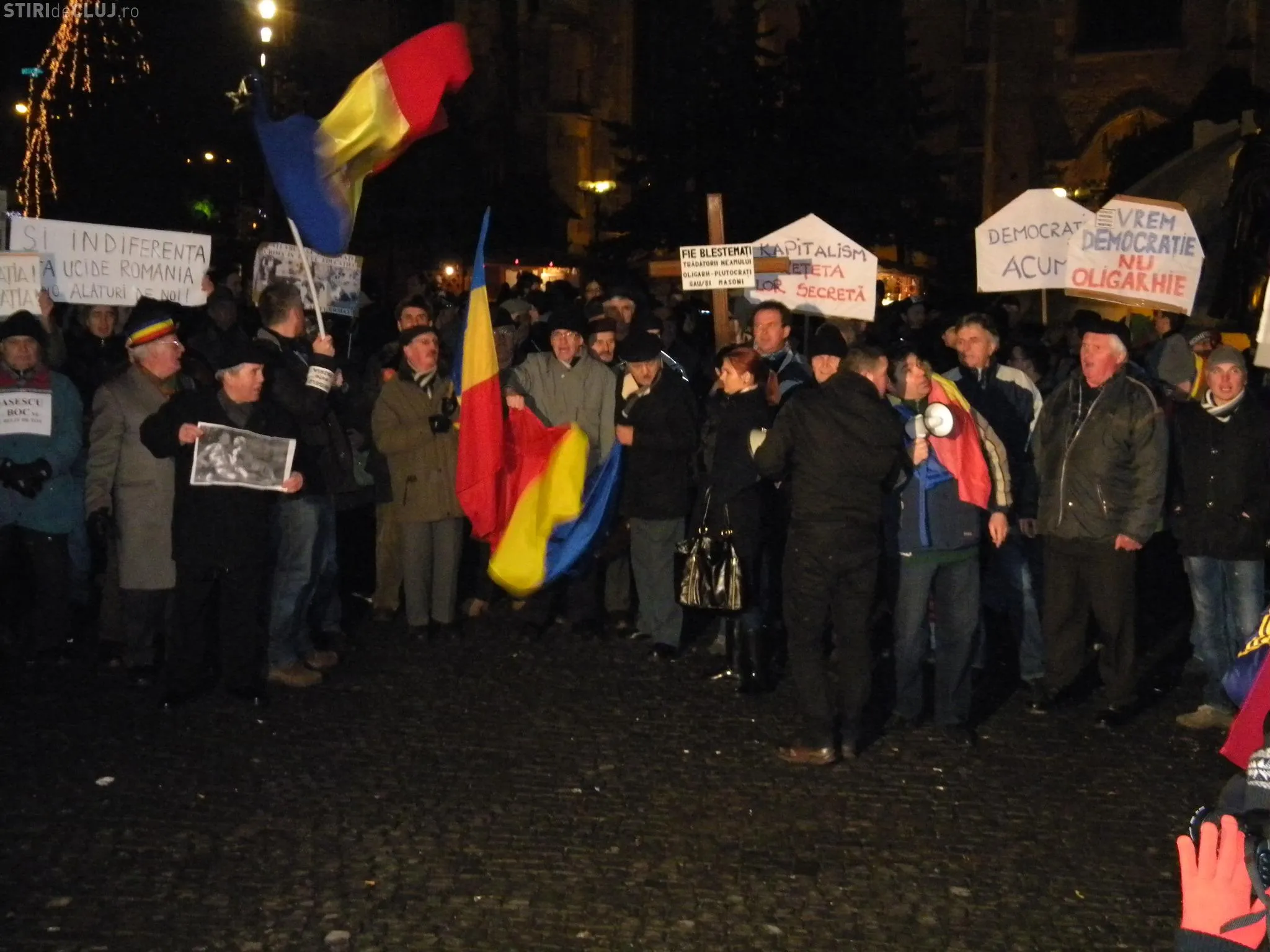 Circa 100 de clujeni s-au adunat de la ora 17.00 in Piata Unirii si protesteaza fata de presedintele Traian Basescu si Guvern.