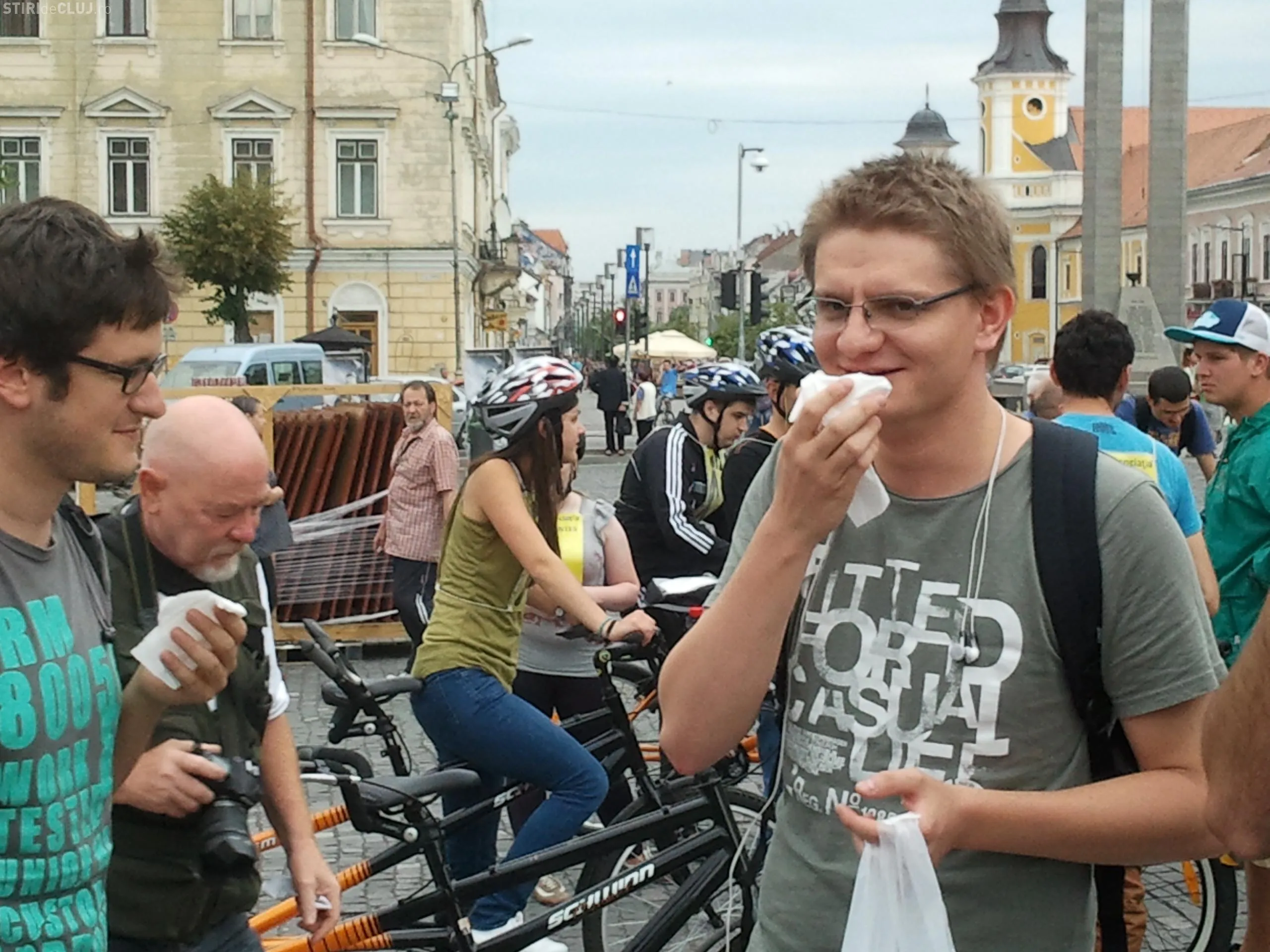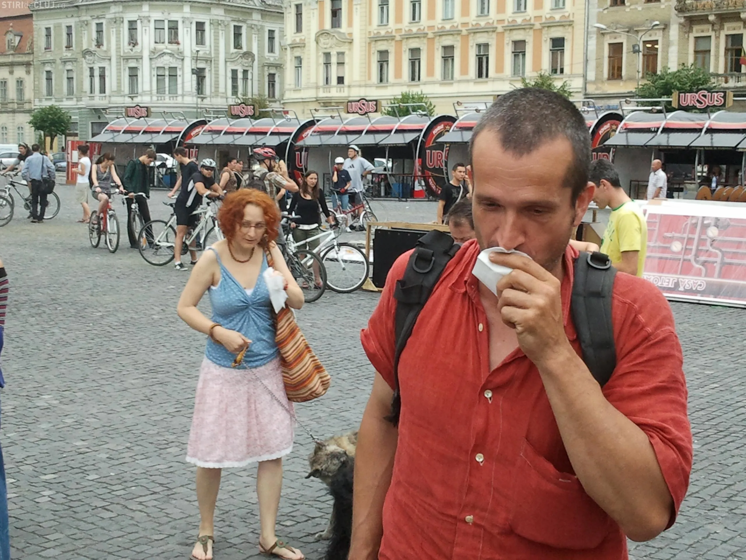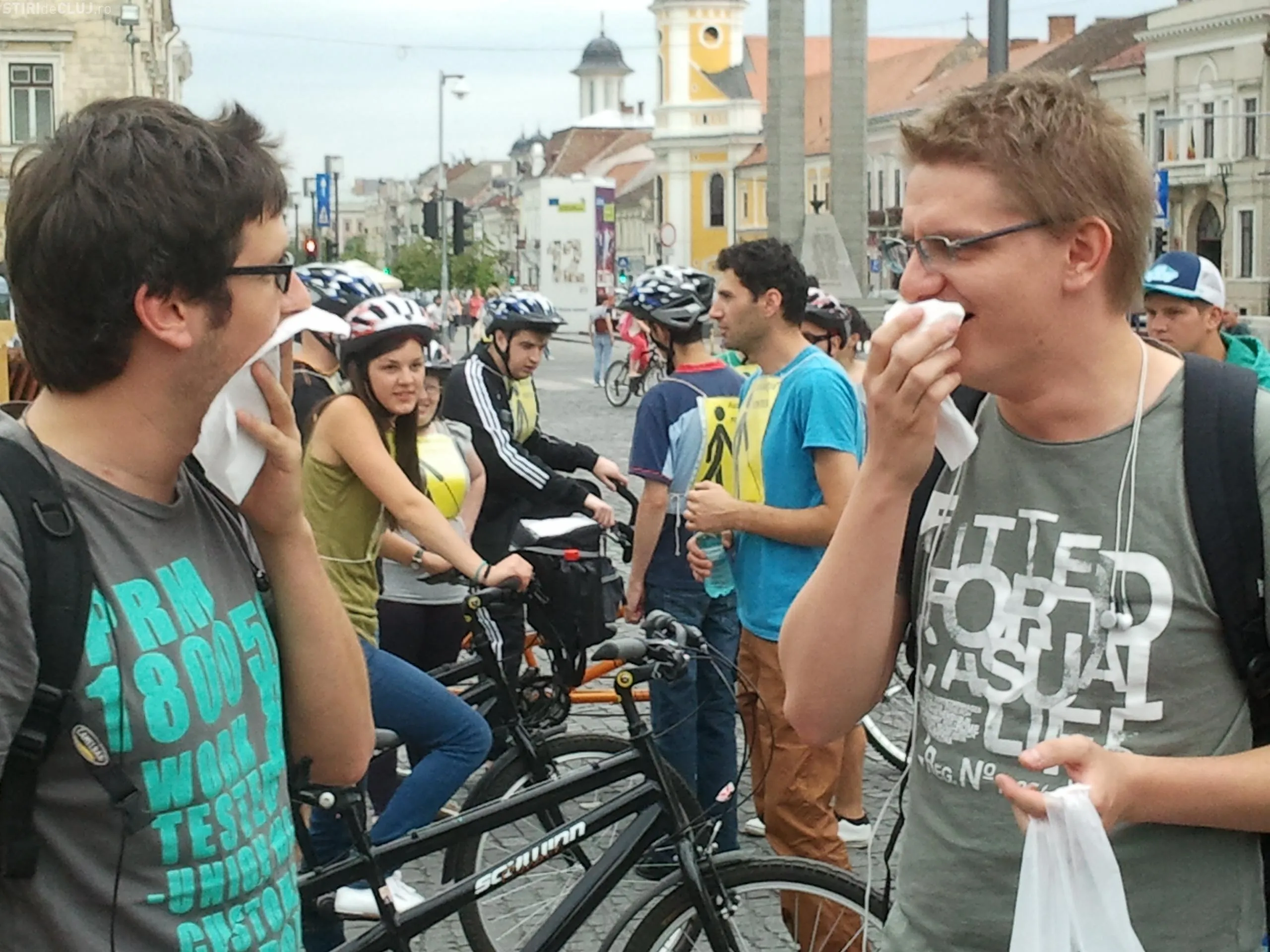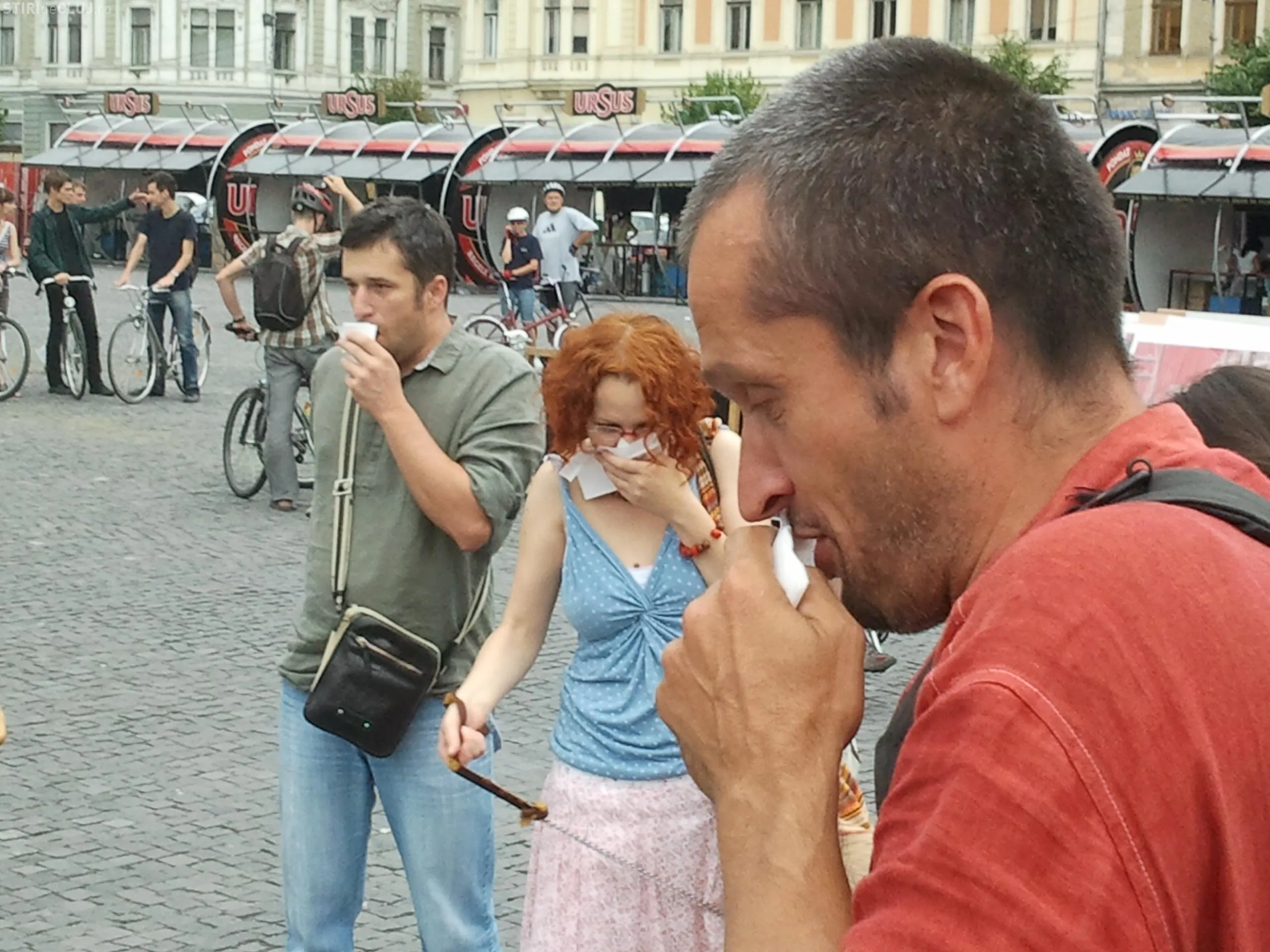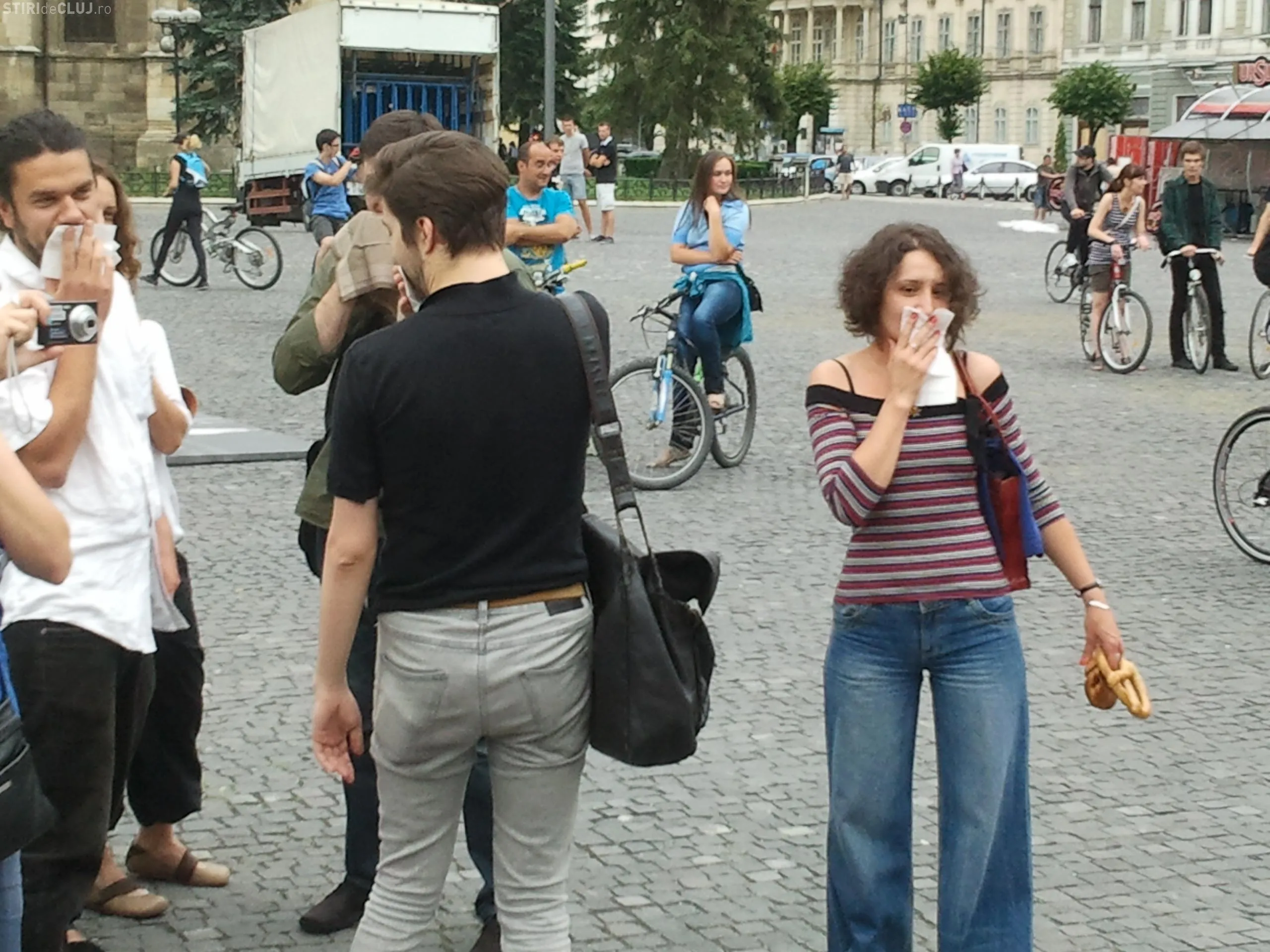 Protestatarii au avut cu eu si câte o batista. Timp de 5 minute le-au fluturat prin piata dupa care au început sa tuseasca si sa-si foloseasca batistele.
