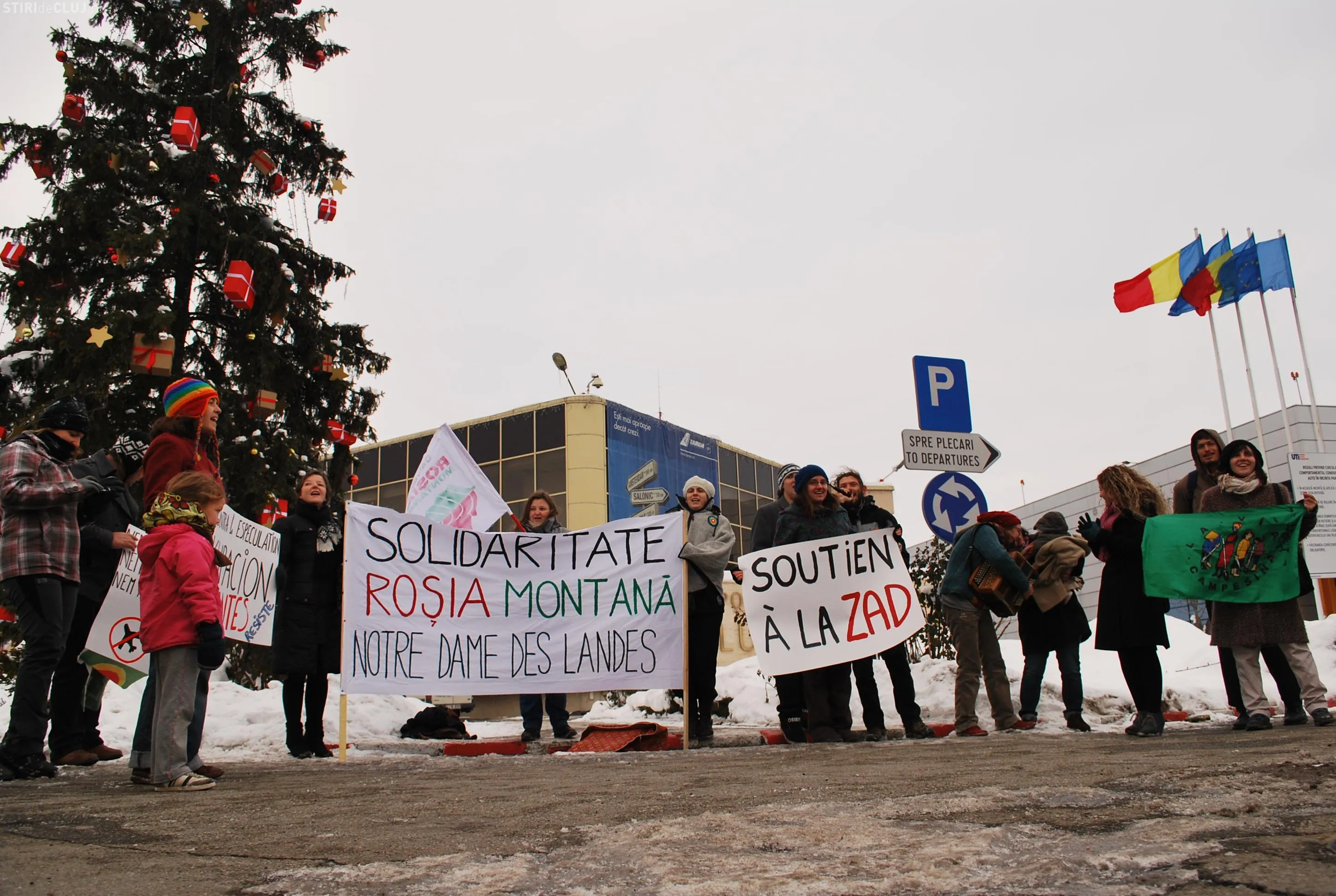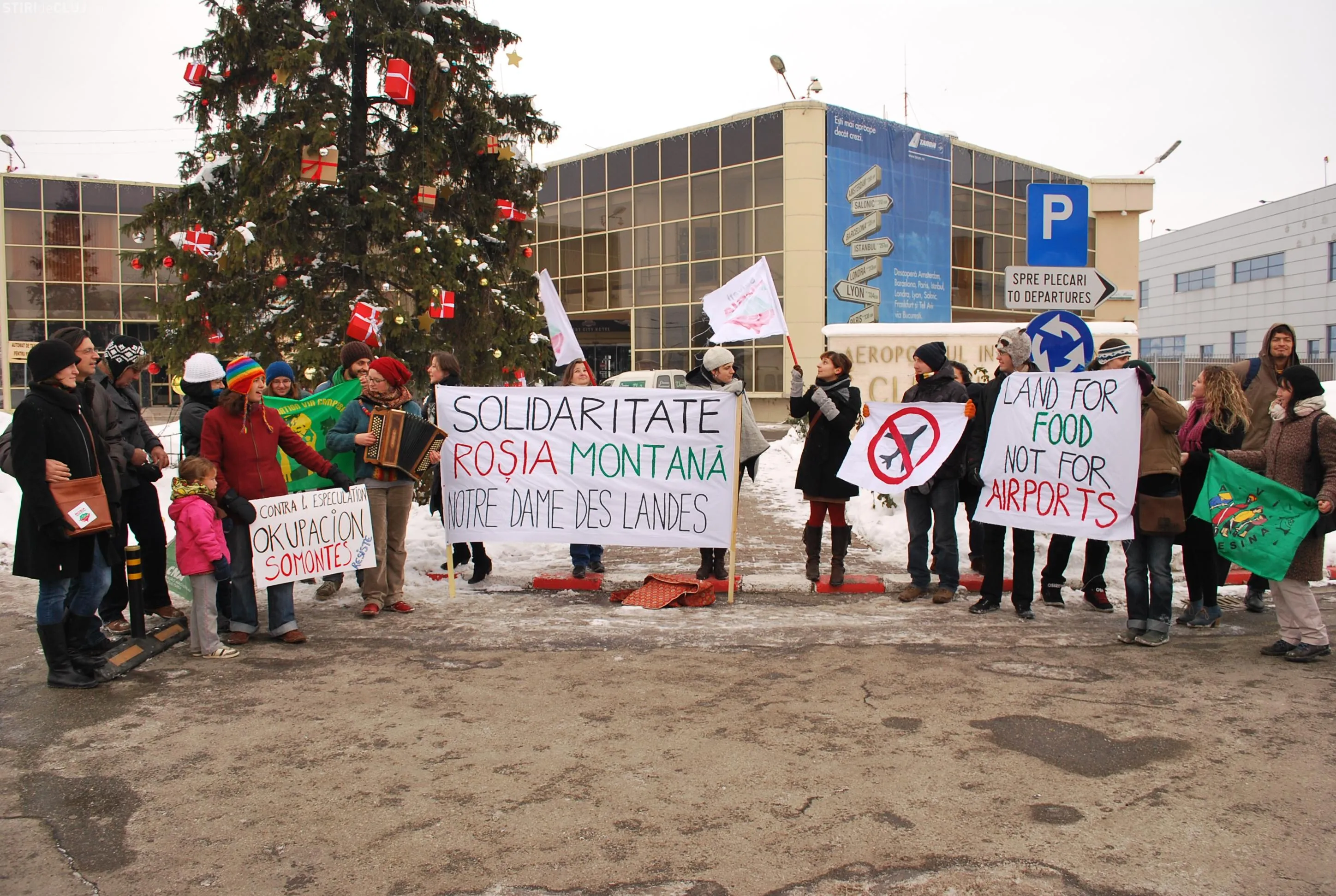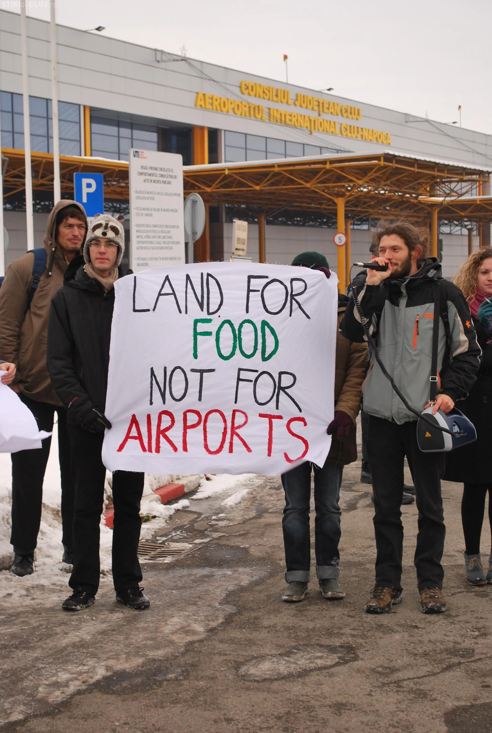 Treizeci şi cinci de activişti din mişcarea internaţională a ţăranilor Via Campesina şi Tinerii Mânioşi au protestat, vineri, 14 decembrie, în faţa Aeroportului Internaţional Cluj-Napoca.
