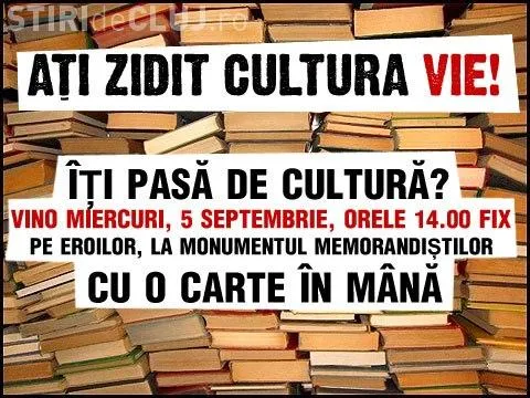 ”Ați zidit cultura vie! Îți pasă de cultură? Vino miercuri, 5 septembrie, orele 14.00, pe Eroilor, la Monumentul Memorandiștilor cu o carte în mână”, precizează organizatorii protestului.
