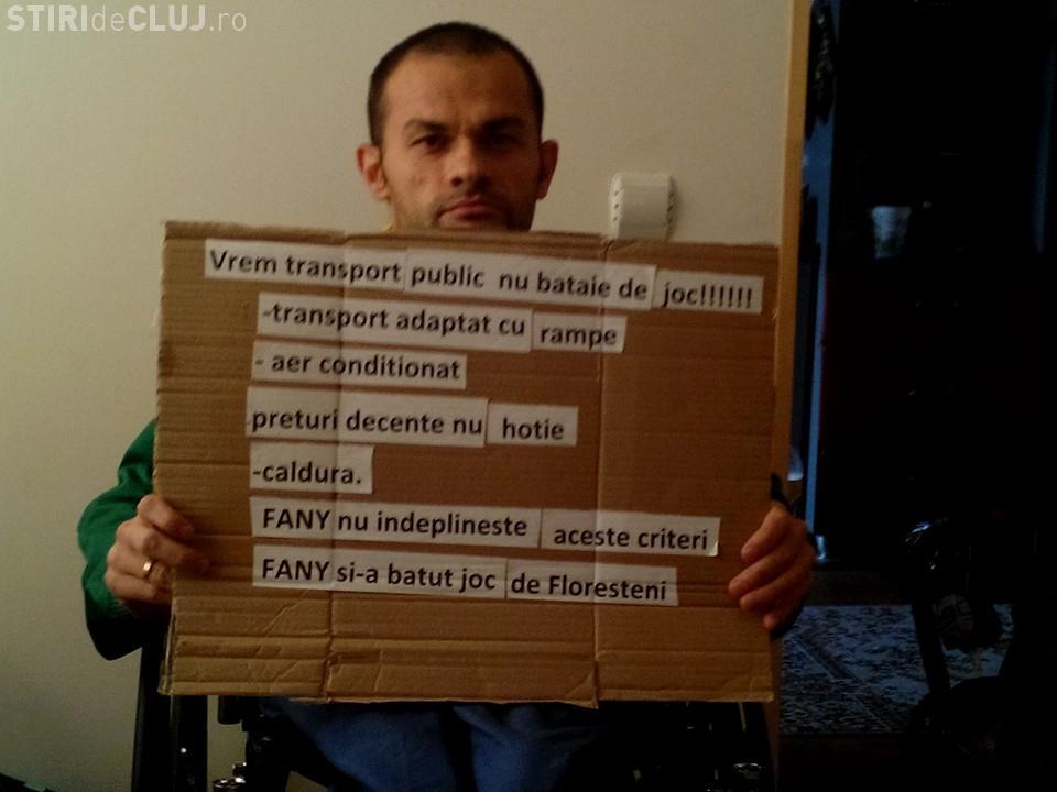 Protestului s-au alăturat și persoanele cu dizabilități, care nu pot folosi deloc autobuzele Fany. ”Vrem transport public, nu bătaie de joc!!! Transport adaptat cu rampe, aer condiționat, prețuri decente, nu hoție, căldură. Fany nu îndeplinește aceste criterii. Fany și-a bătut joc de floreșteni”, a scris Dacian Makszin, pe un banner cu care participă la protest.